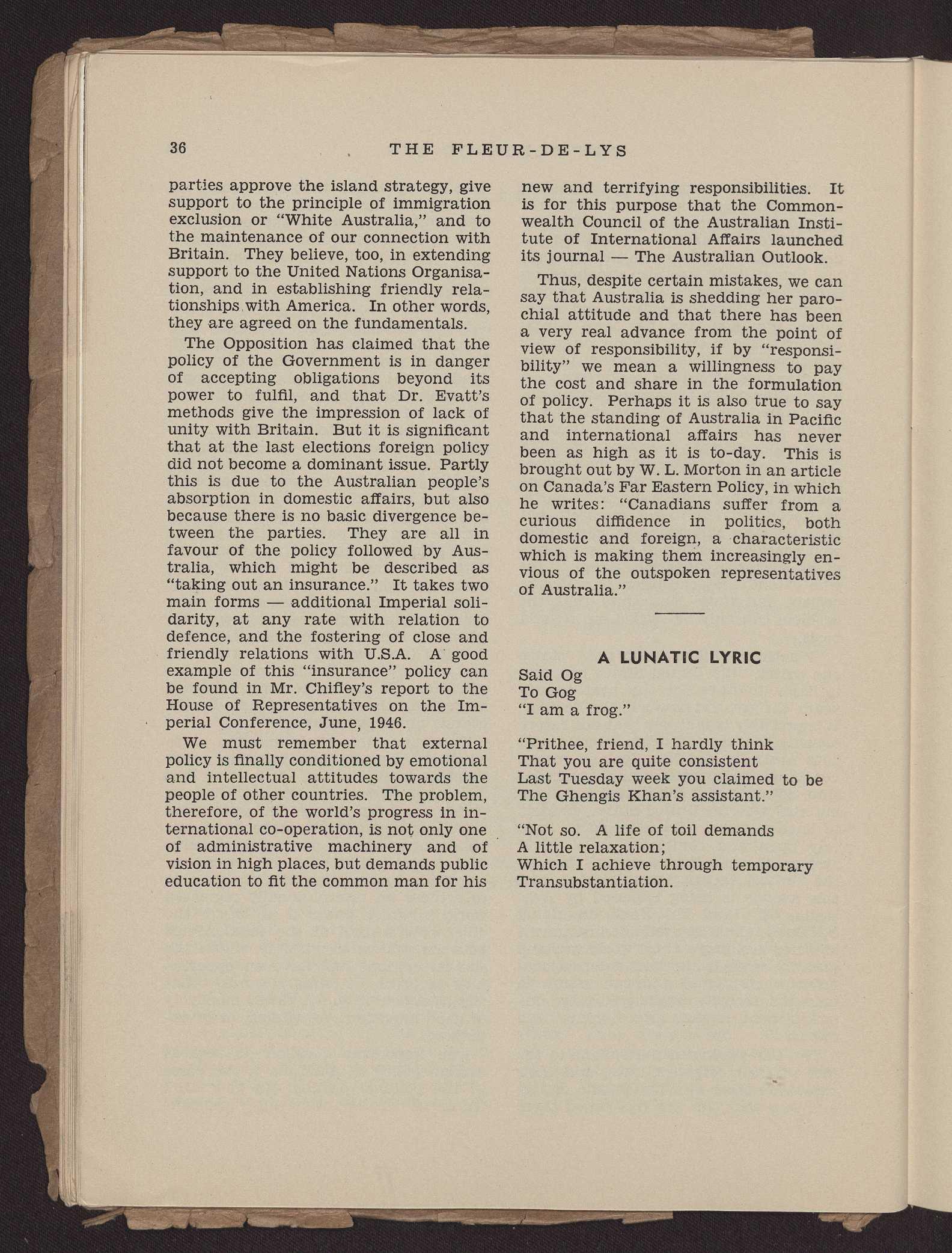 Mr. Michael Thwaites, a Victorian Rhodes Scholar, was admirably equipped to give us his "Impressions of Britain in War and Peace." His wartime service in the Royal Navy, and the time he subsequently spent at Oxford completing his course, gave him an excellent opportunity to observe the different phases in Britain's struggle.
