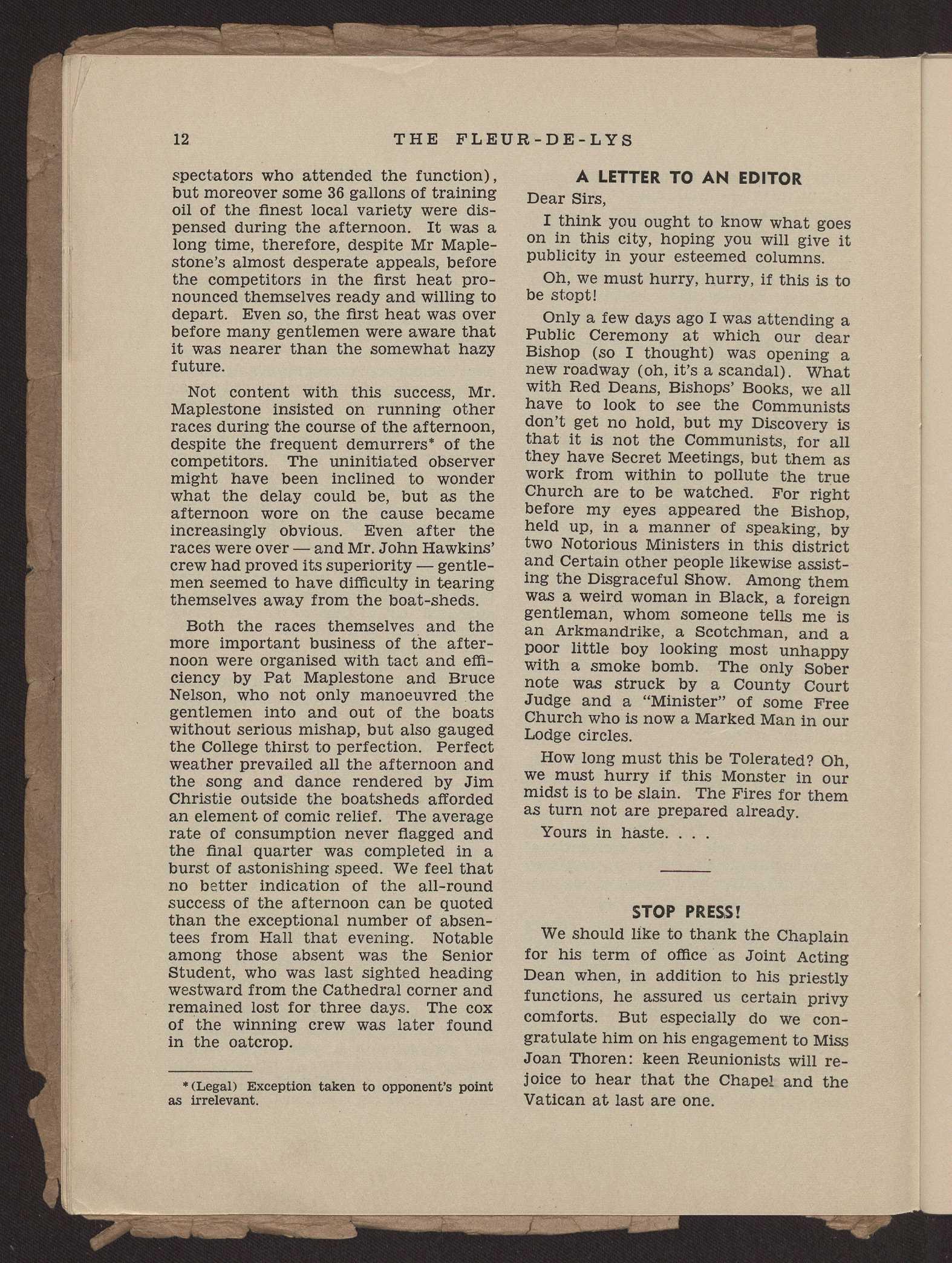To morning prayers a throng Of yawning came year long— (But numbers nowadays of course fall, With evening housefulls in the Horsfall) . Now, daily in the Chapel, Unscaly voices grapple With the latest hymnal (slightly Godified) , And the intricacies of Matins (modified) .