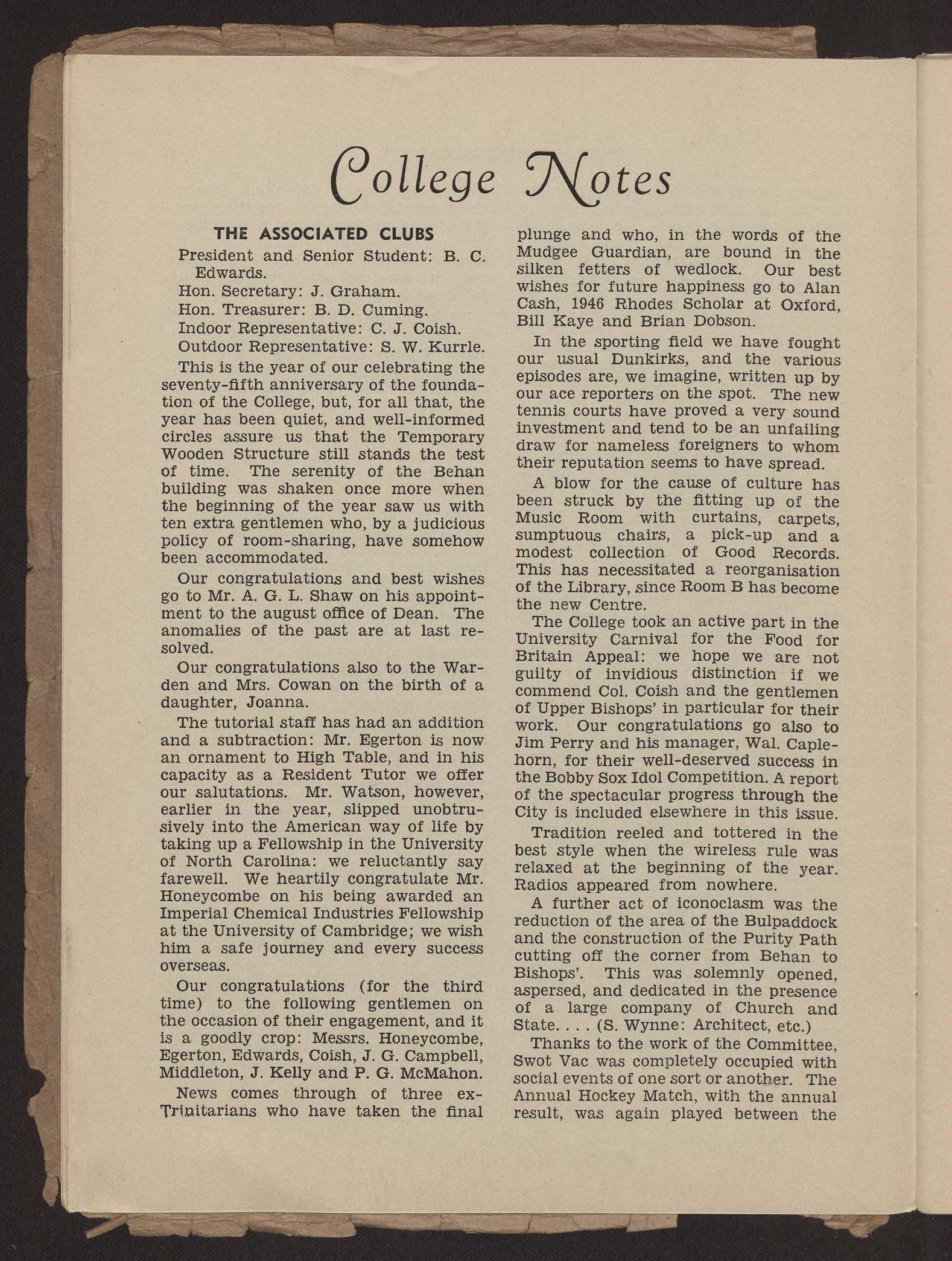 The College took an active part in the University Carnival for the Food for Britain Appeal: we hope we are not guilty of invidious distinction if we commend Col. Coish and the gentlemen of Upper Bishops' in particular for their work. Our congratulations go also to Jim Perry and his manager, Wal. Caplehorn, for their well-deserved success in the Bobby Sox Idol Competition. A report of the spectacular progress through the City is included elsewhere in this issue.