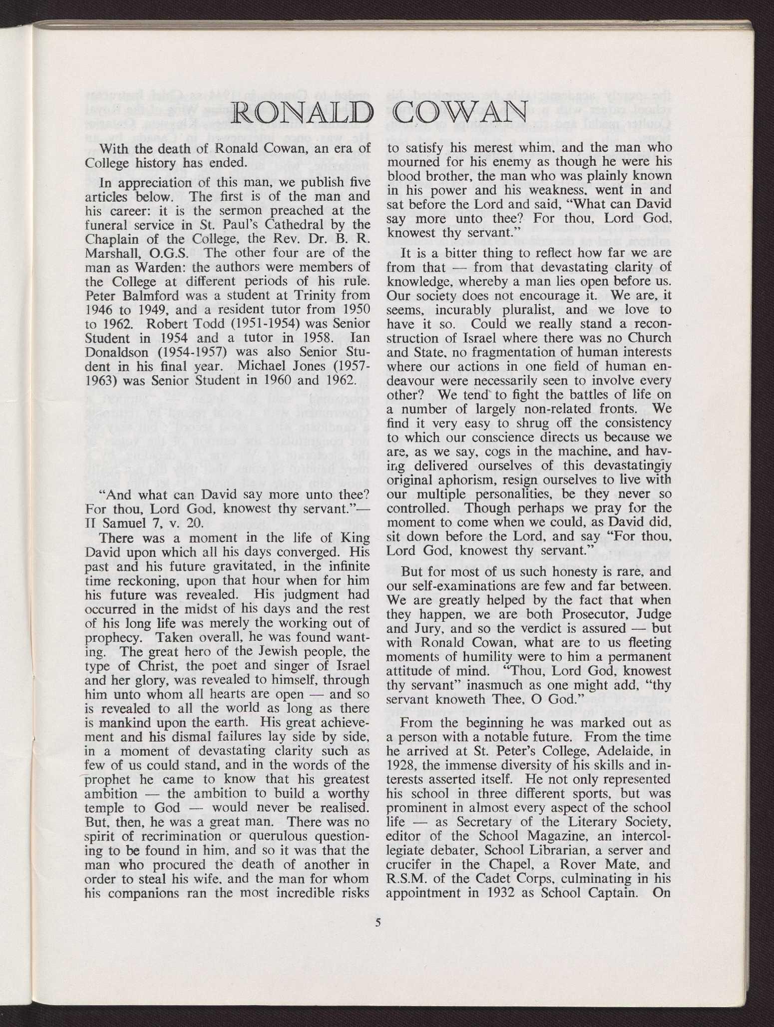 There is much talk in Christian circles these days about the witness on this or that frontier of society, but, alas, true to our pluralistic condition, we will go on trying to associate it with some specifically Christian organisation or movement. We want the real thing— Christians transforming secular society — but when we see it we hardly recognise it. It is not embodied in a report to Synod, and so it tends to lie outside our experience. Ronald Cowan was the ideal frontiersman; he combined two of the rarest gifts — wisdom and resolution. He was almost always right and he stuck to his guns whatever the personal costs. But the wondrous thing is that this sprang from and was fed by his faith in God and in His Son, Jesus Christ. His religion was undemonstrative in everything that did not matter. In matters of the greatest importance it was the reason of his existence. His regular Chapel witness alone was a silent example, but few outside College realised that he received Holy Communion three times a week with a regularity which shamed the more overtly ardent. Of his last days I shall not speak, except to say that to the end his faith was unwavering; and let it be clearly said that if anything gives meaning to this extraordinary life, it is the faith of the man himself and his clear and unequivocal response to the task to which our Lord Himself had called him and to which, in the strength of God, he gave himself without reserve.