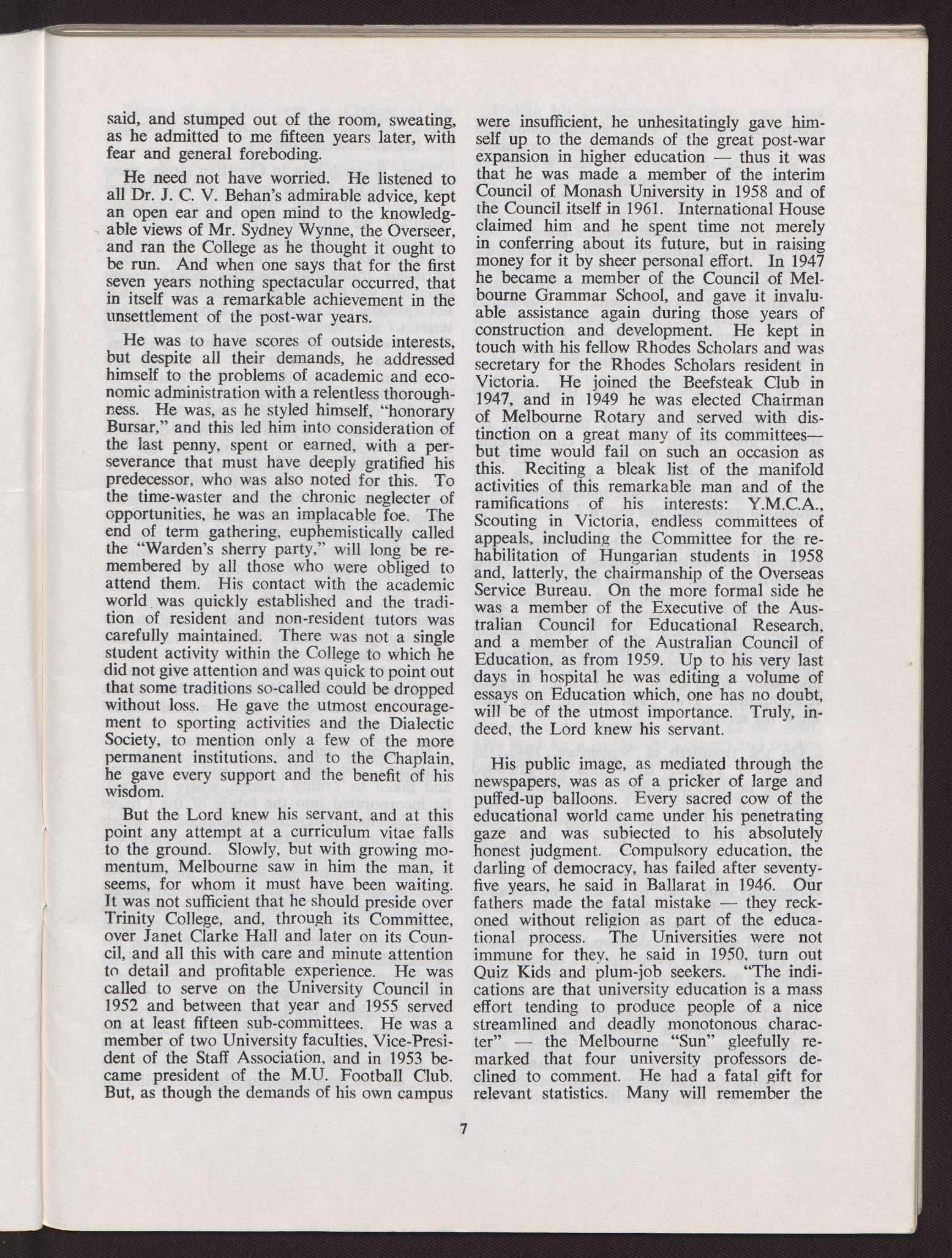were insufficient, he unhesitatingly gave himself up to the demands of the great post-war expansion in higher education — thus it was that he was made a member of the interim Council of Monash University in 1958 and of the Council itself in 1961. International House claimed him and he spent time not merely in conferring about its future, but in raising money for it by sheer personal effort. In 1947 he became a member of the Council of Melbourne Grammar School, and gave it invaluable assistance again during those years of construction and development. He kept in touch with his fellow Rhodes Scholars and was secretary for the Rhodes Scholars resident in Victoria. He joined the Beefsteak Club in 1947, and in 1949 he was elected Chairman of Melbourne Rotary and served with distinction on a great many of its committees— but time would fail on such an occasion as this. Reciting a bleak list of the manifold activities of this remarkable man and of the ramifications of his interests: Y.M.C.A., Scouting in Victoria, endless committees of appeals, including the Committee for the rehabilitation of Hungarian students in 1958 and, latterly, the chairmanship of the Overseas Service Bureau. On the more formal side he was a member of the Executive of the Australian Council for Educational Research, and a member of the Australian Council of Education, as from 1959. Up to his very last days in hospital he was editing a volume of essays on Education which, one has no doubt, will be of the utmost importance. Truly, indeed, the Lord knew his servant.