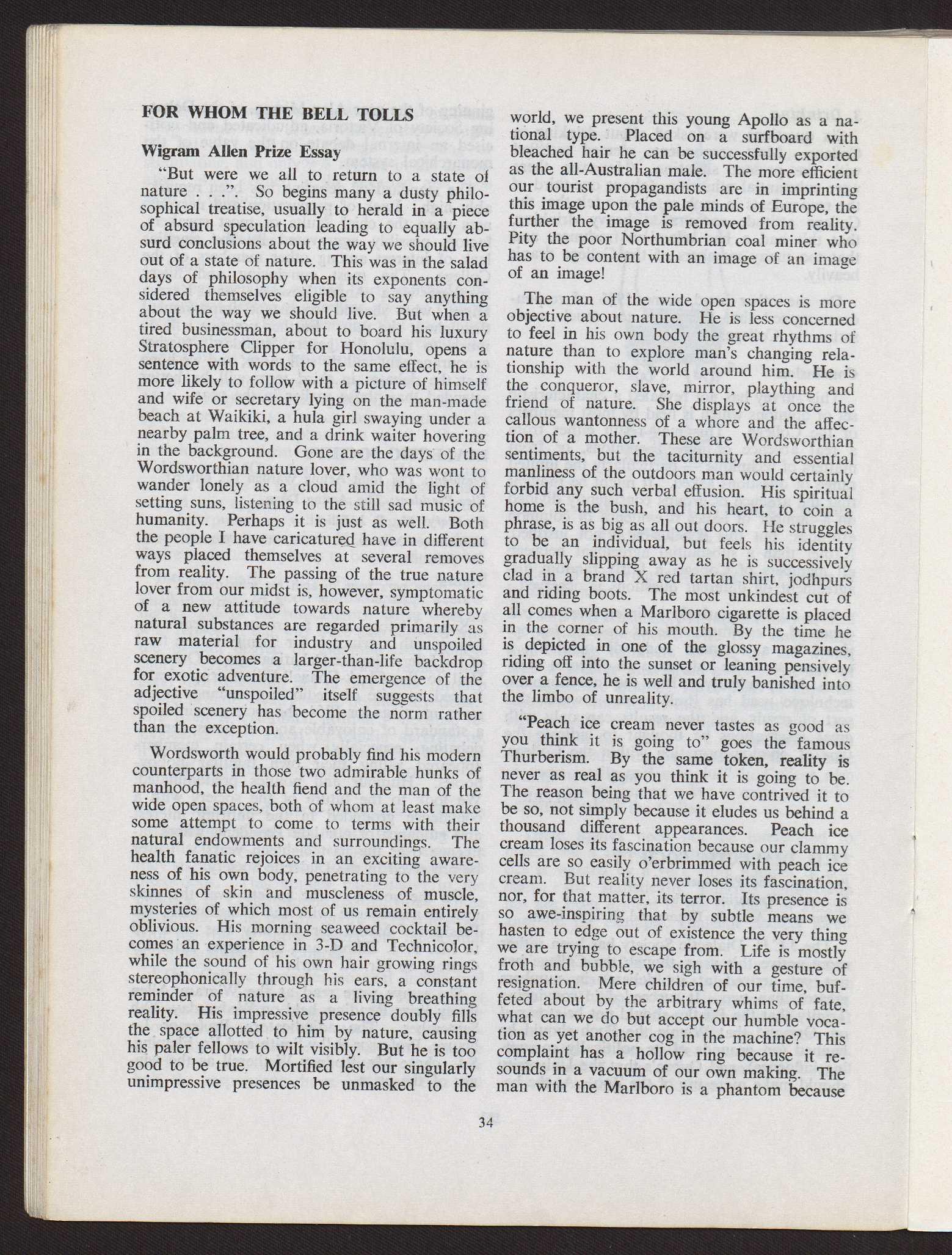 An optimistic estimate is that one-quarter of the Australian working force derive satisfaction from their jobs. The rest spent twothirds of their awakened hours in resigned boredom. Presumably, we, who are going to become professionals and academics, will be prepared to work hard in return for intellectual stimulation, responsibility and large salaries. But what of those employees whose greatest intellectual stimulation at the office is the "Sun" crossword (illicitly enjoyed)?: whose only responsibility is punctuality in serving the specified eight hours between the regulated times?: whose salaries and meagre annual leave give thin coating to the distasteful pill? What level of personal contact can one expect from a man who, after a full day of fatiguing and uninteresting work, is only too thankful to sink into a comfortable chair and absorb TV? It is a remarkably short-sighted community in which organisations merely strive to satisfy the demands of people in the few hours per day in which they are not working for these very organisations.