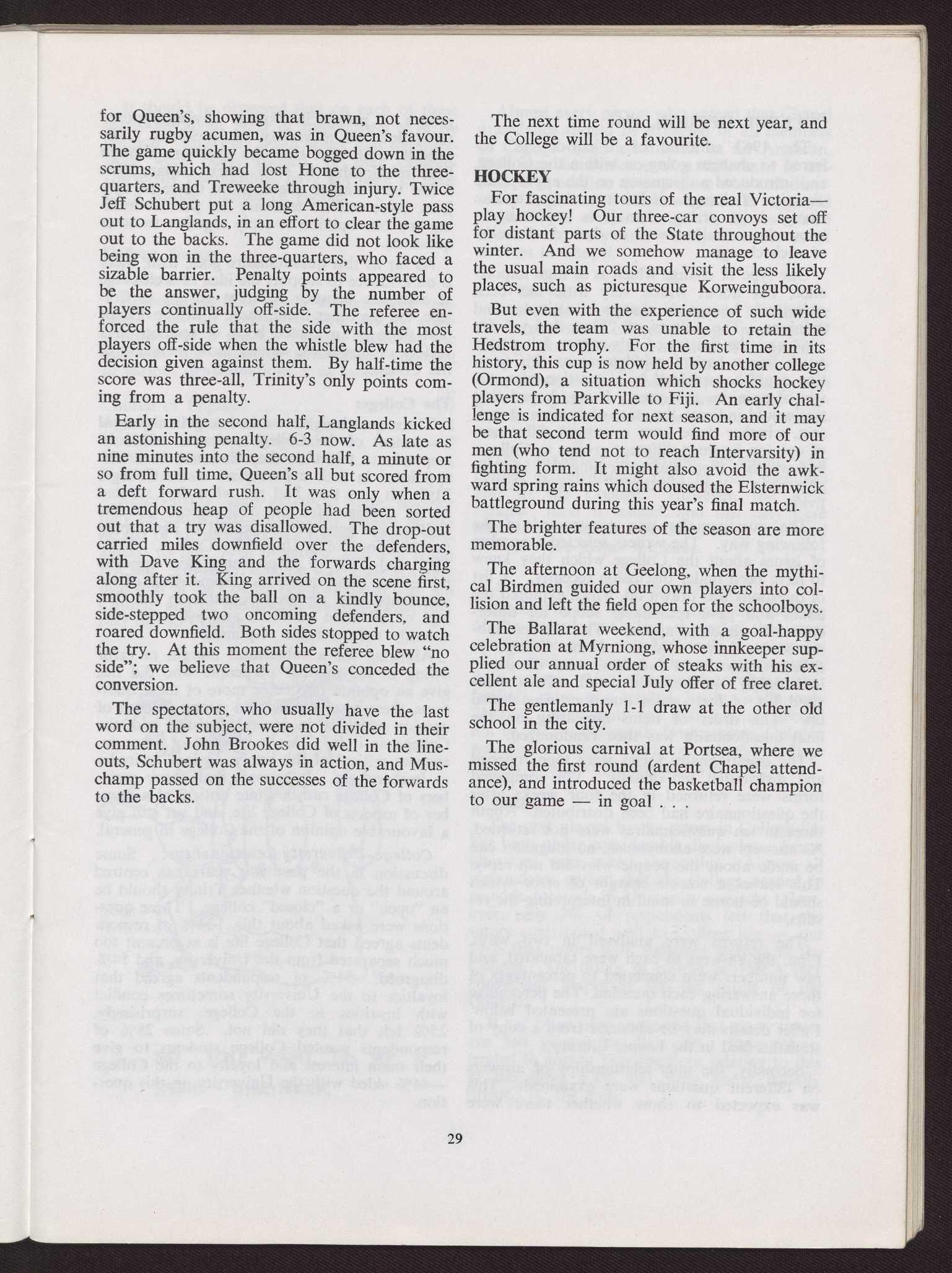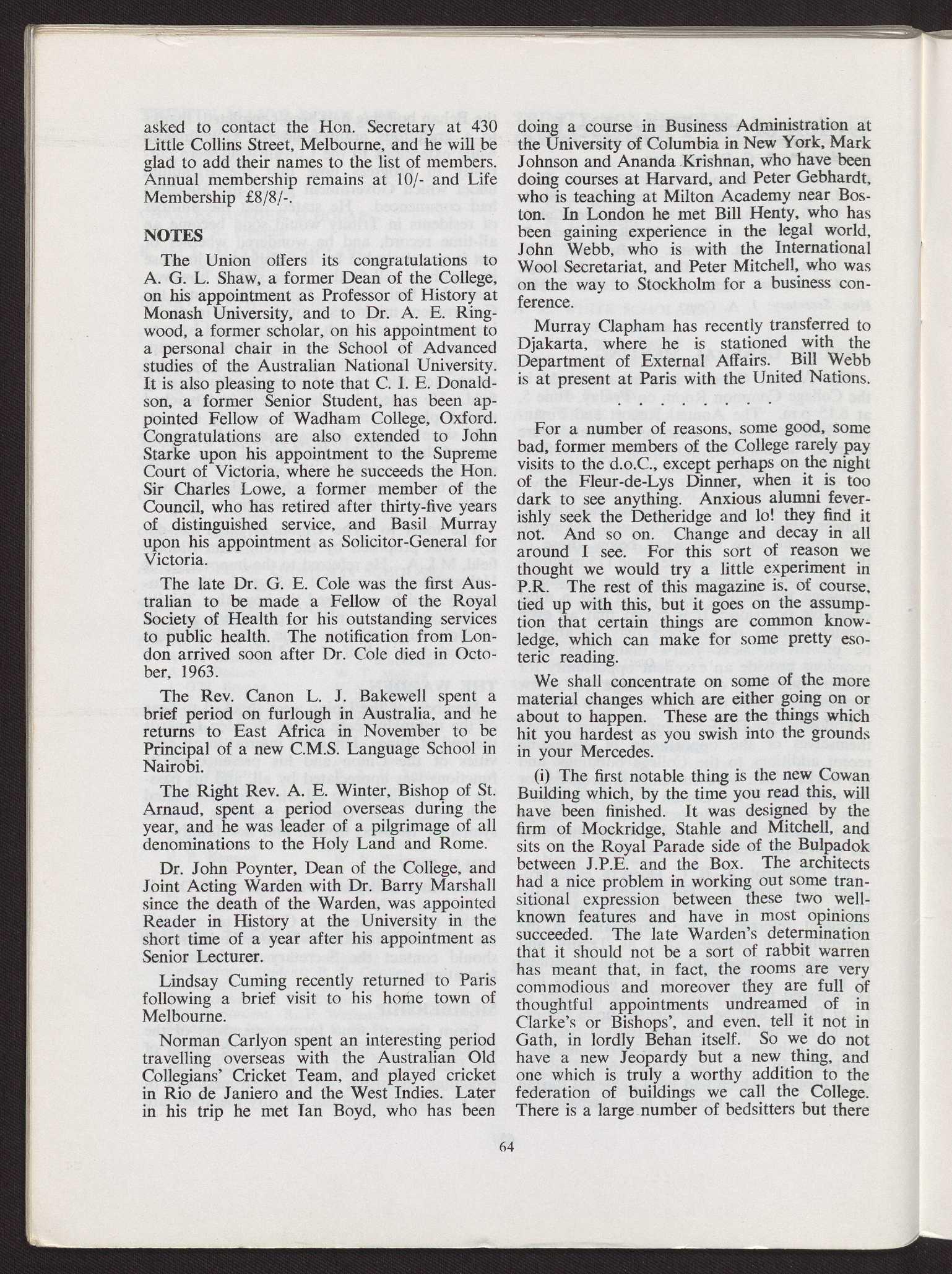 While on the subject of Australiana, it is worth saying that here is one good specific thing which needs the attention of former members who have Australian books themselves. The College has a large and extremely valuable collection of Australiana which is very difficult to keep up now that the collectors with bulging wallets all flash along to the book sales to add to their private hoards. Death catches up even with them, and so off all the books go to Joel's for another round of profit. Might I suggest that you remember the College in this way when making out a will, or just when you are feeling in a bountiful mood. Our collection, once it is worthily housed, as it will be, will be one of the brightest jewels in the College crown. It will be of the greatest assistance to students for whom it is designed. It is emphatically not just another bower-bird pile of things bright and beautiful. A contribution sooner or later from your shelves would, suitably bookplated, be a very