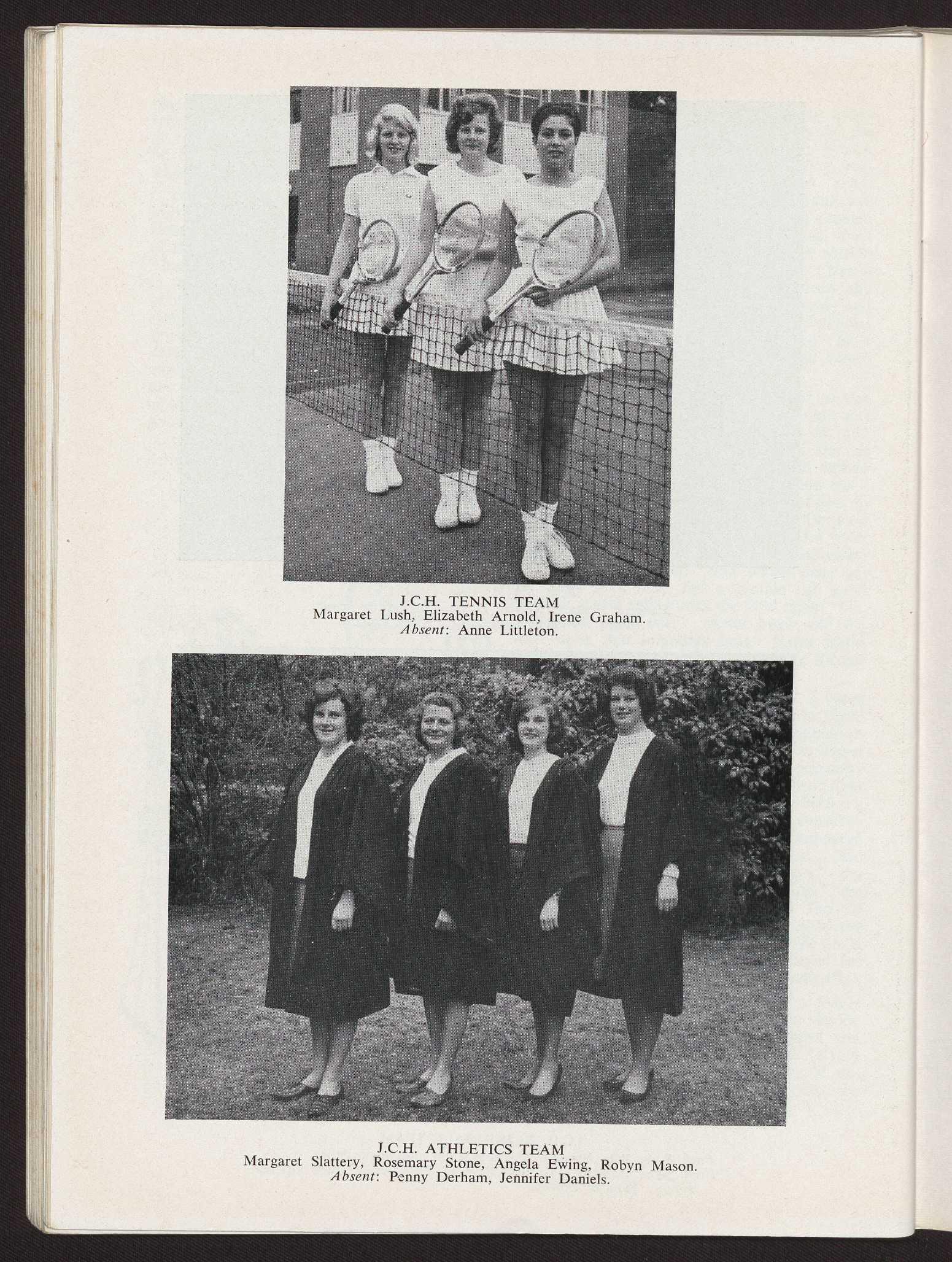 Toasts were the Queen and the College, proposed by the President and replied to by the Acting Principal and the Senior Student. "Absent Friends" was proposed by Mrs. T. Coates.