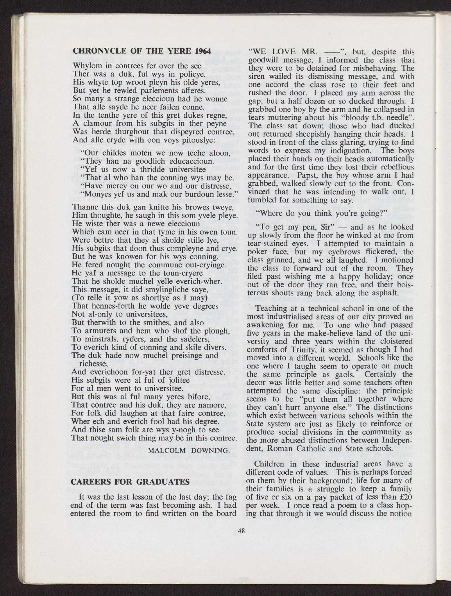 Those who arrived in College as undergraduates at the time of his appointment, mostly as ex-servicemen, perhaps might have expected easy manners from a man of their own age. To my era he was a man twenty years our senior, yet he came among us as a friend, and it is as a very true and happy friend that we shall most remember him.