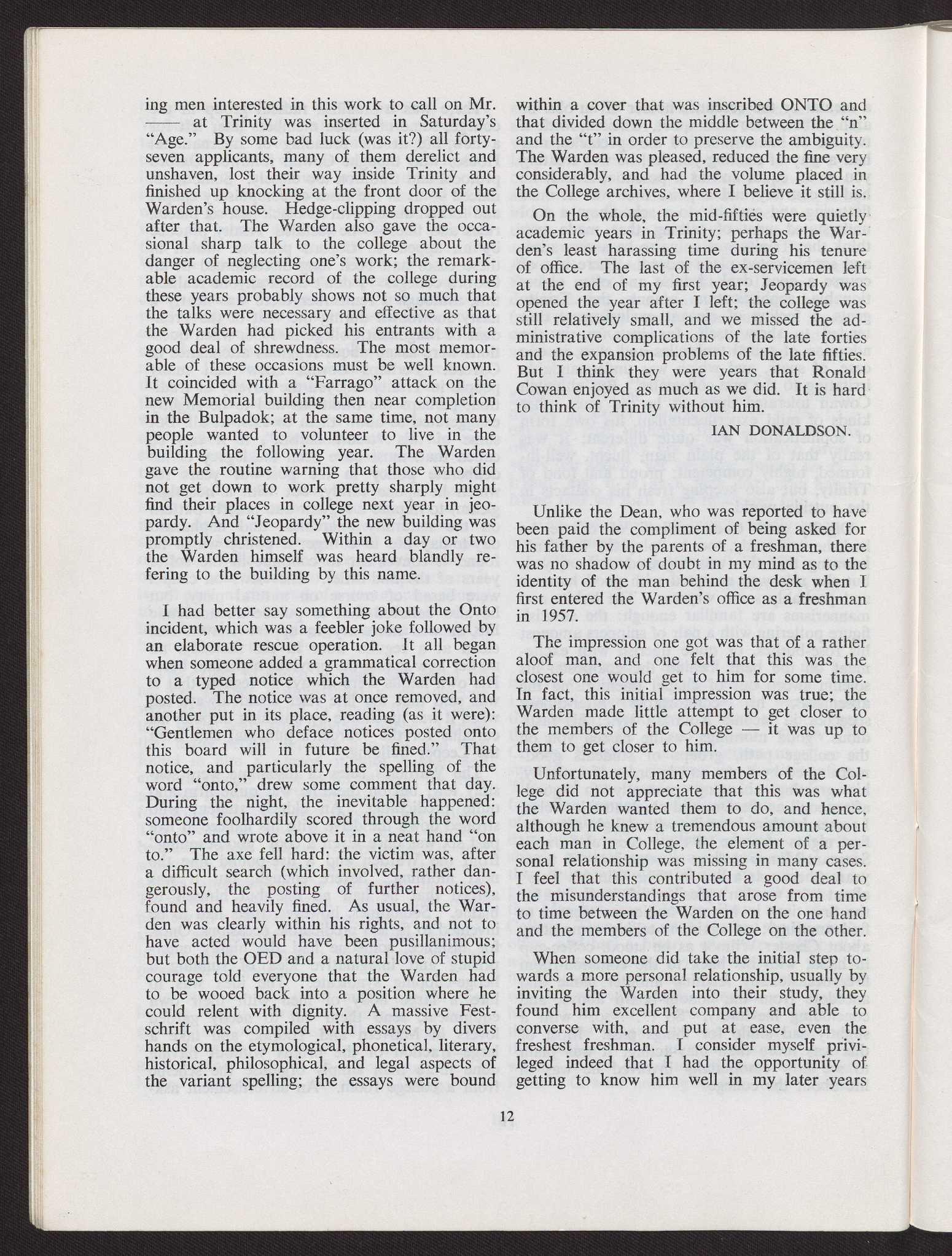 I remember that before I went for my first interview with the Warden of Trinity in 1953 I furtively looked up the word "warden" in the Oxford Dictionary. I had an idea that the person who signed himself "R. W. T. Cowan, Warden," on my letters must be a superior sort of secretary in the institution. Those of my friends whom I asked for information seemed equally uncertain, and those of my seniors who would have known I didn't dare to ask. The dictionary failed me, saying simply sentinel, guardian, air-raid official, and then listing a number of obs. and arch. senses, giving as examples of these the Wardens of the Marches, the Cinque Ports and Merton College. Then I was unable to find the Warden's office, and had a bizarre encounter (which did nothing to quieten my nervousness) with a florid, grey-haired man in a maroon jumper who left me with a clear impression — which he tried in vain in future years to restore— that it was he and not the Warden who ran the College. But uncertainties disappeared when I at last found myself face to face with Ronald Cowan: nothing here to suggest either