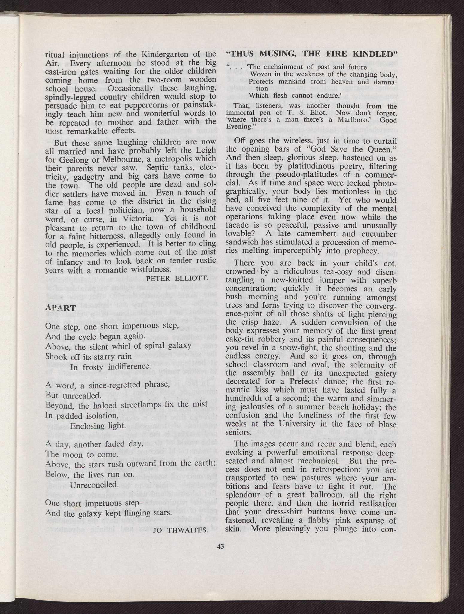 It seems obvious to say that one of the functions of a university is to encourage thought, and indeed it has been said many times before. But many students at this university do not think either long or deeply. There are many reasons for this: pressure of work, family background, personal difficulties, or laziness. All of these, except perhaps the last, are advanced from time to time to excuse or explain "apathetic" behaviour. "Apathy" has in fact become almost a proverbial joke. It seems then that there is still room for a discussion of how this situation arose and what, if anything, can be done about it.