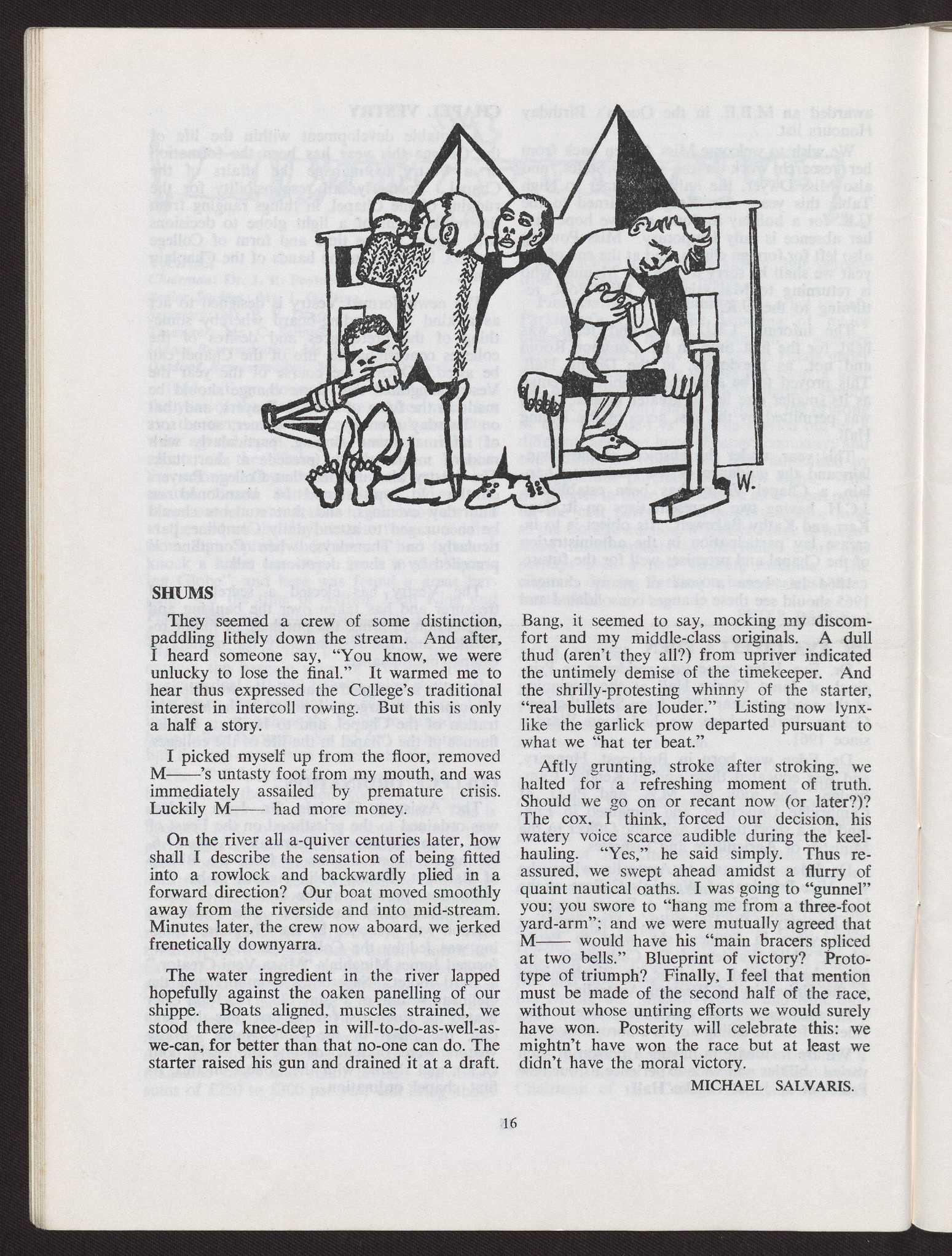We wish to thank all those who have helped prepare this magazine: first, our new printer, Mr. Boneham, for his advice and his cheerful patience in awaiting late copy; our contributors —especially those whose articles, being "neutral" journalistic reports, are left unnamed; John Wilson, our staff cartoonist, and our illustrators, Peter Elliott, David Grutzner and Peter Hughes; William Cowan for supervising the printing of the photographs which he and Graham Aplin, Thomas Blarney, David Pate, Victor Ramsden and Andrew Yuncken contributed; John Brenan and Peta Haydon for proof-reading the entire magazine; Malcolm Downing and Lyman Jones Jr. for typing the bulk of the magazine ready for the printer; all those whose articles, drawings or photographs we did not use; Axel Clark, Malcolm Downing, Douglas Miller, James Minchin, William Wakefield and the Joint Acting Warden for editorial advice; Mr. J. D. Merralls for his cooperation; Peter Elliott and David Harper for changing the date of the Wigram Allen Essay Prize reading at short notice to suit our deadline; and finally the staff of Austral Printing and Publishing Company.