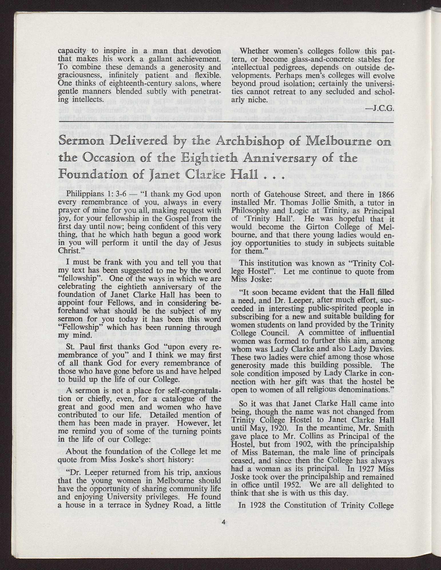 This has always been a fellowship of persons far wider than that of their own College, though their own College has been as it were the focusing point of this community of learning. In the Middle Ages there was a tremendous sense of fellowship between scholars of every country of Europe, and I am glad to think that this community sense of world-wide intellectual pursuit is even stronger today than ever before. There is more movement of scholars today from one University to another, and more pooling of resources than there has ever been before. It is not unsuitable that, as we thank God for Janet Clarke Hall, so should we thank God for this stake in a wonderful world-wide fellowship.