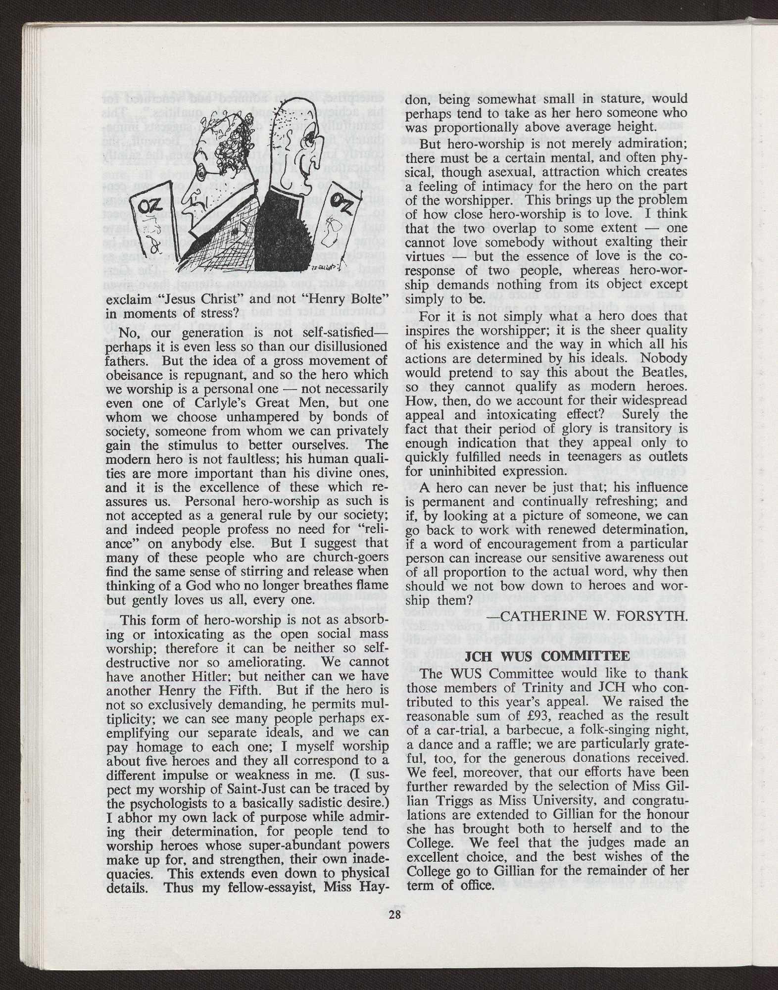 one, Freudians please note. What it is, of course, is a collection of unwilling reports of everything of interest (and some things which aren't) which happened in Trinity and The Hall before the closing date for copy. As editors, we, the undersigned, are responsible for the printed word, but not for the activities necessitating description. Only that mythological beast, "The College", can be that responsible, or irresponsible, as the case may be. So, with the final Exhortation to the reader to don his rose-tinted lorgnette, my message to anyone who has read this far is "read on".