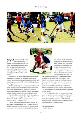 saw a new First XI group take to the field after the loss of 8 players from last year. The young group made significant strides in their development throughout the season and some good young players including Andrew Hooper and Damen Cooper performed well in their debut seasons. Highlights for the year included a spirited performance against Scotch which saw the opposition under extreme pressure due to some excellent goalkeeping from Simon Beale and some great defensive skills from Tristan Mitsopoulos and Nick Stappenbeck. Another significant game was played against Wesley with Trinity playing fast attacking hockey which created several goal scoring opportunities. The hard work of forwards Nathan Messer, Gerard Hill and Sam Cuthbert paid off with a classic field goal and the conversion of a penalty stroke. Thanks to all the parents for their support throughout the year. Congratulations to Captain Gerard Hill for his determined attitude which was recognised when he was selected in the P.S.A. combined side. The 2nd XI had quite a successful season this year. We were able to win one game and draw 3 and were narrowly defeated in a number of other fixtures. The highlight of the year was a 1-1 draw with the second placed Christ Church