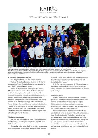 he recalled. “What really stood out was the retreats brought the Catholicity of the schools to the fore; they were not simply Catholic by name.” In the five years since his return, Br Callen continued to push for the introduction of Kairos to Perth; the success coming earlier this year with the endorsement of his proposal by the College. Introducing Kairos In order to lay a strong foundation for the continued operation of the retreats, four senior students and two staff members from Bellarmine College Prep. in San Jose, California (a host school during the 1997 tour) were sponsored by the College to introduce and facilitate Kairos #1 that was held at Moore River (Guilderton). This was a necessity as the main feature of the Kairos retreat is that it is run by students, with adult supervision. As it was their first retreat the Trinity boys hadn’t had any previous exposure to the operations of Kairos, hence the invitation to the Americans. Future retreats will now be led by a core group of four students from the retreat held immediately previous to the current one. In fact, Kairos #2 was held at the end of August and was conducted by Trinity students.