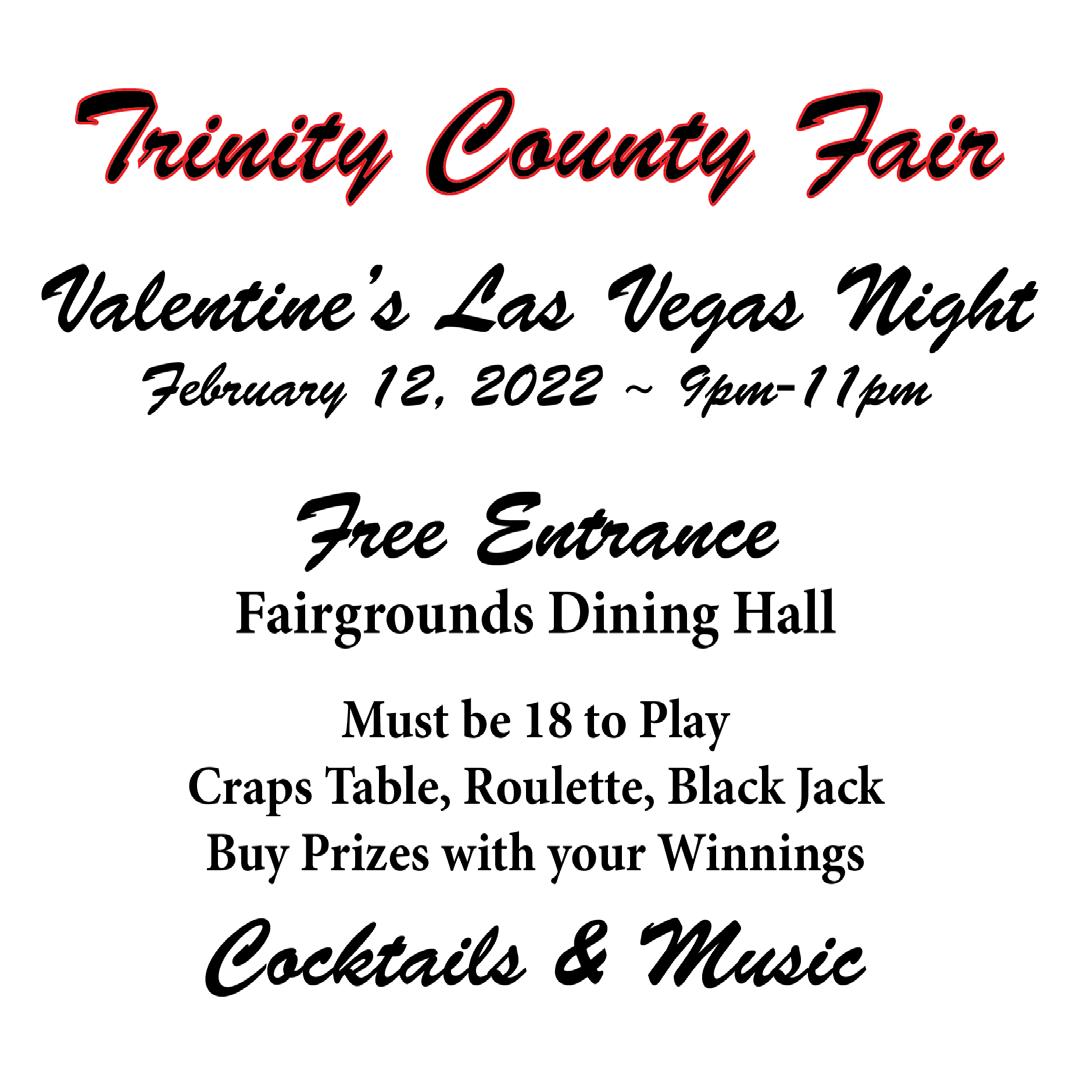 and you can preview the dinner menu at www. trinitycountyfair.com. Afterward, Las Vegas Night will be from 9 to 11 p.m. Entry is free for everyone, but you must be at least 18 to play. They will have craps table, roulette, blackjack, cocktails and music.