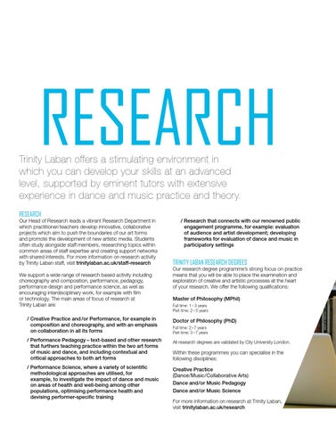 RESEARCH Trinity Laban offers a stimulating environment in which you can develop your skills at an advanced level, supported by eminent tutors with extensive experience in dance and music practice and theory. RESEARCH