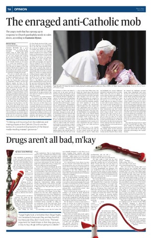 The enraged anti-Catholic mob The angry mob that has sprung up in response to Church paedophila needs to calm down, according to Eamonn Hynes Eamonn Hynes Contributing Writer THERE’S NOTHING like a good paedophile story to drum up the outraged, liberal-media-reading masses; most of whom have never experienced the horrors of child abuse, nor are they charged with cleaning up the mess left behind by a bunch of sick perverts. Cribbing and moaning from the sidelines and making snipes at the Catholic Church are the tactics of a coward and symptoms of their ignorance. It is in an air of calm that I write this piece in support of the Irish Catholic Church and in support of the Irish clergy in their mission to cleanse the institution and continue on the path of repentance, healing and renewal. First off, we should calm down. Is one really that interested in the kind of slippery implication that one reads about in the holier-than-thou Irish media who bandy about terms such as “misprision of felony” and the 1937 Offences Against the State Act like bullies in a school yard. The fact is that in order for a person to be guilty of a crime (such as this Section 17 of the Offences Against the State Act that we hear about so often), proof of fault, culpability or blameworthiness in both behaviour and mind is required. Some of the stuff I’ve read in recent weeks would lead you to believe that Pope Benedict is the anti-Christ and Cardinal Brady one of his evil minions. But getting back to the issue that caused shock-waves of outrage across the nation, I say this: The then-Fr. Sean Brady never at any stage consciously acted to further harm an abuse victim with an accompanying level of mens rea. Yes, Fr. Brady was a man in a position of responsibility, but I do not believe for one moment that he purposely acted to expose more children to the care of a sex pervert. Brendan Smyth went on to abuse children after