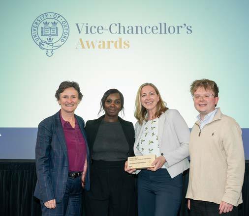Trinity’s Access work has been recognised at the ViceChancellor’s Awards, which celebrate achievements and successes across the University, as the Outreach and Access team won in the Local Community Engagement category for its outreach in Oxfordshire (briefly reported ‘Stop Press’ in the last edition). The award was presented by the Vice-Chancellor (pictured, left, with Access team members Innocent Otunnu, Hannah Rolley, and Rob Harrison) at a special ceremony at the Sheldonian Theatre in May.