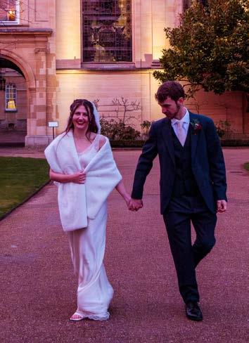 Bethany White (2014) to Rowan Curtis (2018), on 15 December 2024, at Trinity College. Trinity members present were Julia de Romémont, Henrique Laitenberger (both 2014), Laura Cox (2017), Neil Lewis (2018), Sophie Clarke, and Conor Keogh (both 2019). Rowan’s grandfather, Bruce Hartnell, conducted the ceremony. Bethany and Rowan were delighted that Jon Flint, SCR and Hall Steward, and Ian Stacey, Bar & Café Manager, were on duty; both were a regular part of Bethany’s and Rowan’s lives in college, who first met in the Beer Cellar when Ian was behind the bar. (Top left)