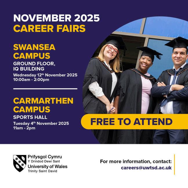 Join us for our 2025 UWTSD November Careers Fairs! Open to all UWTSD students and graduates. A free event to help you take the next step in your career. Don’t miss this brilliant opportunity to explore your options and plan your future. Meet employers face-to-face and discover a wide range of career pathways. Your future career starts here! Get inspired. Get connected. For more information, contact: careers@uwtsd.ac.uk