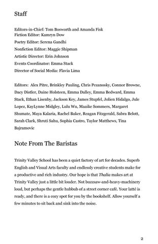 Note From The Baristas Trinity Valley School has been a quiet factory of art for decades. Superb English and Visual Arts faculty and endlessly creative students make for a productive and rich industry. Our hope is that Thalia makes art at Trinity Valley just a little bit louder. Not buzzsaw-and-heavy-machinery loud, but perhaps the gentle hubbub of a street corner café. Your latté is ready, and there is a cozy spot for you by the bookshelf. Allow yourself a few minutes to sit back and sink into the noise.