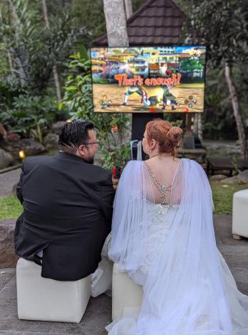 The couple celebrated their wedding in Bali, Indonesia, with a video game background.