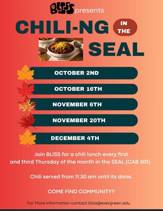 Chili-ng in the SEAL: Chili is back for another year!! Students are invited to join us in the SEAL for delicious vegan chili and shared community.