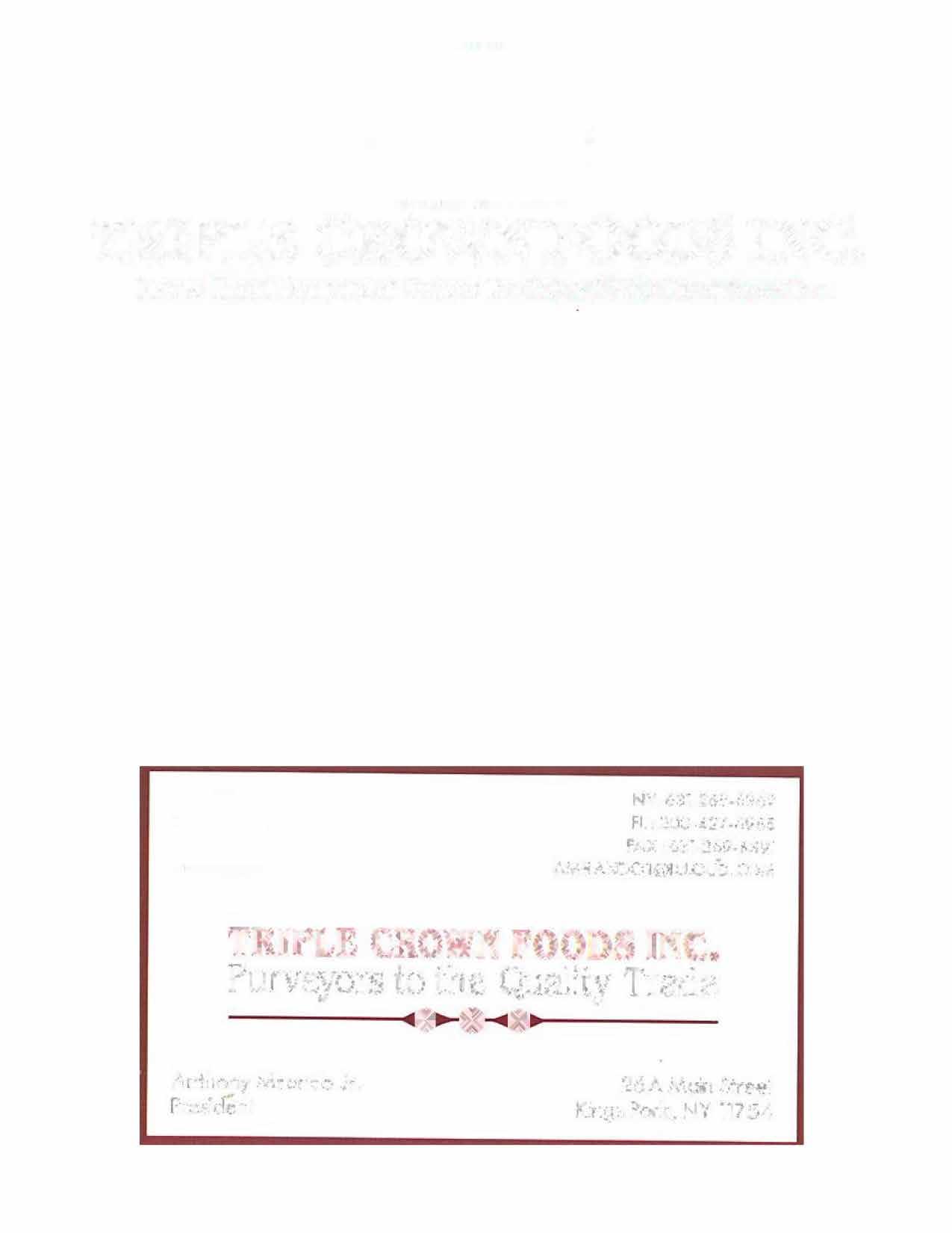 TRIPLE CROWNFOODS INC. Please Email Equipment Orders To:Orders@TripleCrownFoods.com 2023 FOODANDBEVERAGE PRODUCTGUIDE NY: 631-269-6362 FL: 800-427-6965 FAX: 631-269-6391 ANTHONY@TRIPLECROWNFOODS.COM TRIPLE CROWN FOODS INC. Purveyorstothe Quality Trade AnthonyMirando Jr. President .-. 26A Main Street Kings Park, NY 11754
