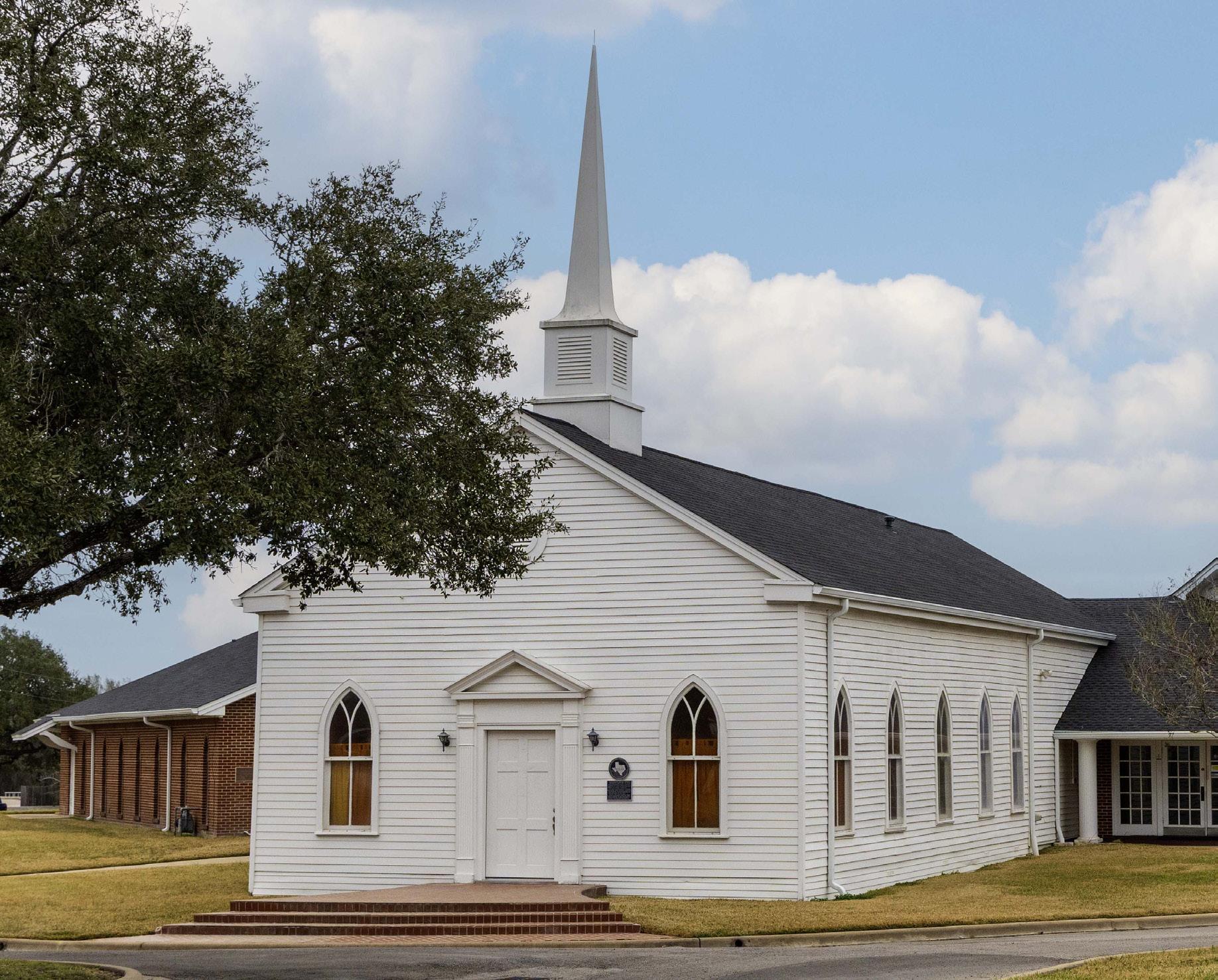 Left: First Baptist Church of Schulenburg traces its roots to about 1871, when early Baptist settlers organized a congregation that would grow alongside the developing railroad town.
