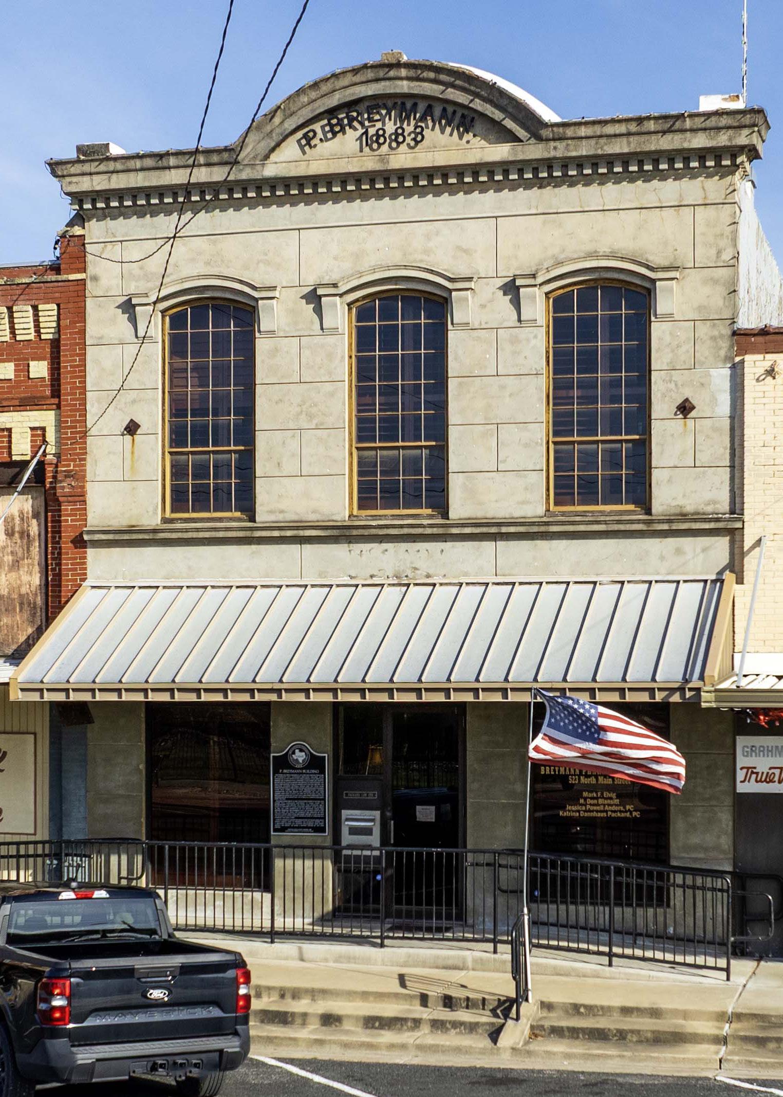 Built as Breymann’s pharmacy and business location, the structure reflects the architectural transition from wooden storefronts to more permanent brick and stone buildings in late 19th century Texas towns. The P. Breymann Building is located at 523 North Main Street in Schulenburg.