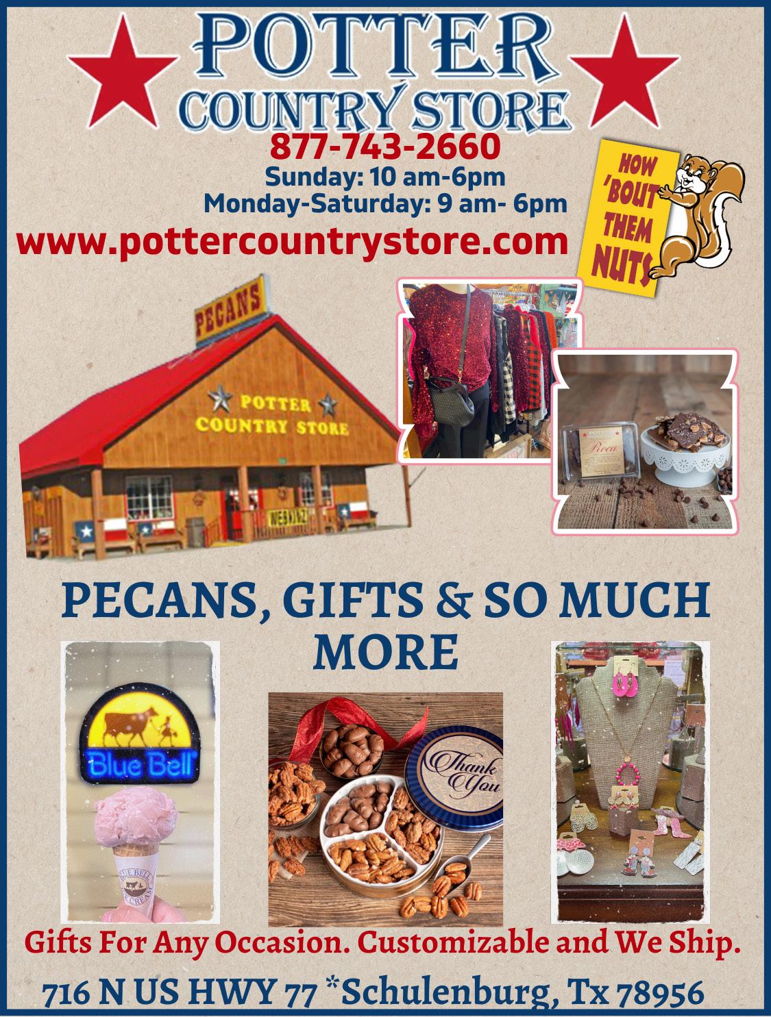 For a classic Schulenburg treat, stop by Potter’s Country Store. The family owned shop is famous for its flavored pecans, along with fudge, pies and gift items that make perfect take home souvenirs.