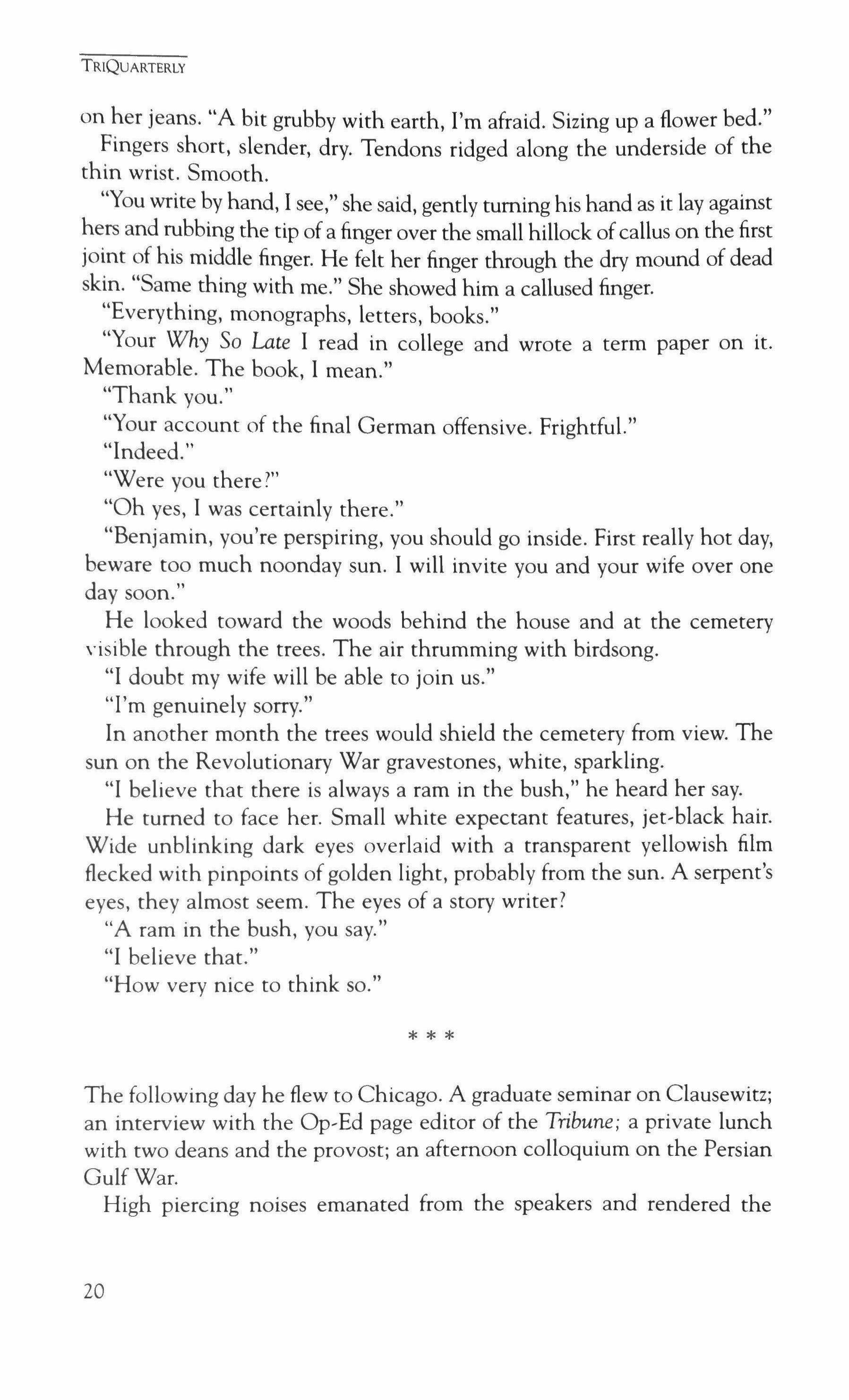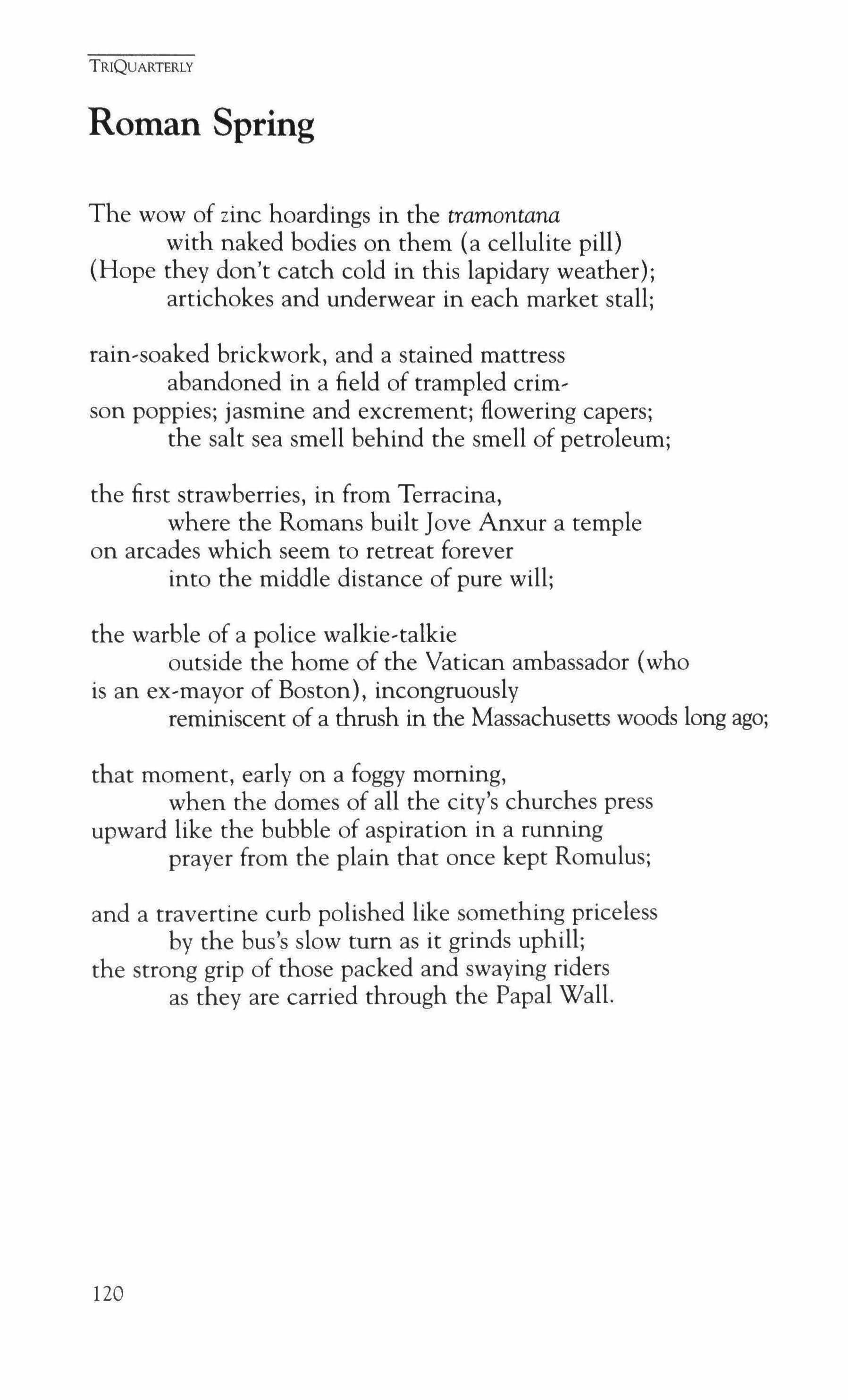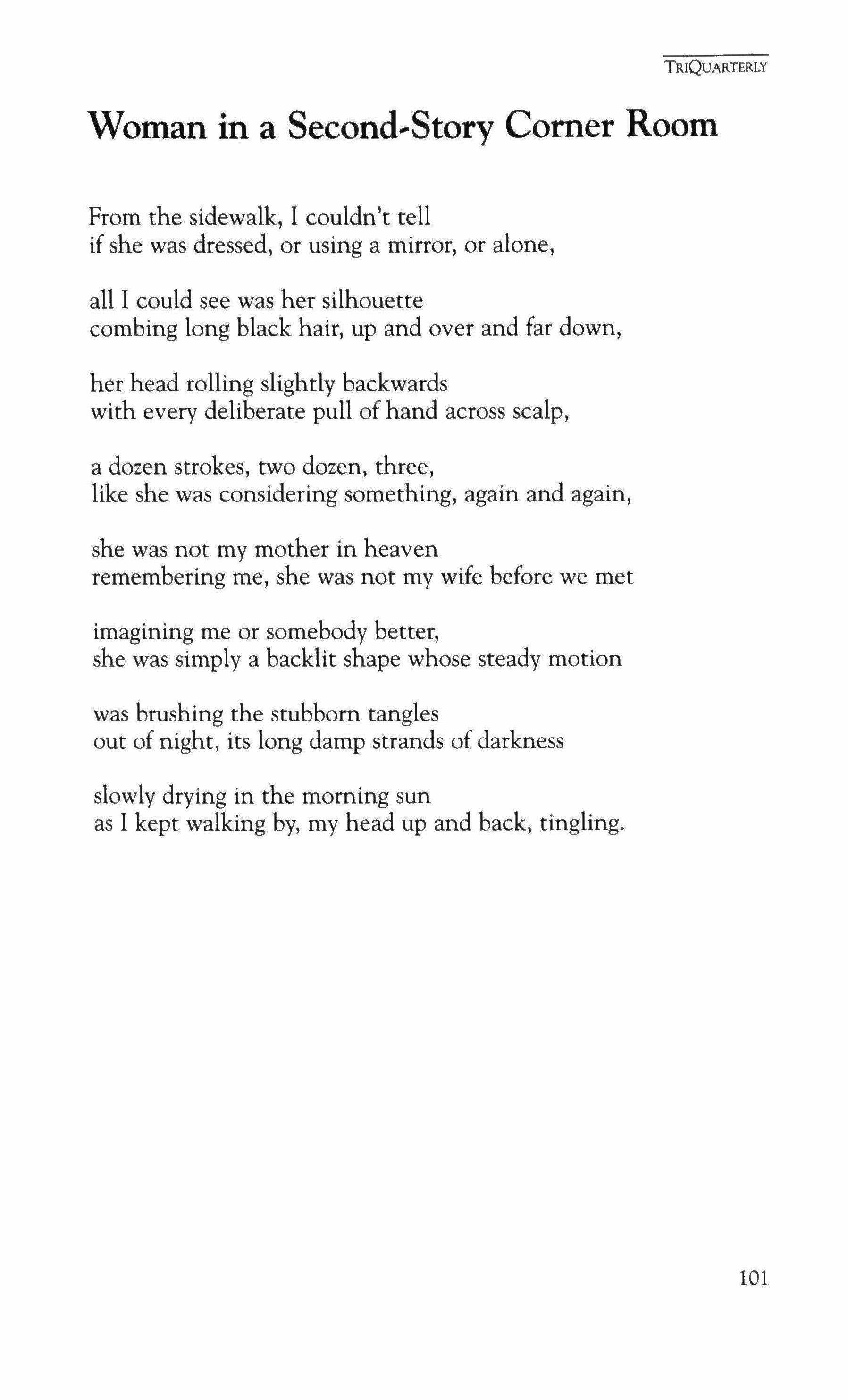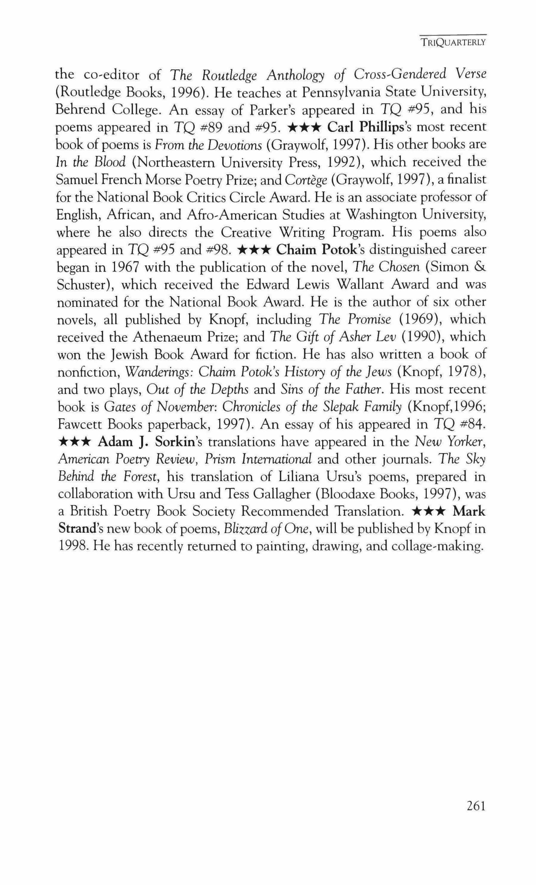 I intend this comment to be short (better to publish an additional poem). However, I do want to name TriQuarterly's contributing editors-all but three of whom are new. So far, I'm batting 1.00O--everyone I've asked to be a contributing editor has responded with a resounding Yes, and I think that speaks wonderfully well of what TriQuarterly has been and what these dazzling writers feel about its future. Thank You and Welcome to John Barth, Rita Dove, Richard Ford, Sandra M. Gilbert, Robert Hass, Lee Huebner, Li-Young Lee, Lorrie Moore, Alicia Ostriker, Carl Phillips, Robert Pinsky, Fred Shafer, Alan Shapiro, Mark Strand and Alan Williamson from the staff at TriQuarterly, the press, and I know also, from all readers of this, now and forever, amazing "little" magazine.