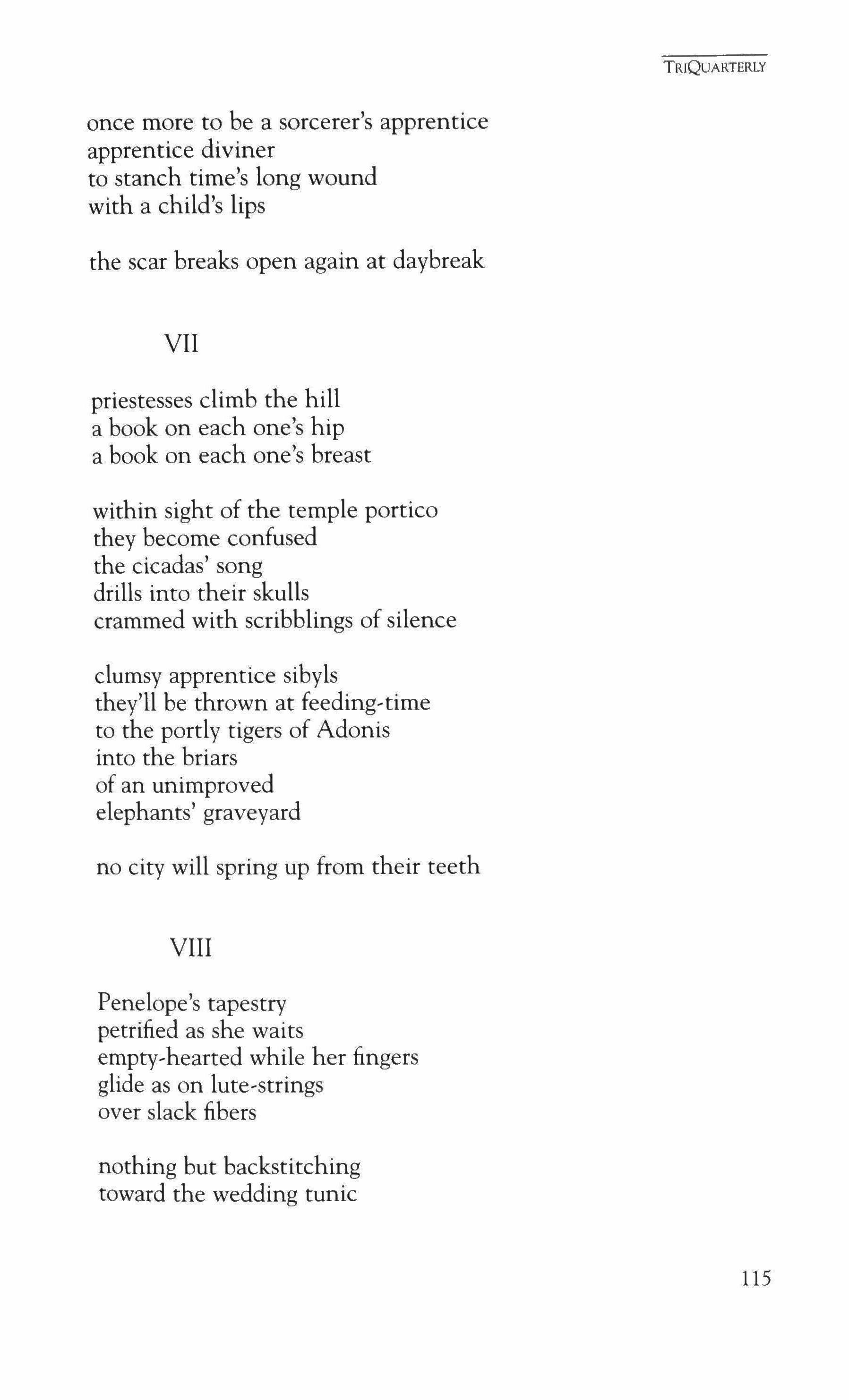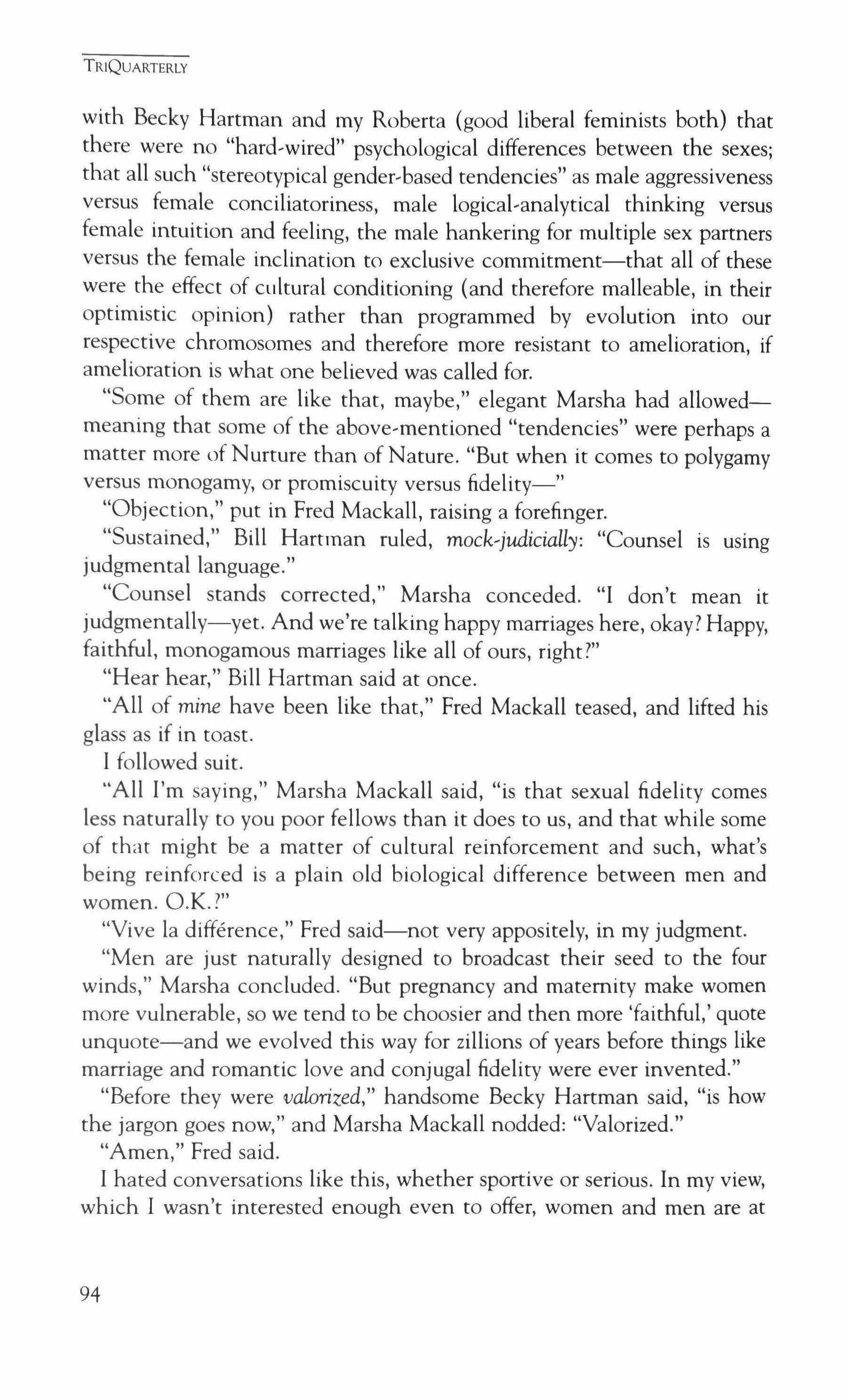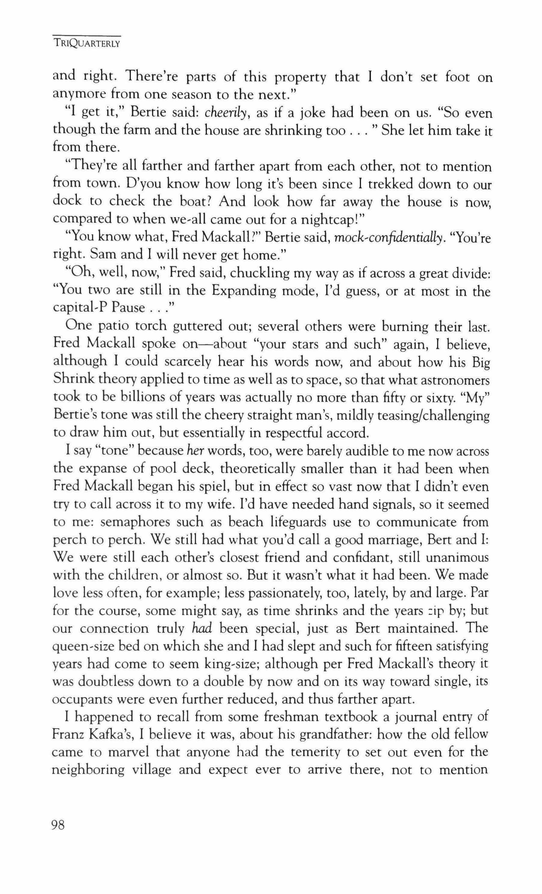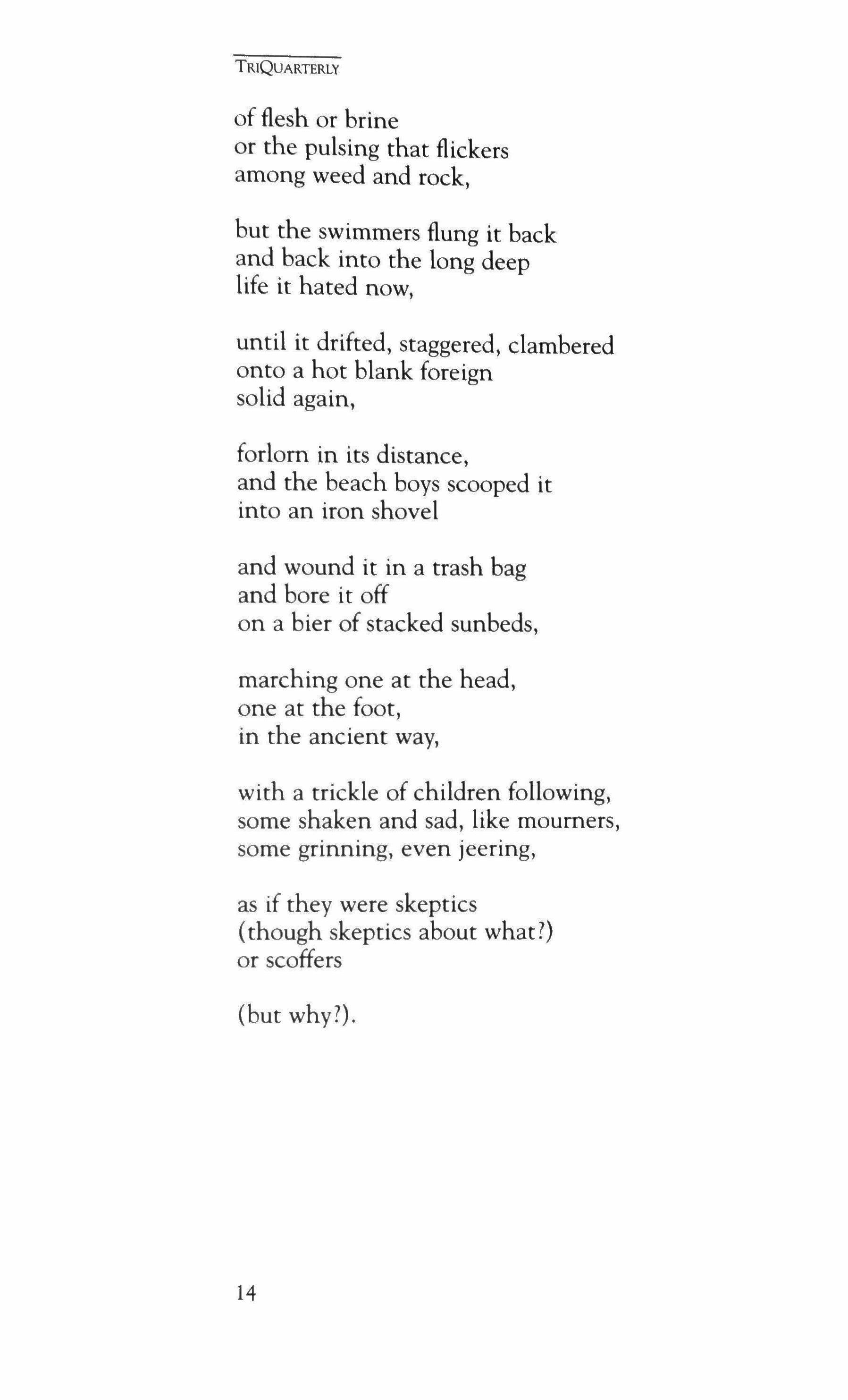 I intend this comment to be short (better to publish an additional poem). However, I do want to name TriQuarterly's contributing editors-all but three of whom are new. So far, I'm batting 1.00O--everyone I've asked to be a contributing editor has responded with a resounding Yes, and I think that speaks wonderfully well of what TriQuarterly has been and what these dazzling writers feel about its future. Thank You and Welcome to John Barth, Rita Dove, Richard Ford, Sandra M. Gilbert, Robert Hass, Lee Huebner, Li-Young Lee, Lorrie Moore, Alicia Ostriker, Carl Phillips, Robert Pinsky, Fred Shafer, Alan Shapiro, Mark Strand and Alan Williamson from the staff at TriQuarterly, the press, and I know also, from all readers of this, now and forever, amazing "little" magazine.