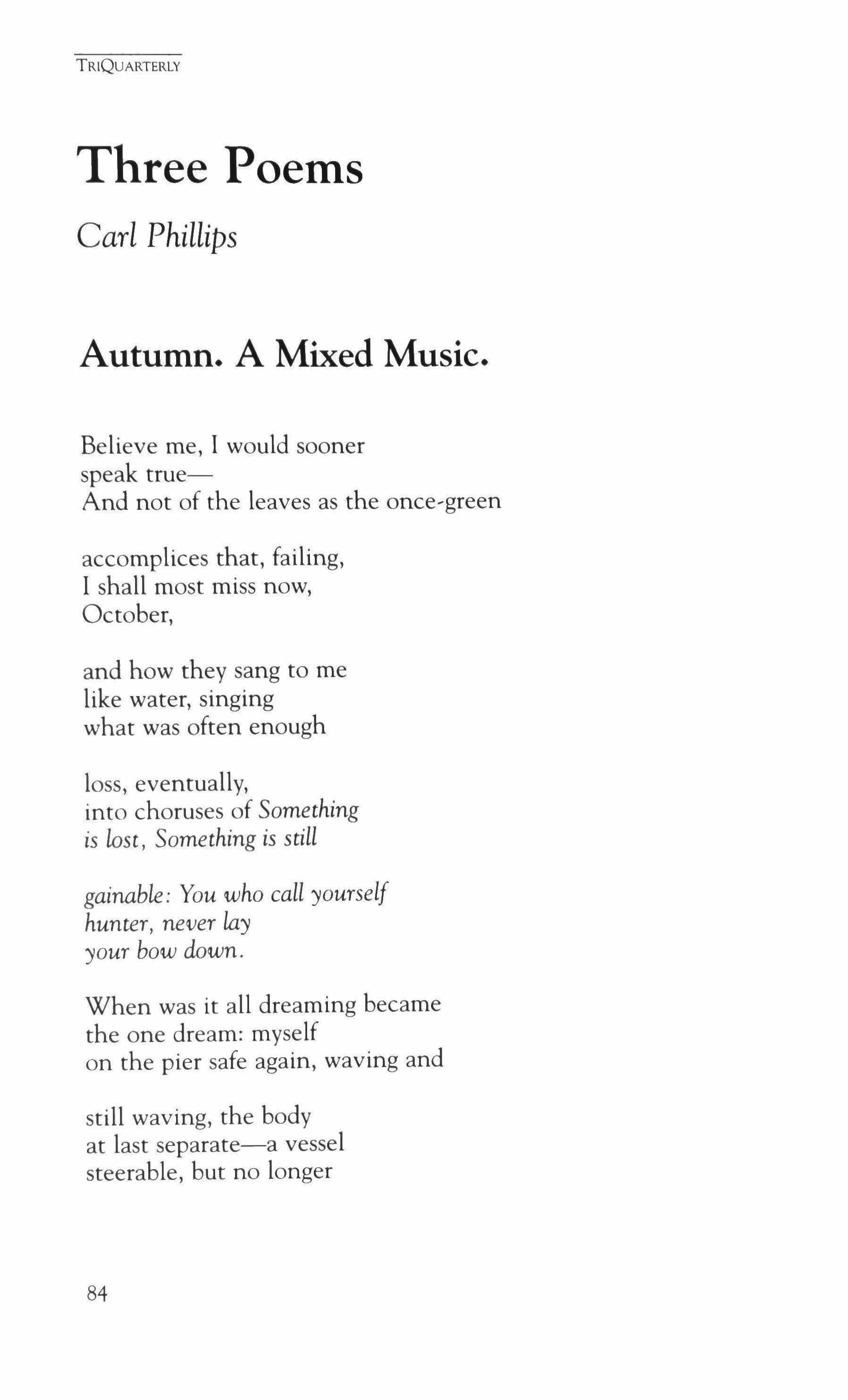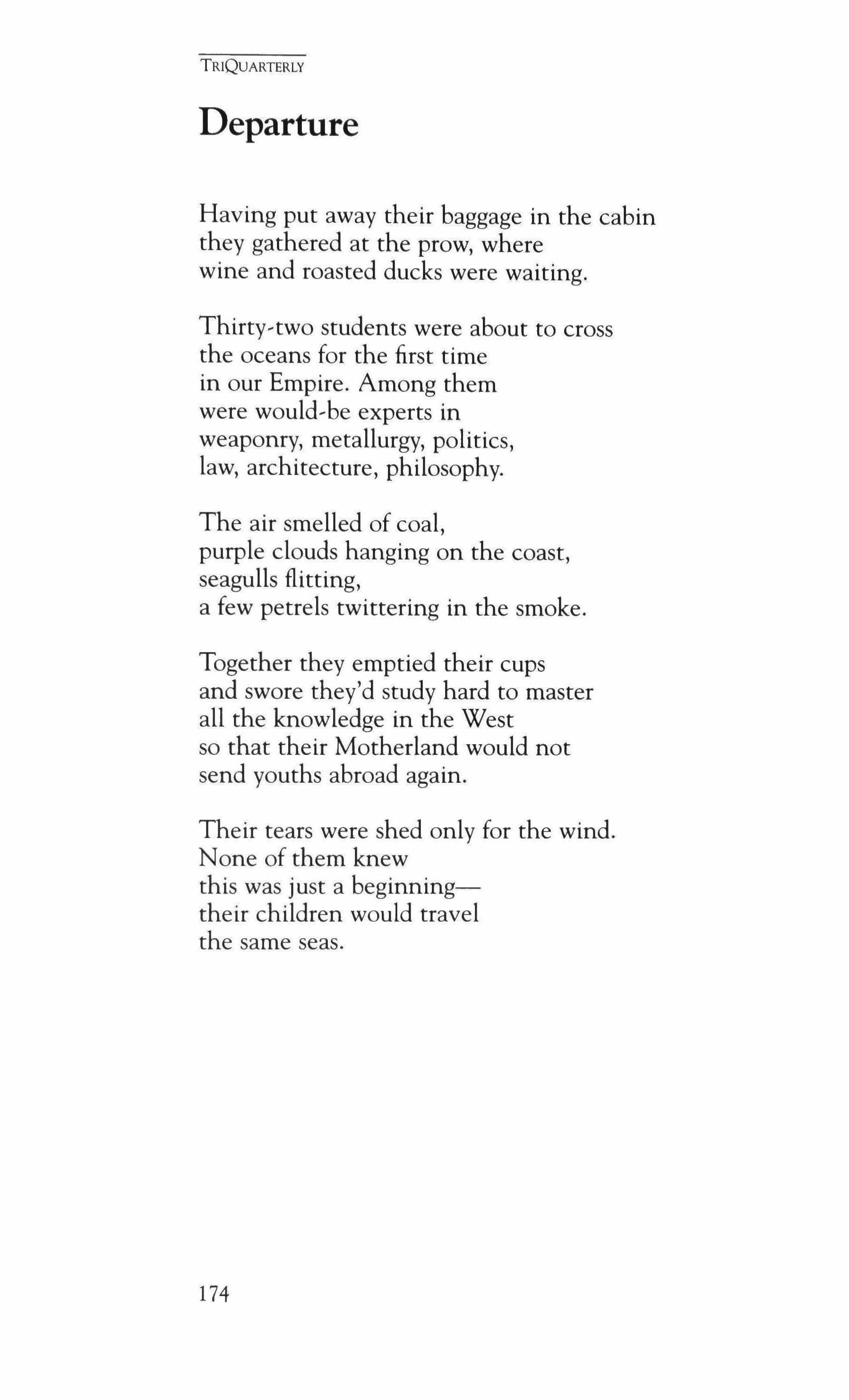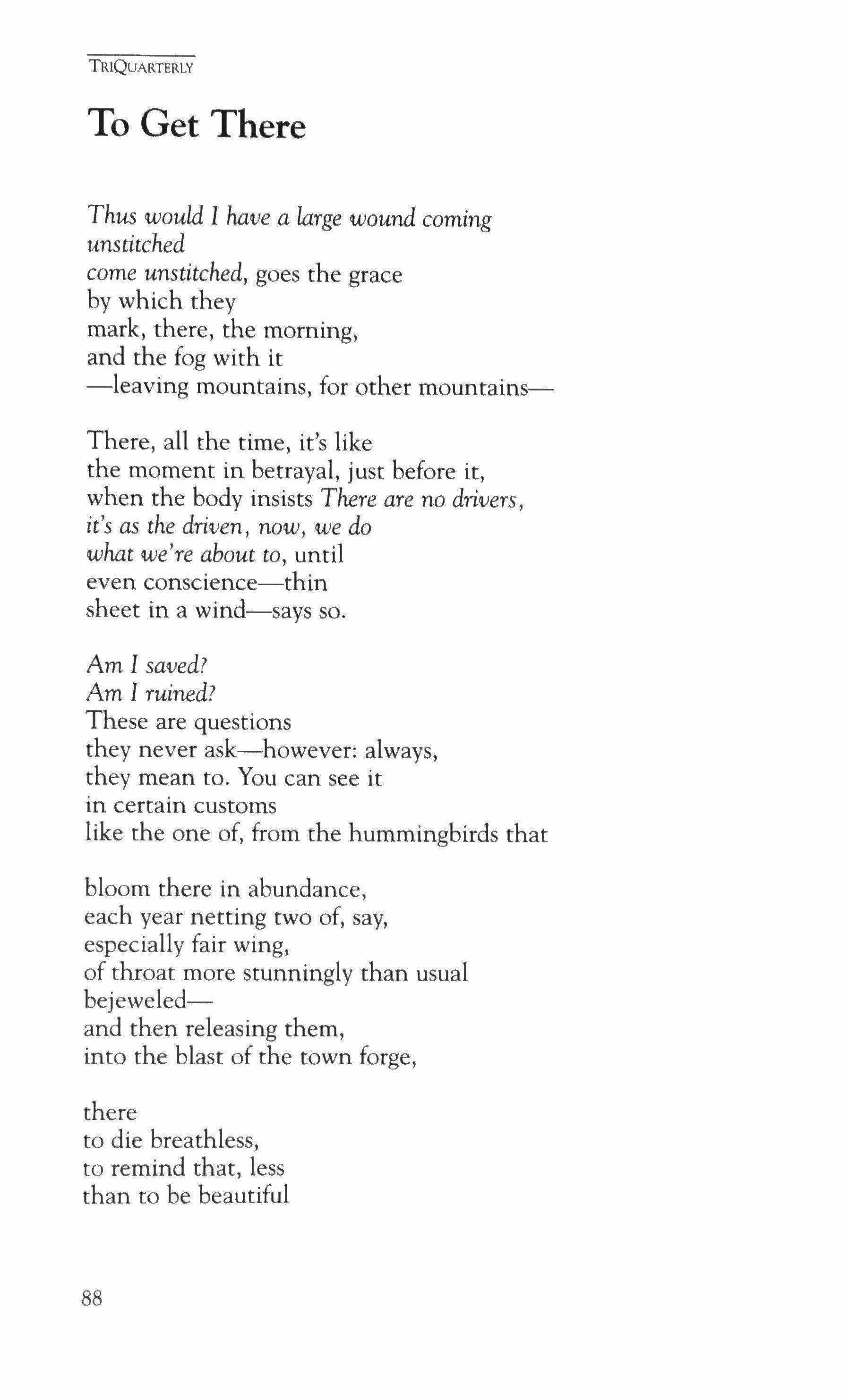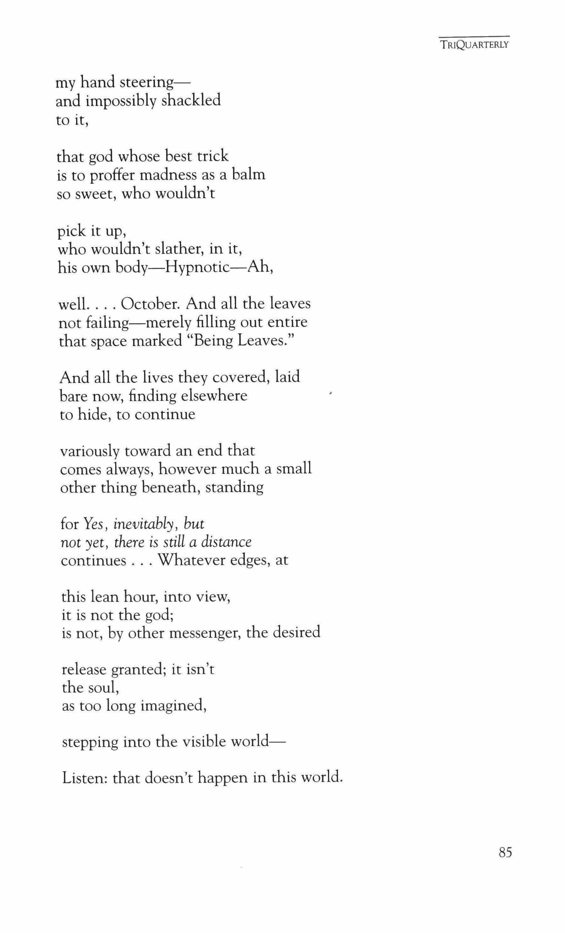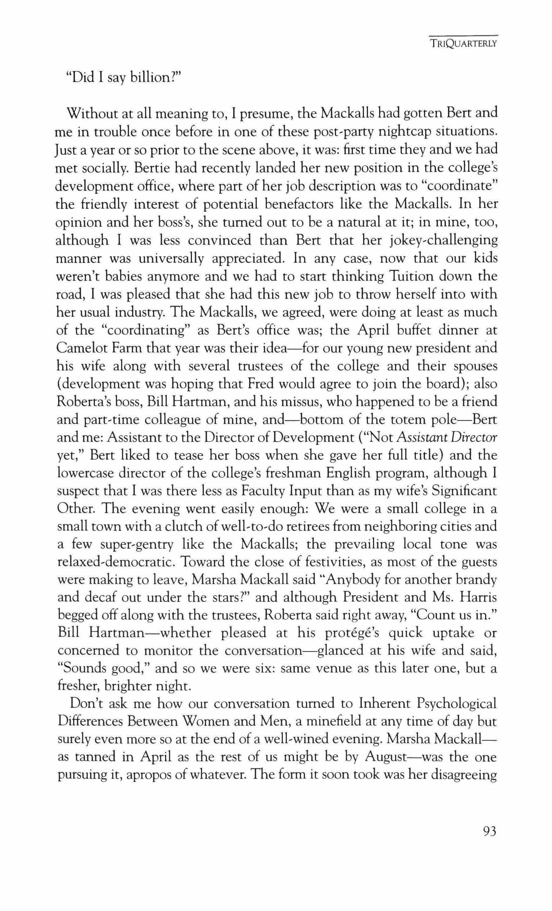 I intend this comment to be short (better to publish an additional poem). However, I do want to name TriQuarterly's contributing editors-all but three of whom are new. So far, I'm batting 1.00O--everyone I've asked to be a contributing editor has responded with a resounding Yes, and I think that speaks wonderfully well of what TriQuarterly has been and what these dazzling writers feel about its future. Thank You and Welcome to John Barth, Rita Dove, Richard Ford, Sandra M. Gilbert, Robert Hass, Lee Huebner, Li-Young Lee, Lorrie Moore, Alicia Ostriker, Carl Phillips, Robert Pinsky, Fred Shafer, Alan Shapiro, Mark Strand and Alan Williamson from the staff at TriQuarterly, the press, and I know also, from all readers of this, now and forever, amazing "little" magazine.