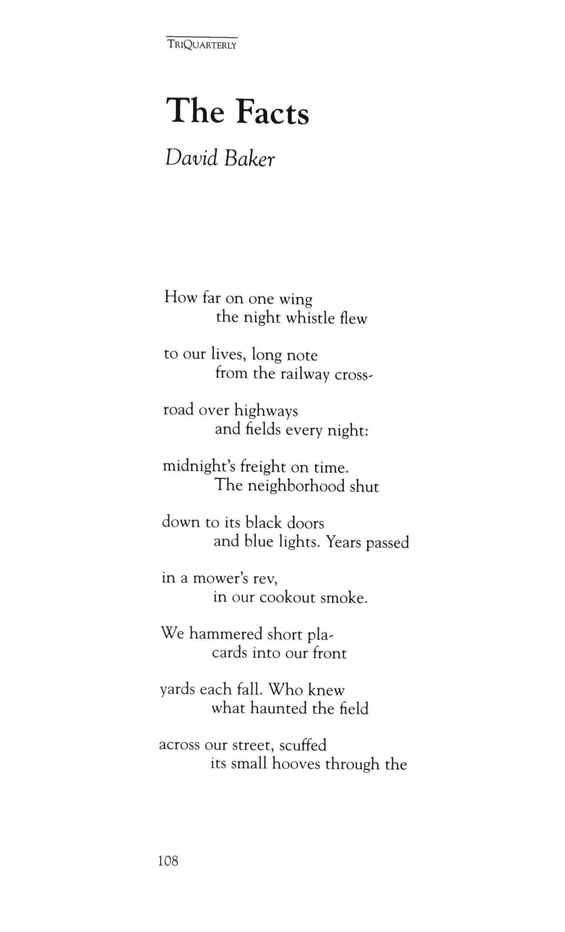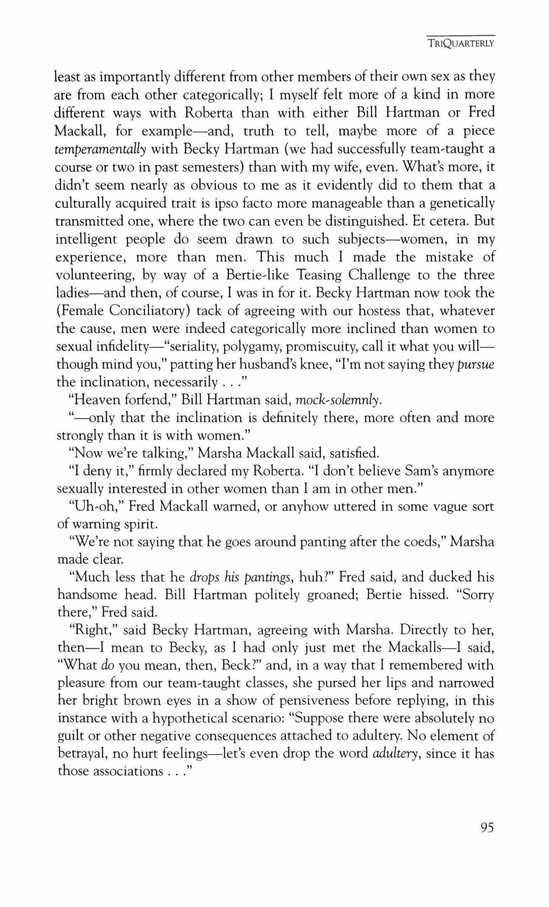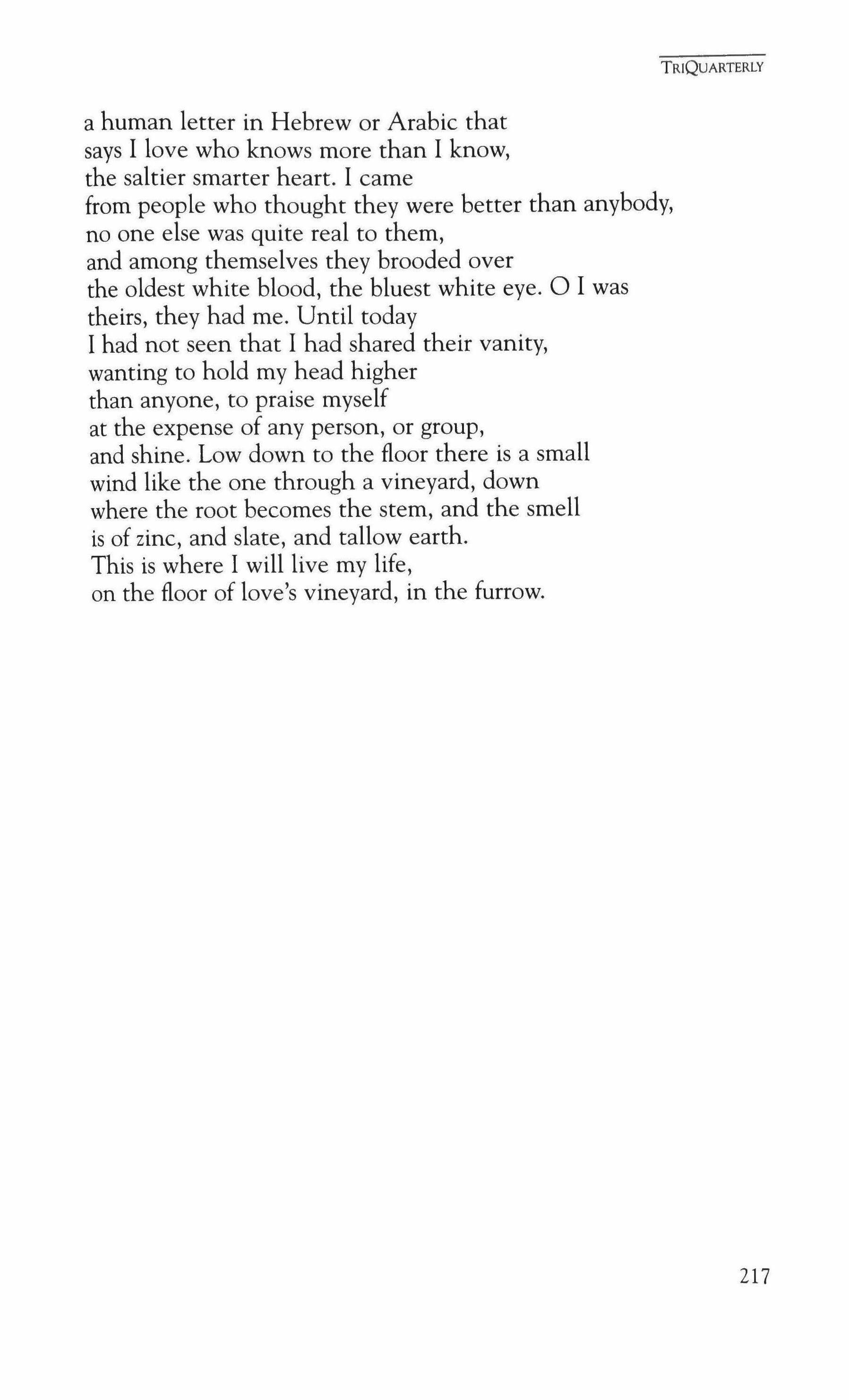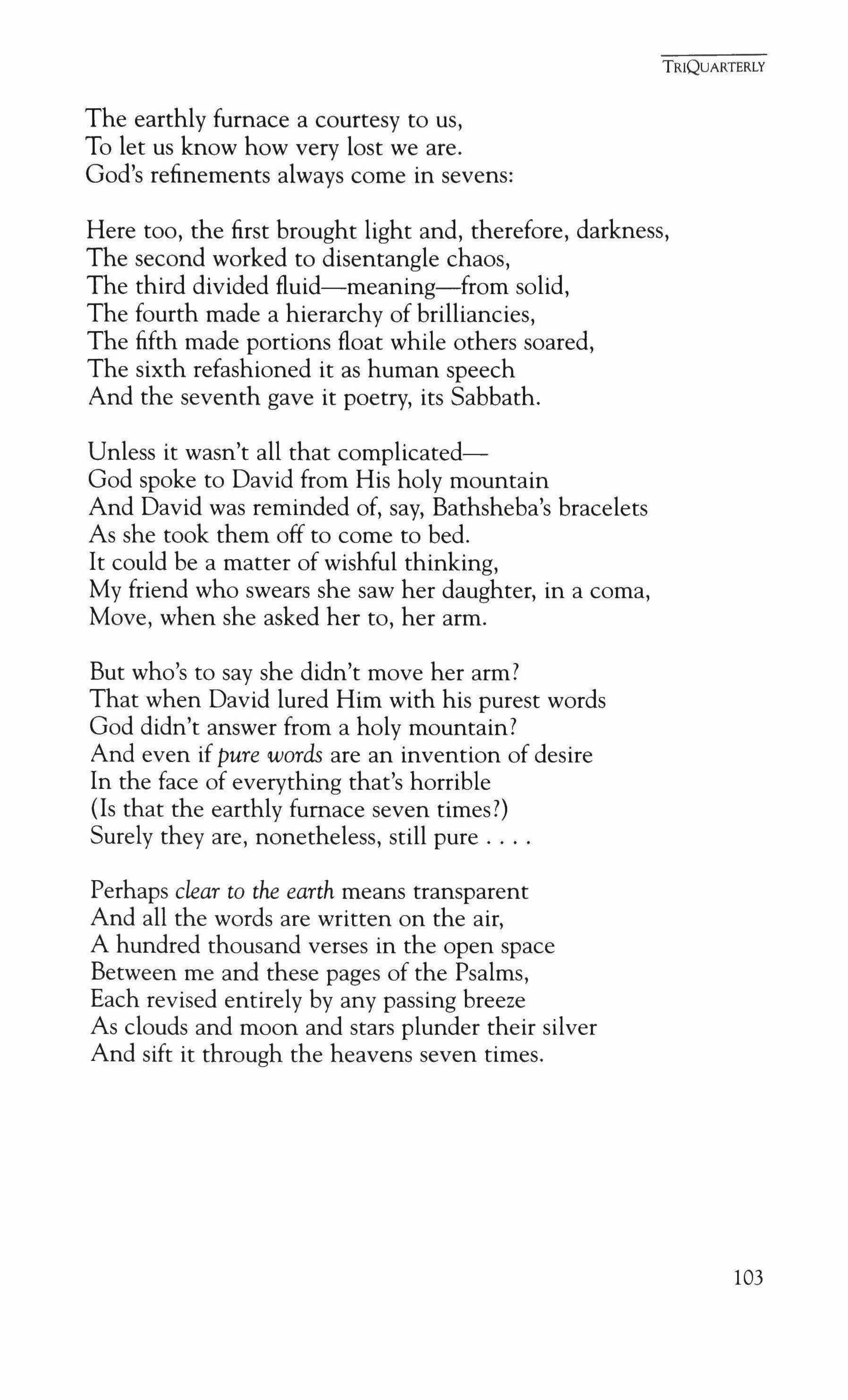 I intend this comment to be short (better to publish an additional poem). However, I do want to name TriQuarterly's contributing editors-all but three of whom are new. So far, I'm batting 1.00O--everyone I've asked to be a contributing editor has responded with a resounding Yes, and I think that speaks wonderfully well of what TriQuarterly has been and what these dazzling writers feel about its future. Thank You and Welcome to John Barth, Rita Dove, Richard Ford, Sandra M. Gilbert, Robert Hass, Lee Huebner, Li-Young Lee, Lorrie Moore, Alicia Ostriker, Carl Phillips, Robert Pinsky, Fred Shafer, Alan Shapiro, Mark Strand and Alan Williamson from the staff at TriQuarterly, the press, and I know also, from all readers of this, now and forever, amazing "little" magazine.
