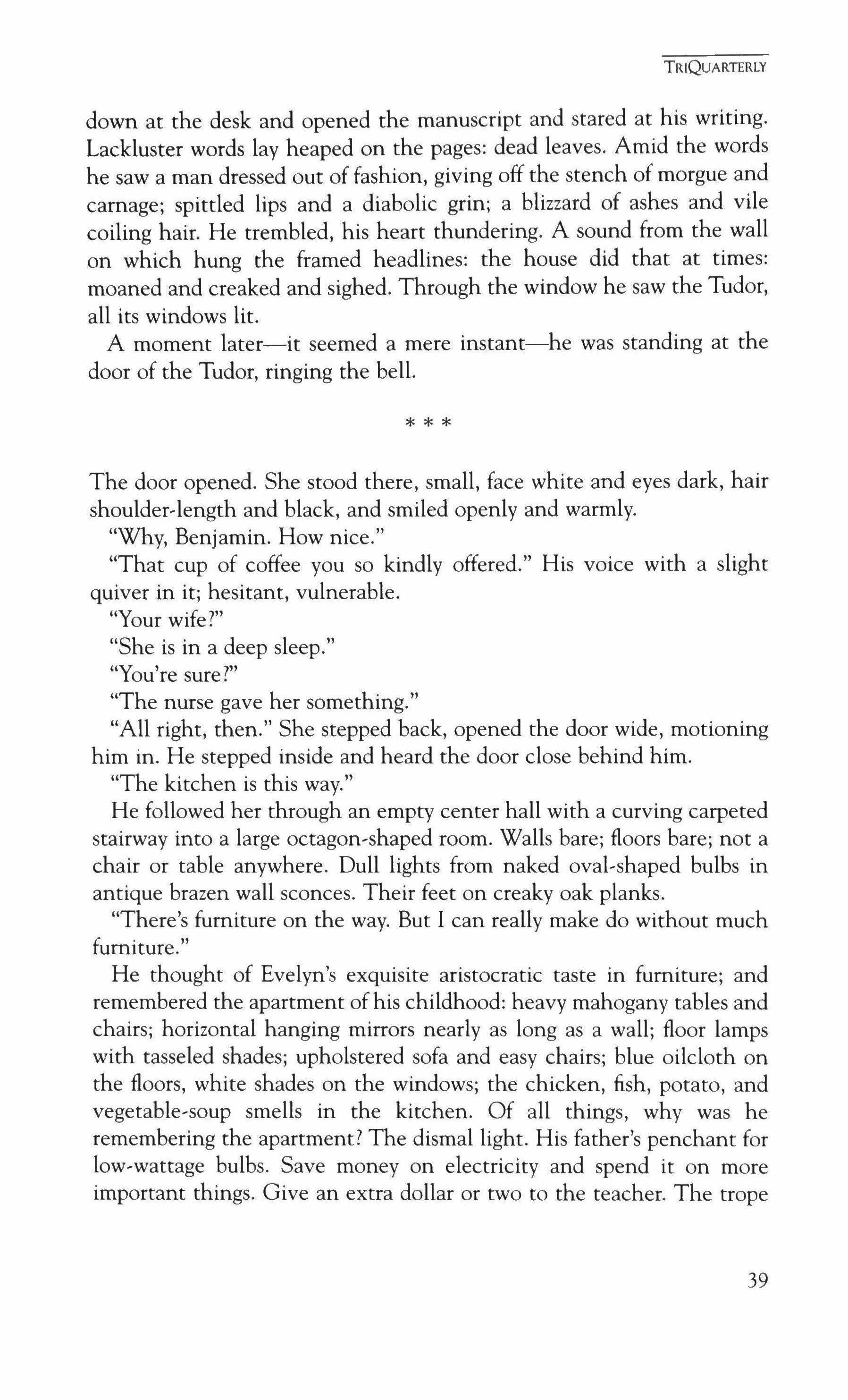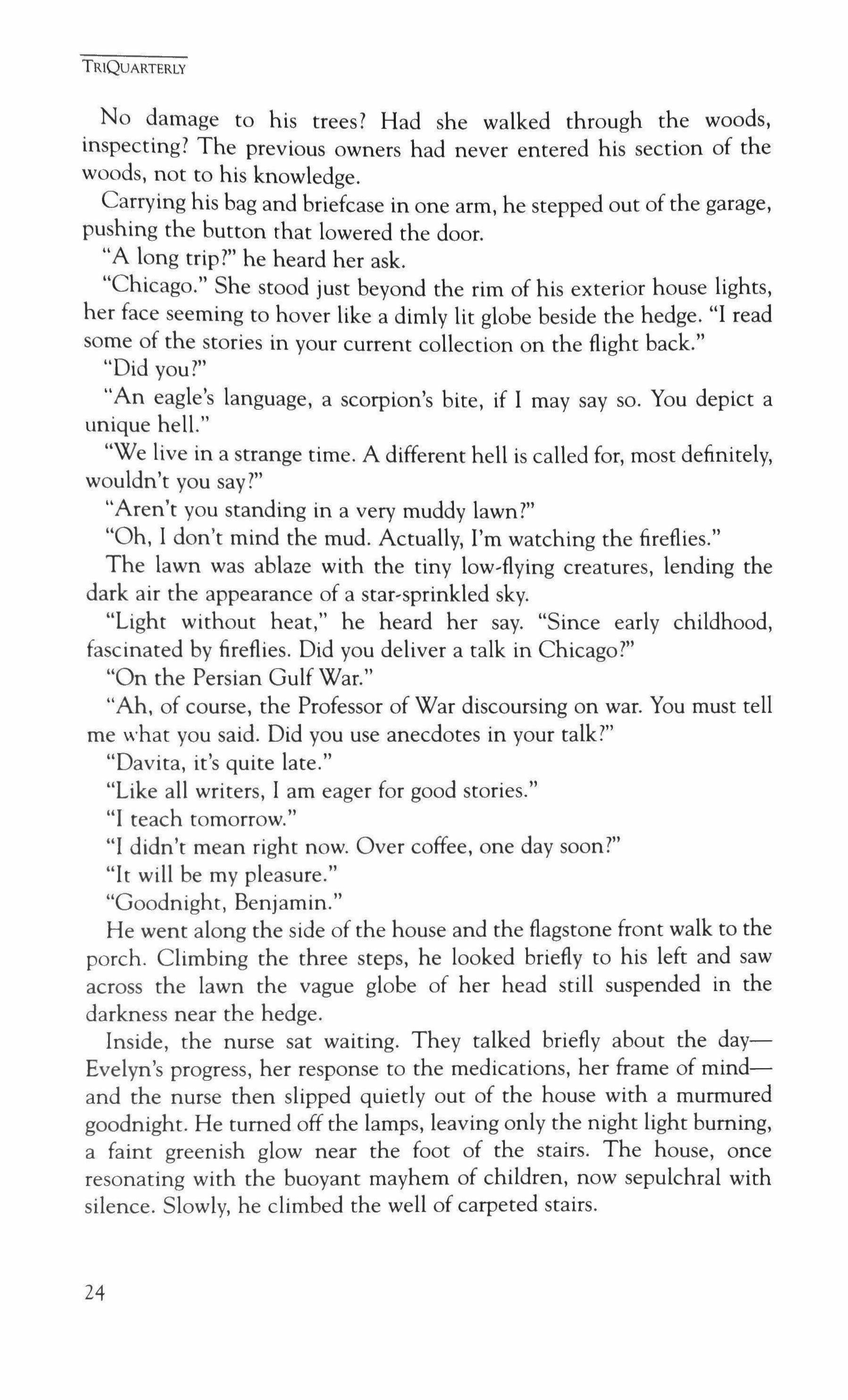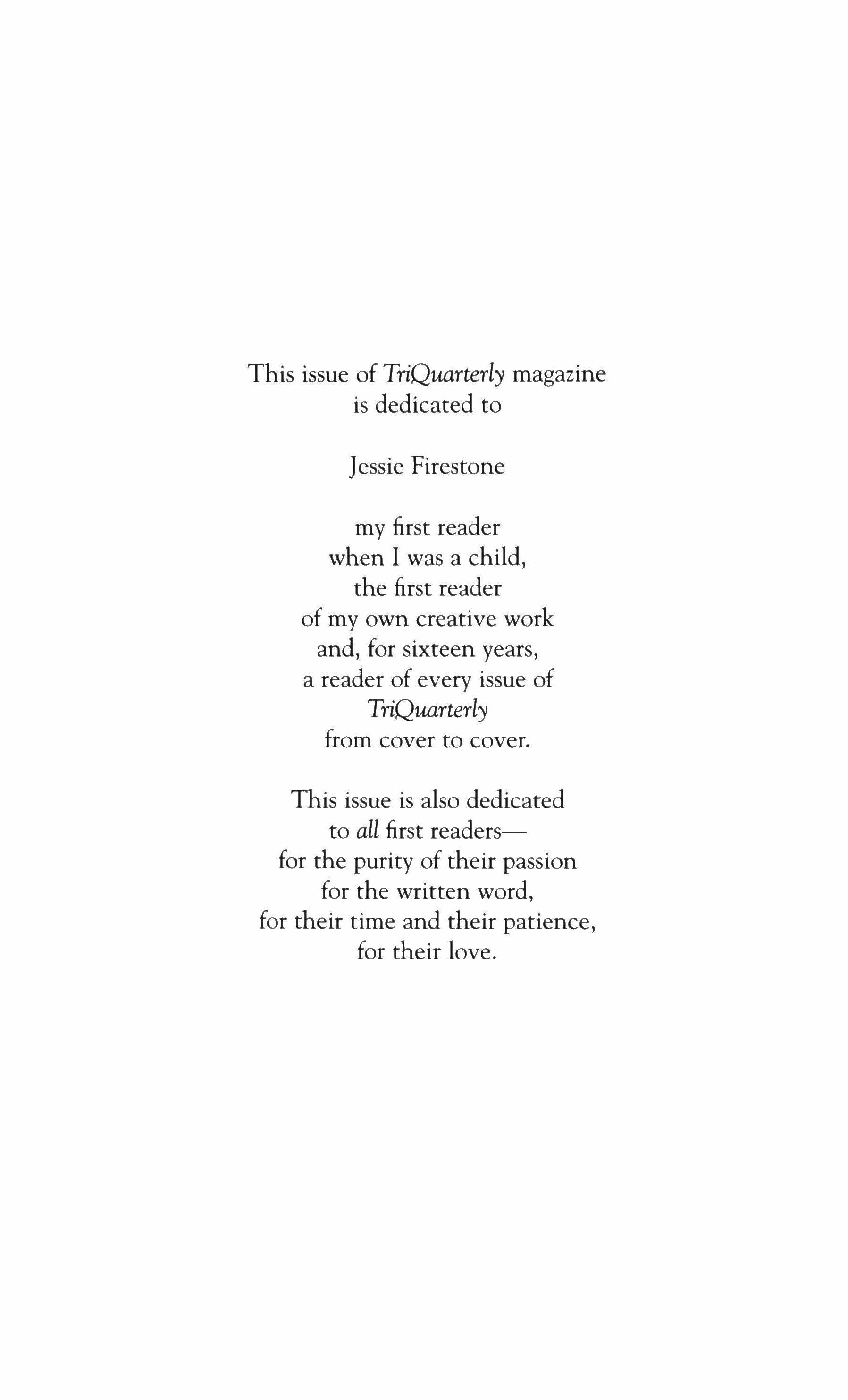This issue of TriQuarterly magazine is dedicated to Jessie Firestone my first reader when I was a child, the first reader of my own creative work and, for sixteen years, a reader of every issue of TriQuarterly from cover to cover.