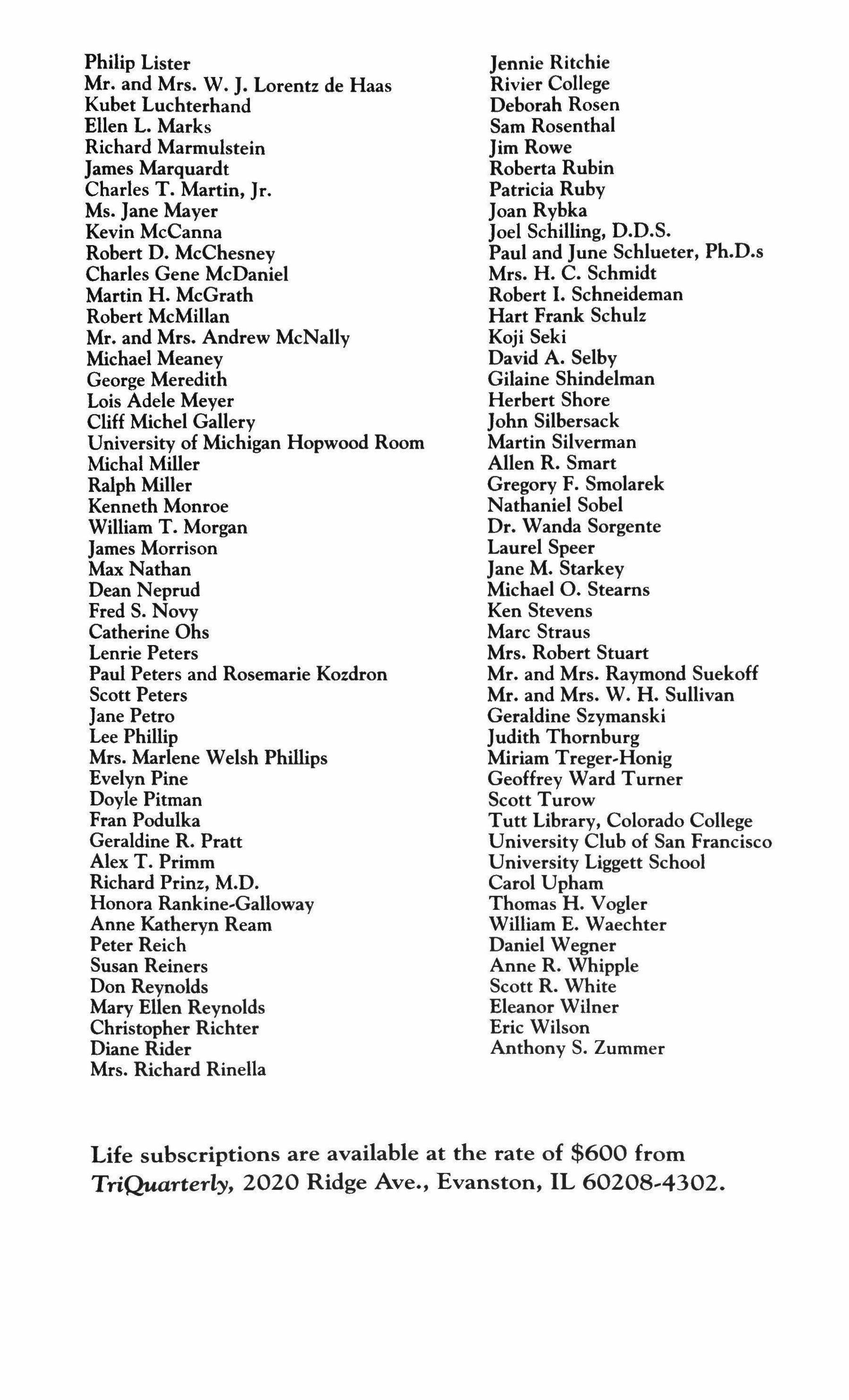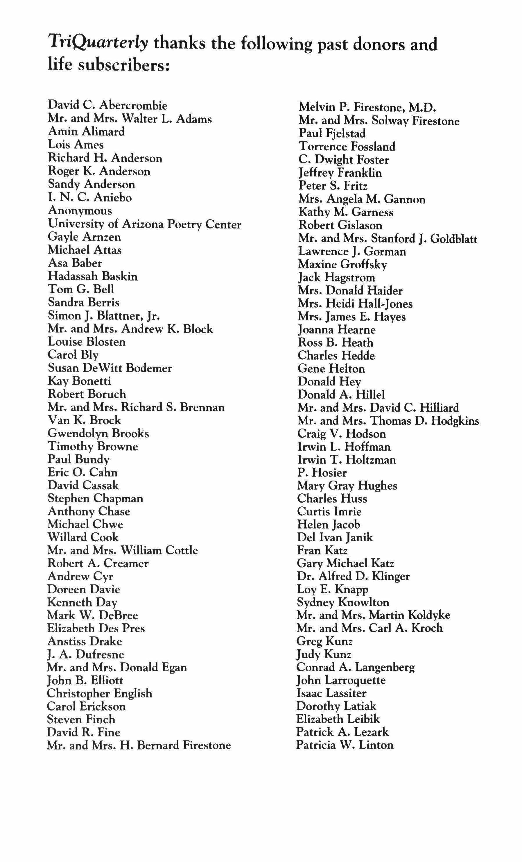 TriQuarterly also thanks the following recent donors and life subscribers: