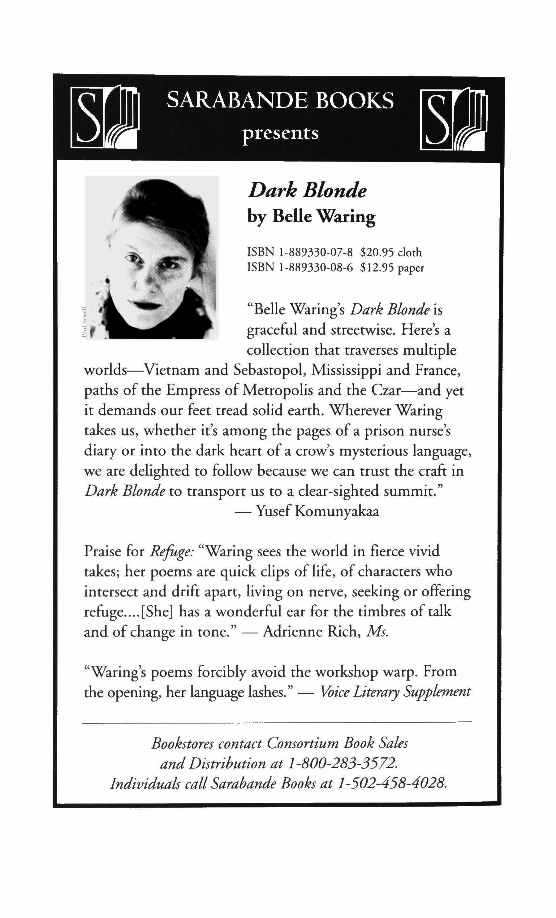 Copyright © 1998 by TnQuarterly. No part of this volume may be reproduced in any manner without written permission. The views expressed in this magazine are to be attributed to the writers, not the editors or sponsors. Printed in the United States ofAmerica byThomson-Shore; typeset by TnQuarterly. ISSN: 0041-3097.