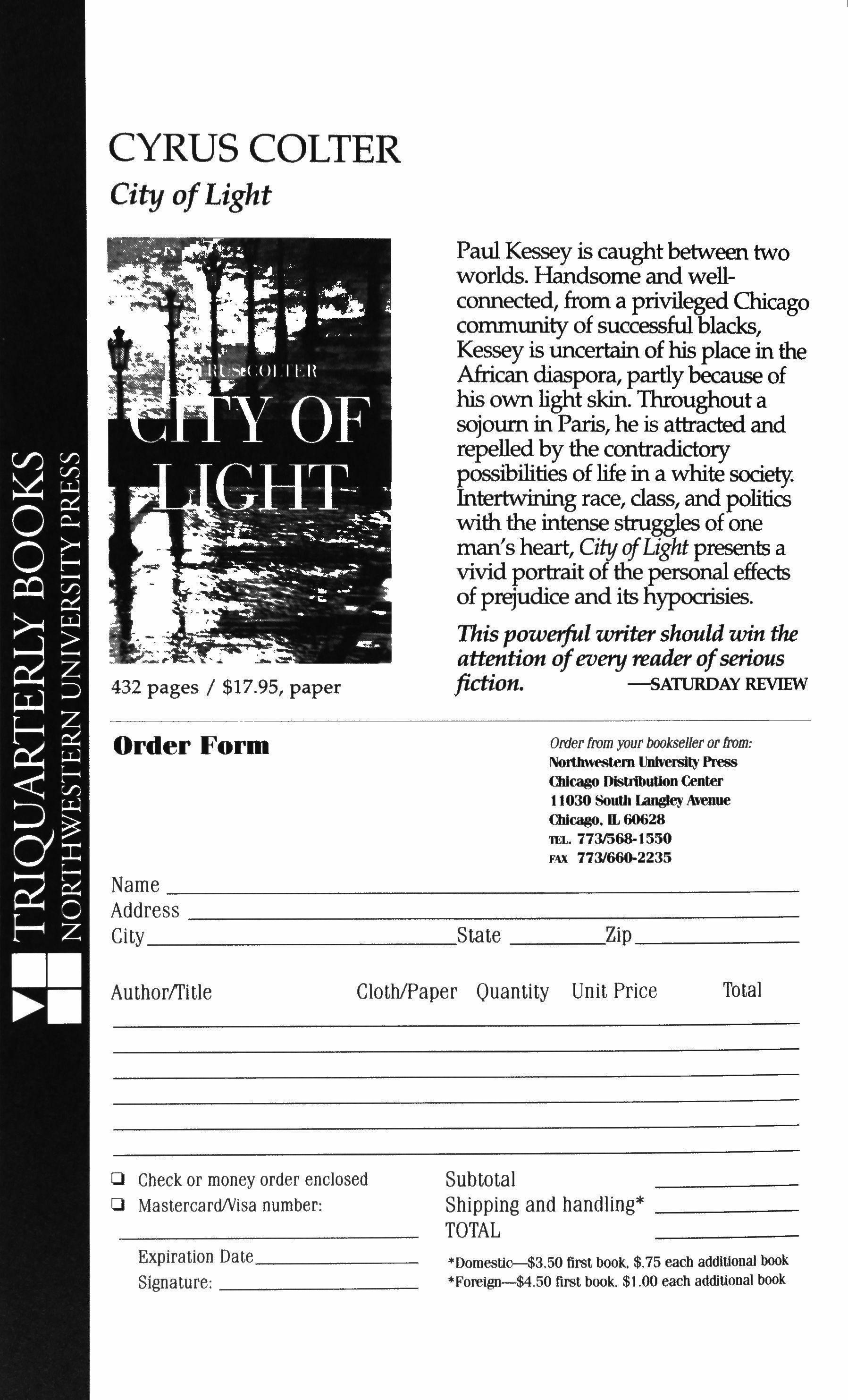 Subscription rates (three issues a year) - Individuals: one year $24; two years $44; life $600. Institutions: one year $36; two years $68. Foreign subscriptions $5 per year additional. Price ofback issues varies. Sample copies $5. Correspondence and subscriptions should be addressed to TriQuarterly, Northwestern University, 2020 Ridge Avenue, Evanston, IL 60208-4302. Phone: (847) 491-7614.