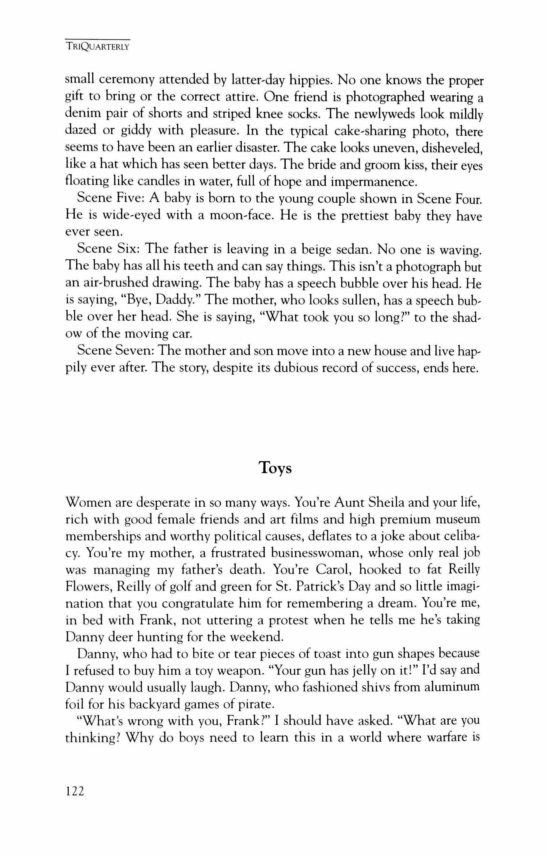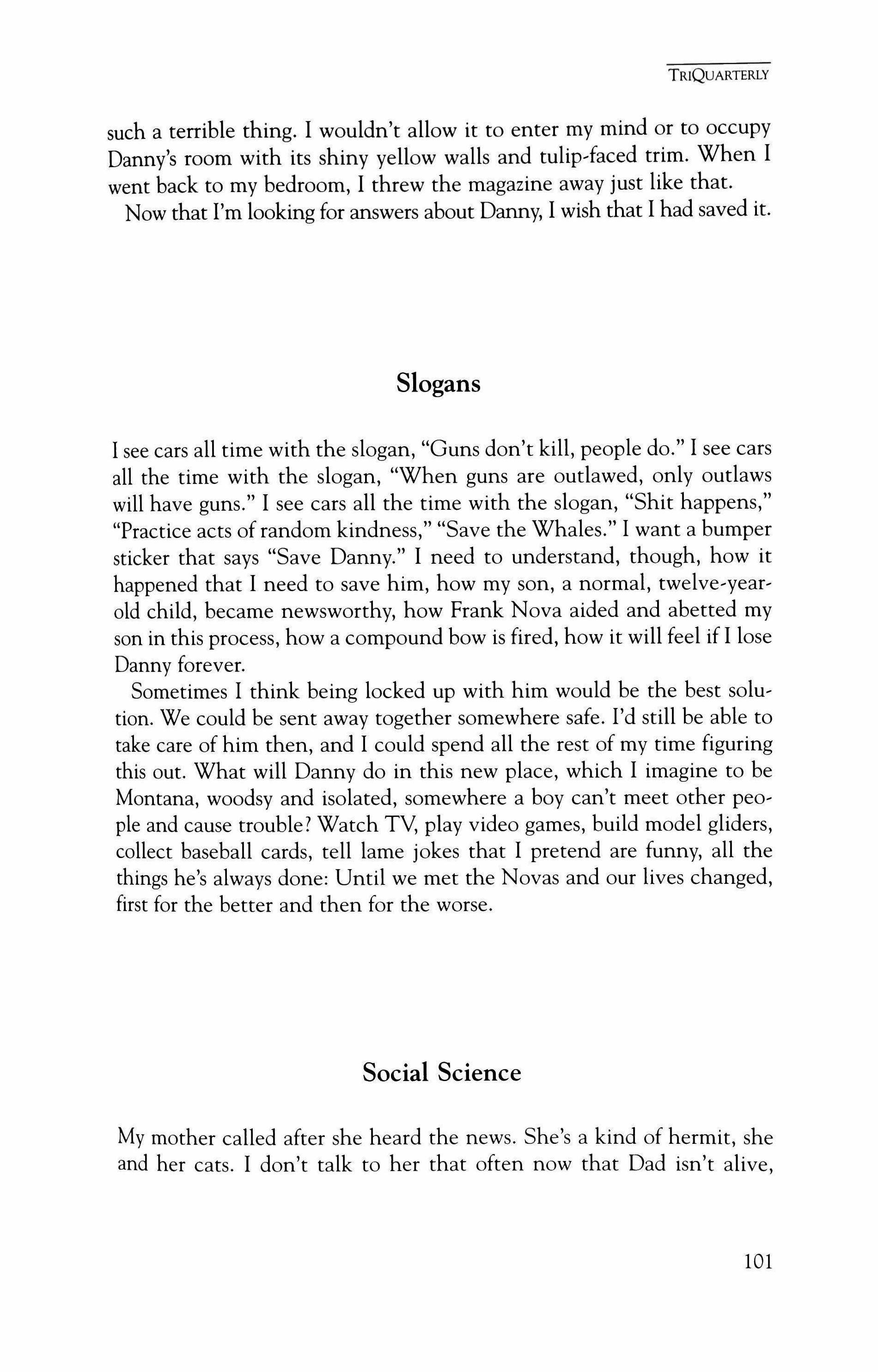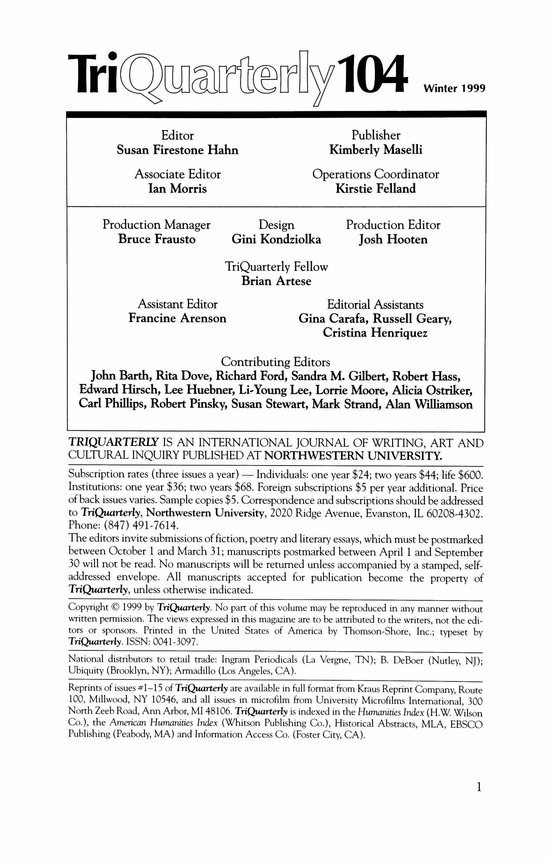 Copyright © 1999 by TriQuarterly. No part of this volume may be reproduced in any manner without written permission. The views expressed in this magazine are to be attributed to the writers, not the editors or sponsors. Printed in the United States of America by Thomson-Shore, Inc.; typeset by TriQuarterly. ISSN: 0041-3097.