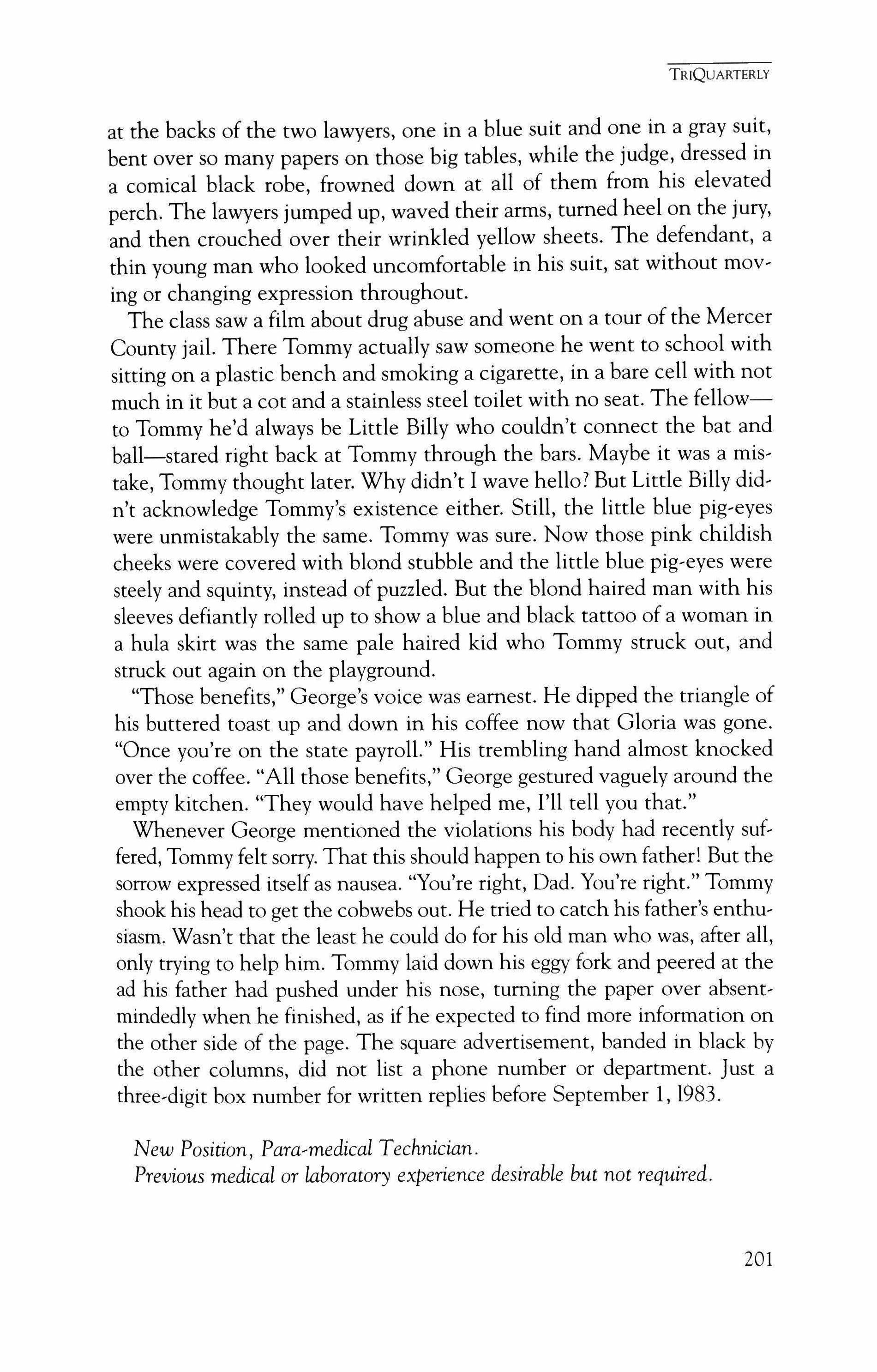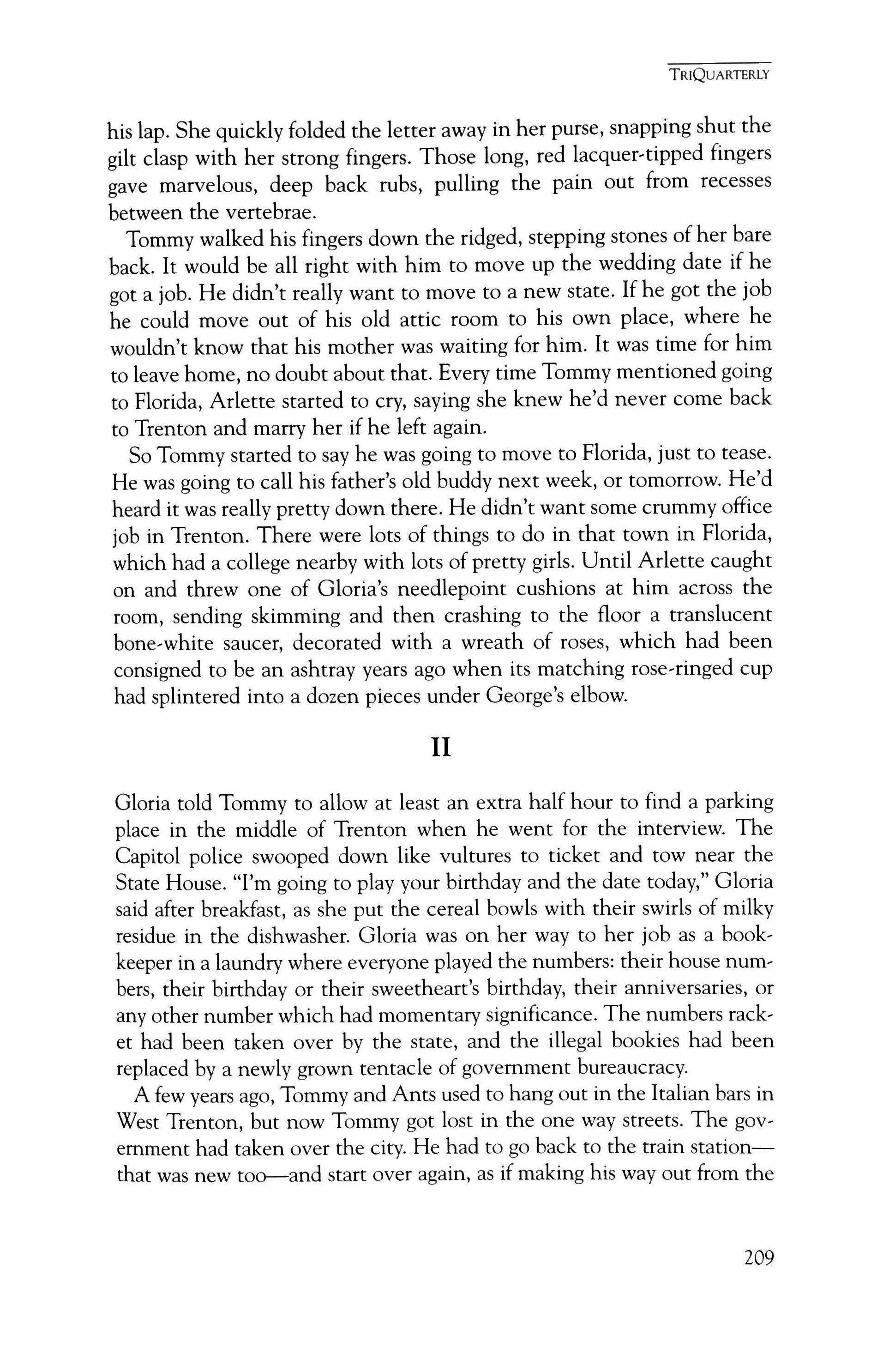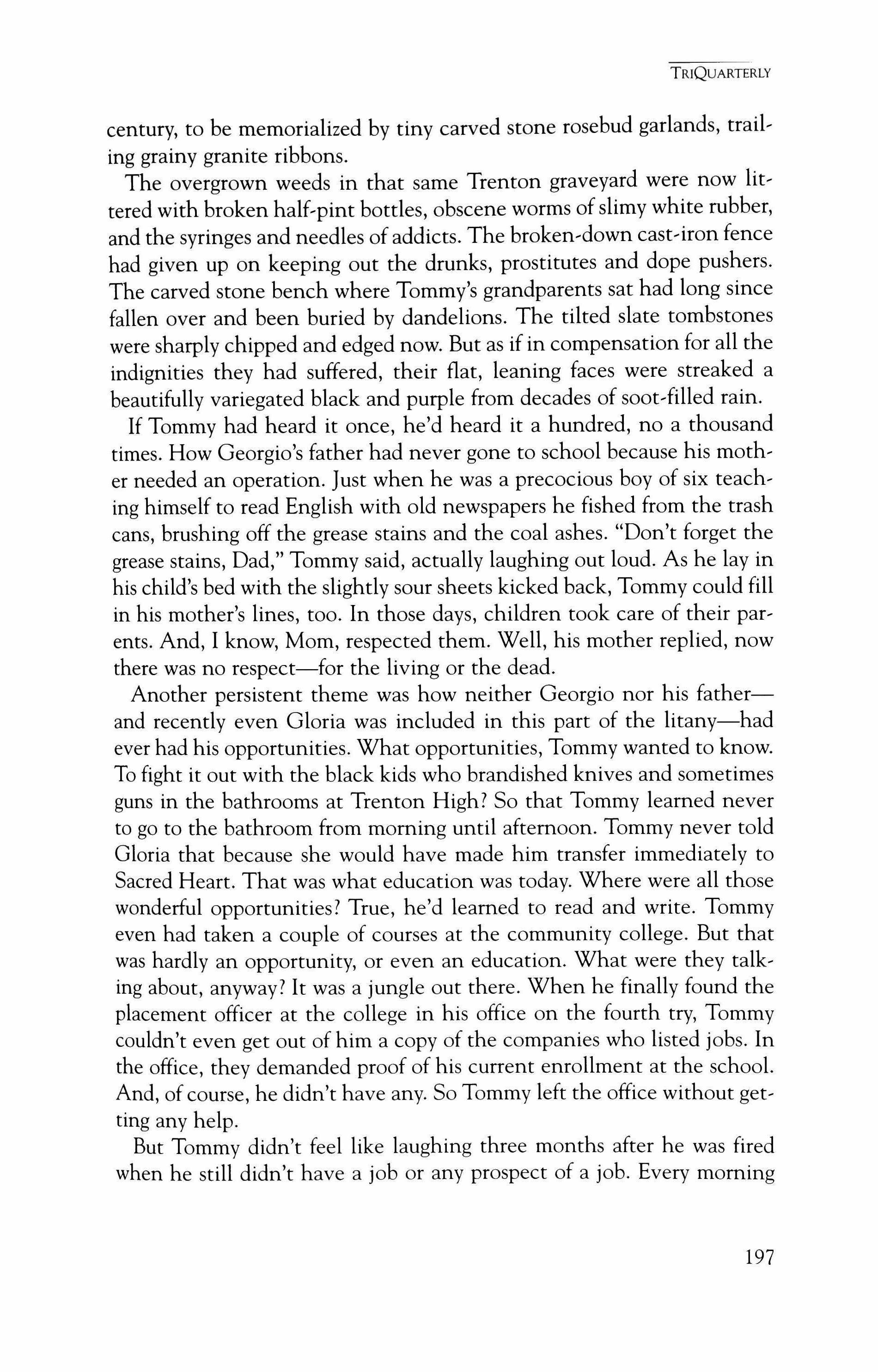 Before his accident Tommy's father had worked every day in his life. No one gave George anything, not even a job. Gloria, too. She went to her uncle's dry cleaning shop every morning, did the books in a cluttered cubicle, surrounded by a clatter and the steam of the huge cleaning machines. All around her women like herself ran up hems, replaced tat, tered linings, and laughed at the irreverent jokes of the young girls, most of them right out of high school, who stood at the cash register. These gum-chewing sassy girls dumped the dirty clothes in a bag, grumbled as they tracked down the missing shirts, and swore they weren't going to work anymore when they got married, or won the lottery. Well, Gloria and the other women didn't think they were going to work forever either. They took this job, or another one just like it, just temporarily. To payoff the Christmas bills, or to pay the doctor, or because a husband was drunk, or laid up, or in the army, or had run off, or died. Someone had to carry on. Then they just kept working for years and years after that unpaid Christmas. They too had thought that they'd quit working when they got married and had kids. But it didn't work out that way. They stayed on, developed varicose veins from standing behind the counter, just like their mothers and aunts who had worked their whole lives, too. Where were all those women who didn't work. They must be somewhere else, in another place.