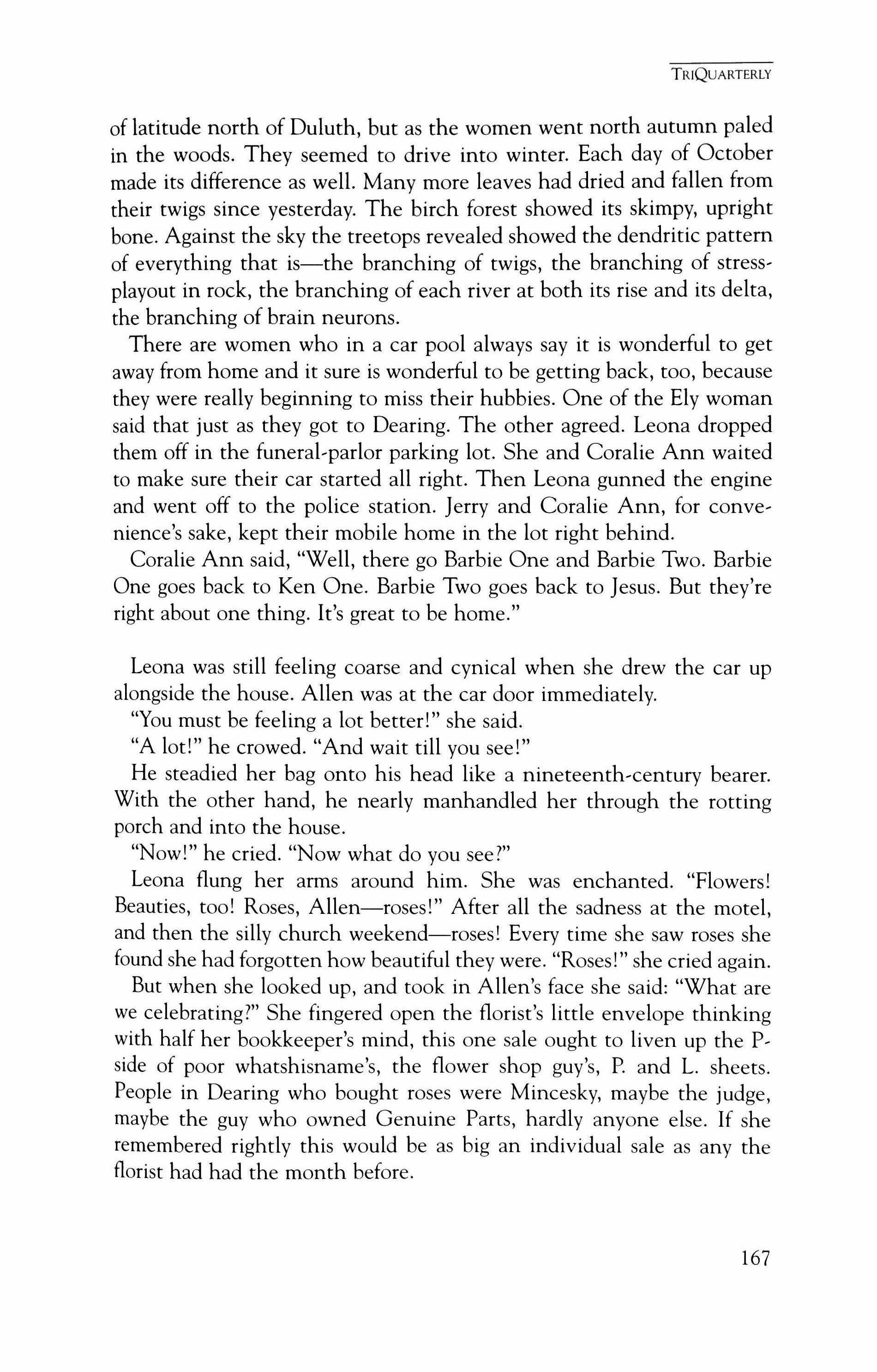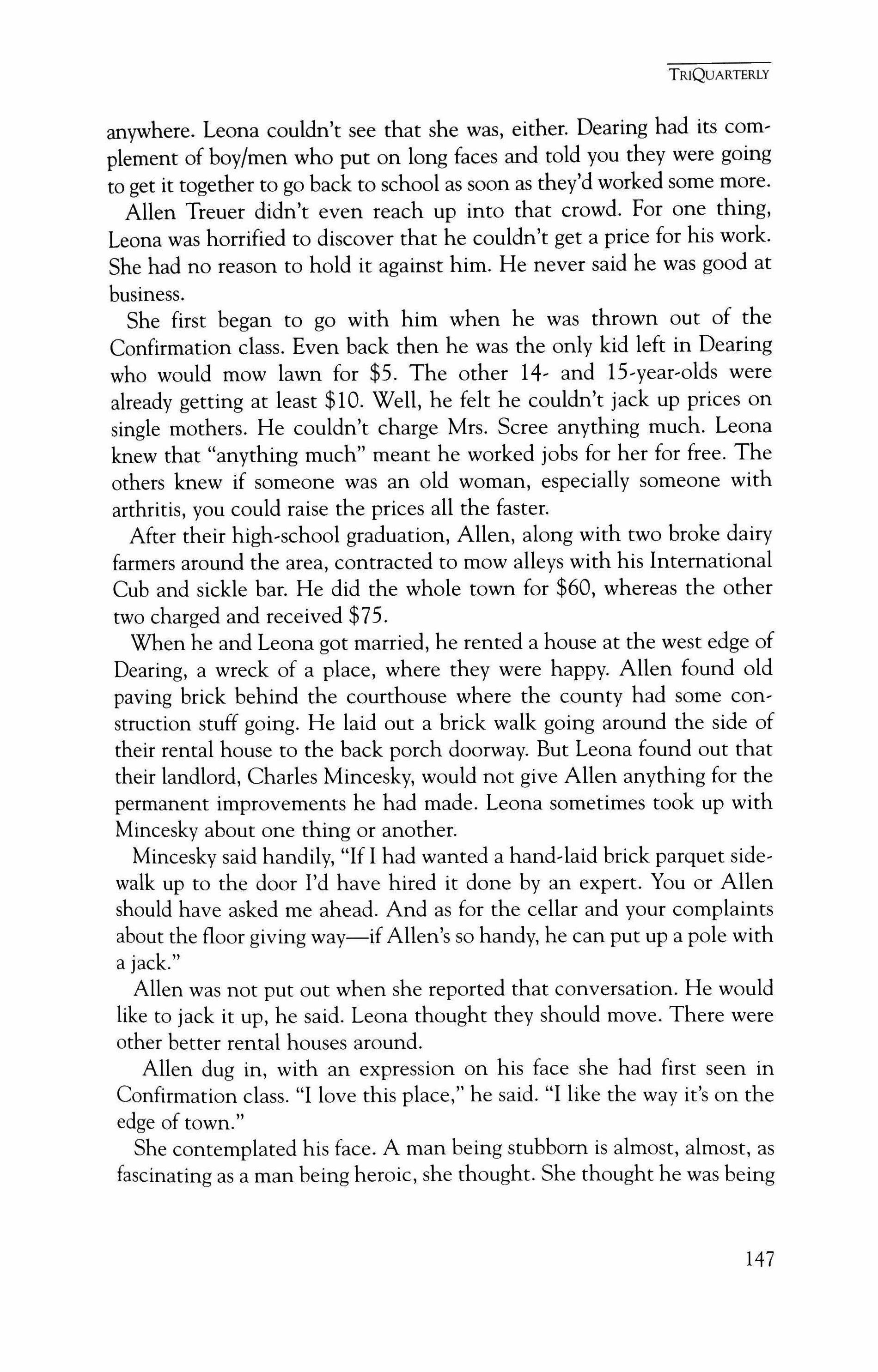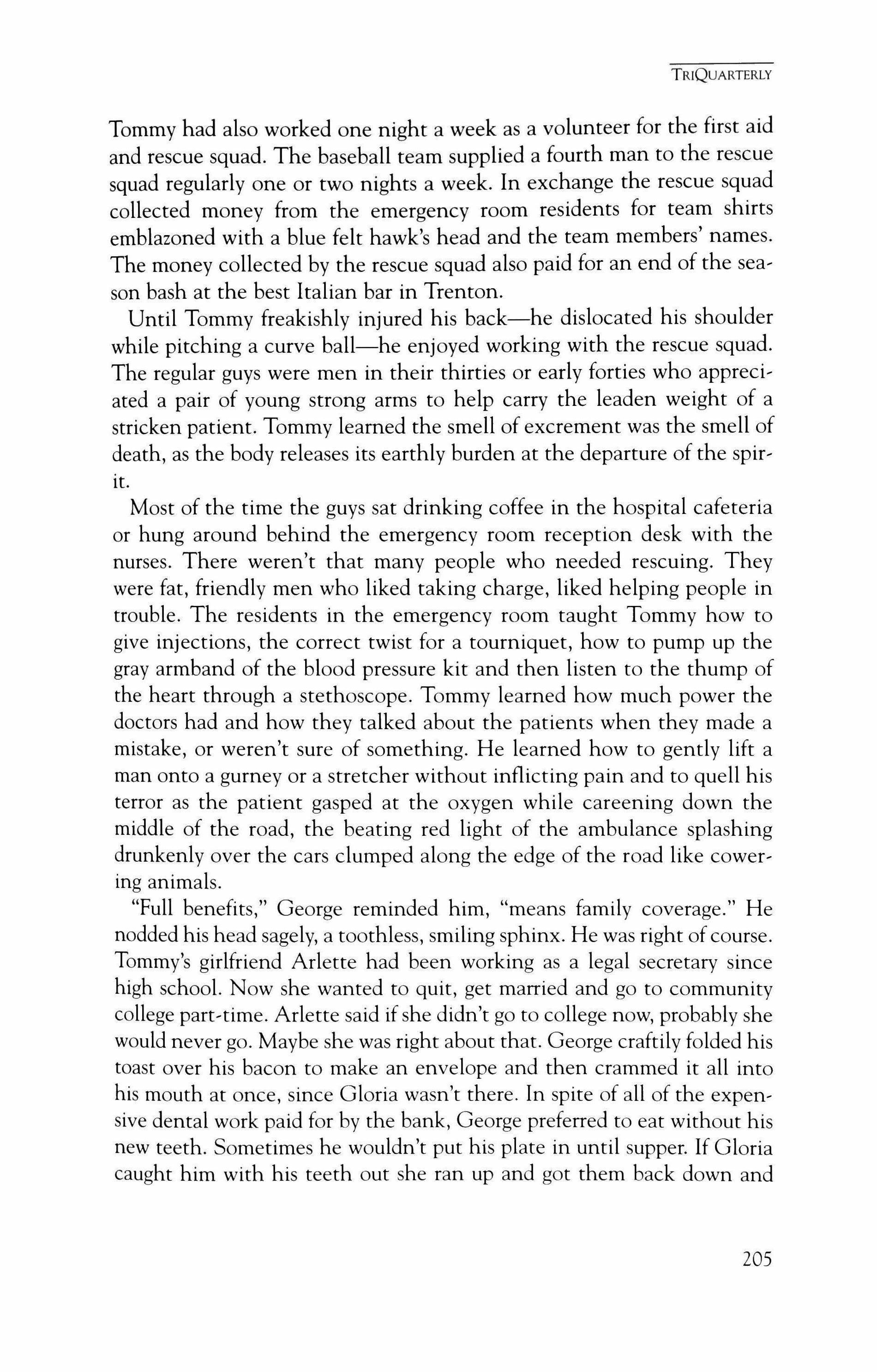 Before his accident Tommy's father had worked every day in his life. No one gave George anything, not even a job. Gloria, too. She went to her uncle's dry cleaning shop every morning, did the books in a cluttered cubicle, surrounded by a clatter and the steam of the huge cleaning machines. All around her women like herself ran up hems, replaced tat, tered linings, and laughed at the irreverent jokes of the young girls, most of them right out of high school, who stood at the cash register. These gum-chewing sassy girls dumped the dirty clothes in a bag, grumbled as they tracked down the missing shirts, and swore they weren't going to work anymore when they got married, or won the lottery. Well, Gloria and the other women didn't think they were going to work forever either. They took this job, or another one just like it, just temporarily. To payoff the Christmas bills, or to pay the doctor, or because a husband was drunk, or laid up, or in the army, or had run off, or died. Someone had to carry on. Then they just kept working for years and years after that unpaid Christmas. They too had thought that they'd quit working when they got married and had kids. But it didn't work out that way. They stayed on, developed varicose veins from standing behind the counter, just like their mothers and aunts who had worked their whole lives, too. Where were all those women who didn't work. They must be somewhere else, in another place.