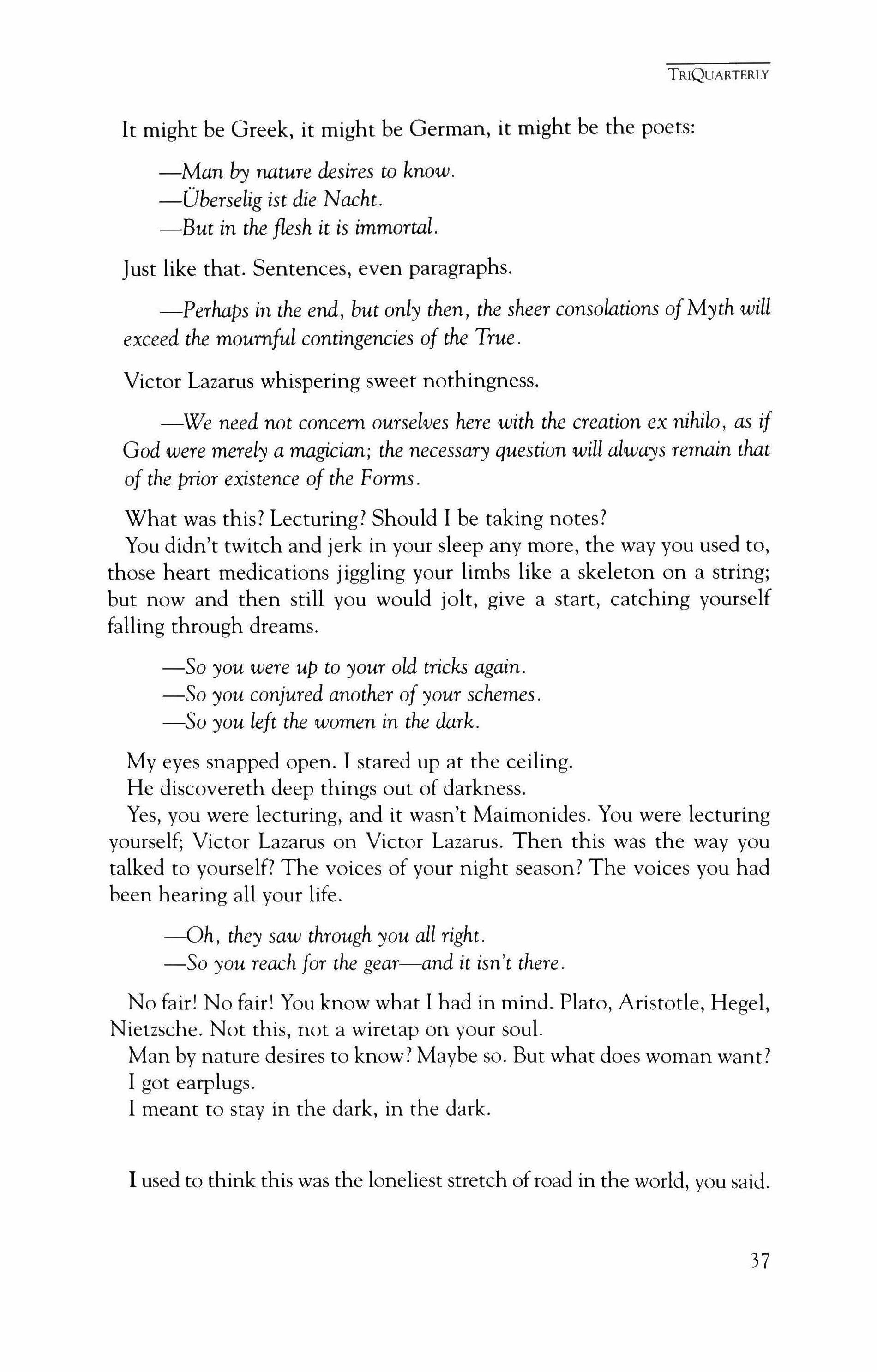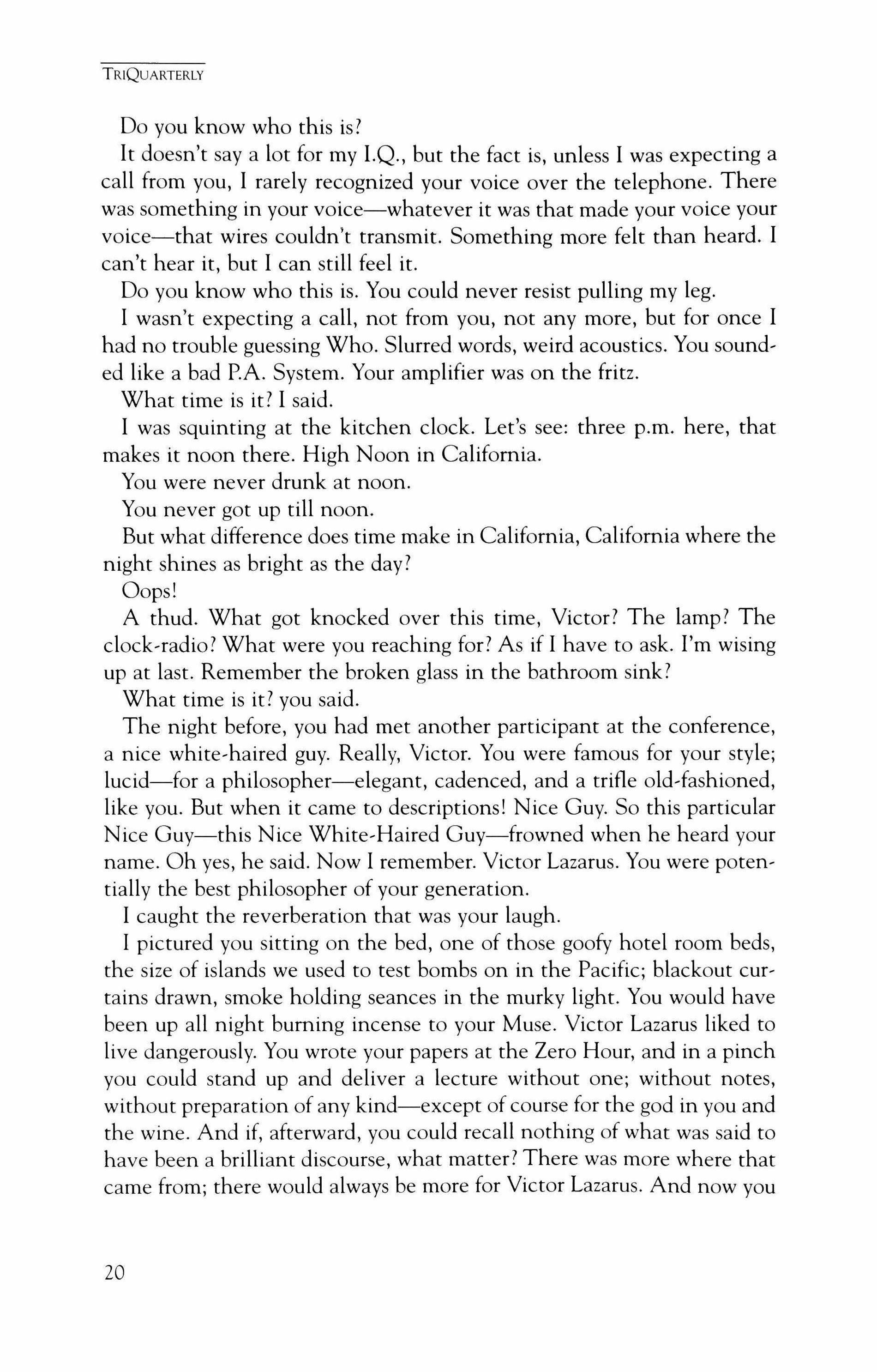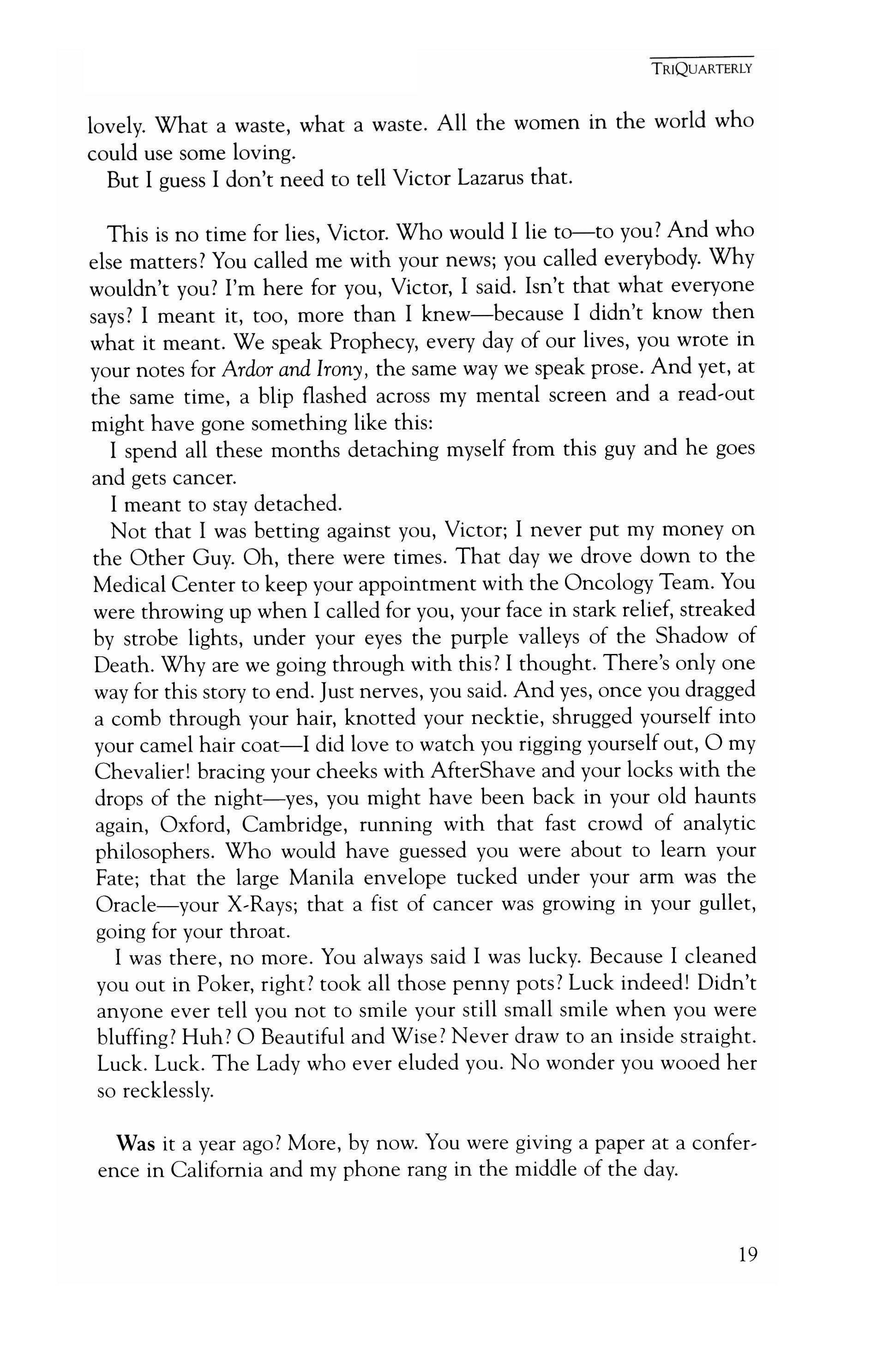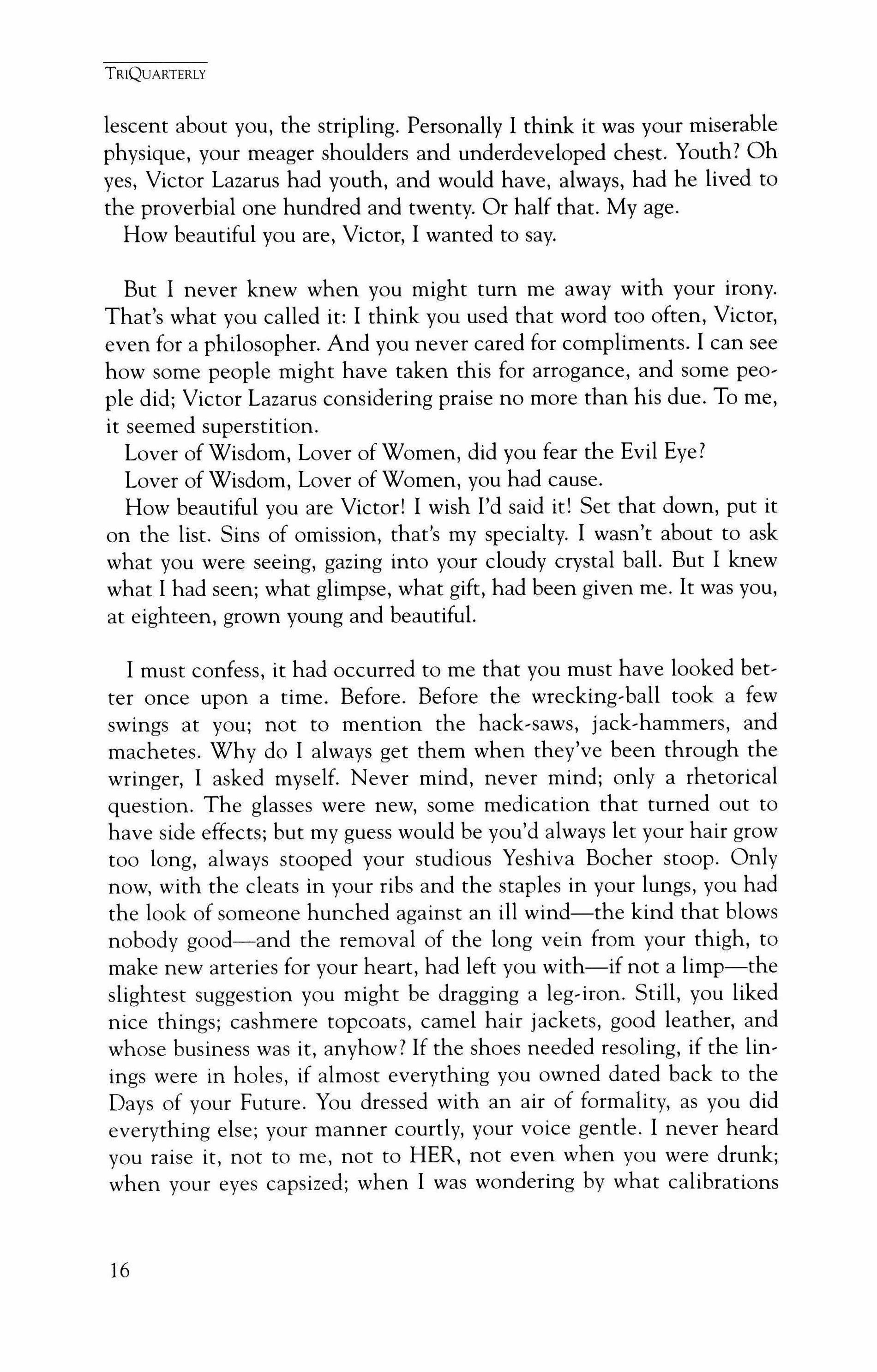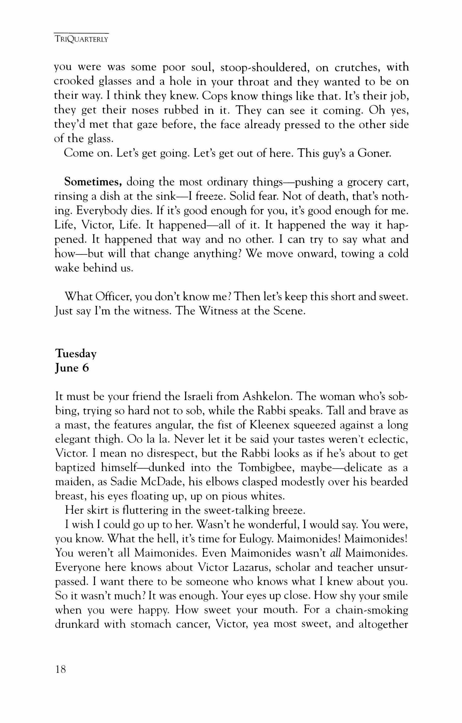 It was your wish, stated in your will, to have an Orthodox Jewish Burial. Easier said than done-as you, of all people, ought to know. And among the obstacles, not the least is the fact that you, Victor Lazarus-master of languages ancient and modem, mysteries mathematic and metaphysic, authority on Maimonides, at home in Hebrew and Greek, in the Arabic of Averroes and Avicenna, in the Latin of St. Thomas Aquinas-the great medieval mystics and philosopher-healers, reconcilers of Faith and Reason-you, Victor Lazarus, to get to the point, were not Jewish.