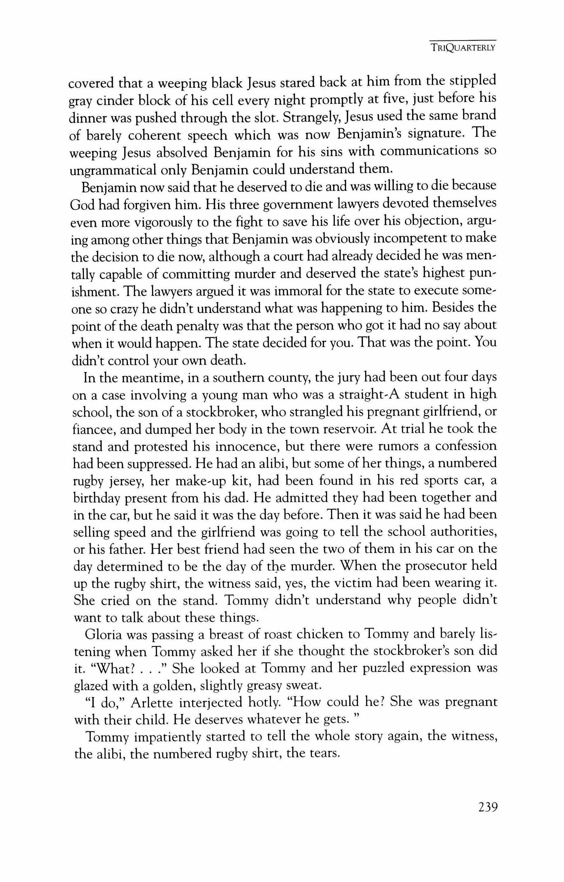 Benjamin's face had become beatific. His behavior was also beyond reproach, by any human standard. He was always gentle and gracious, even to the guards who sometimes taunted him and whispered blasphemous words as they walked by his cell. For the first time in his life, he seemed happy. It was as if he had found what he was born for. When the reporters interviewed his mother, she cried and cried. At first the TV people were fascinated by this uninhibited display of grief. Or frustration. Or bewilderment. Or confusion. But they soon became bored with her tears, whatever their source, and with her repeated, trembling assurances that it was all in the hands of the Lord, although she and her son believed in widely disparate gods. Once more the legislators, both those for and against the death penalty, were the object of media attention. After all, it was August and hot and most of the people in the state who ordinarily