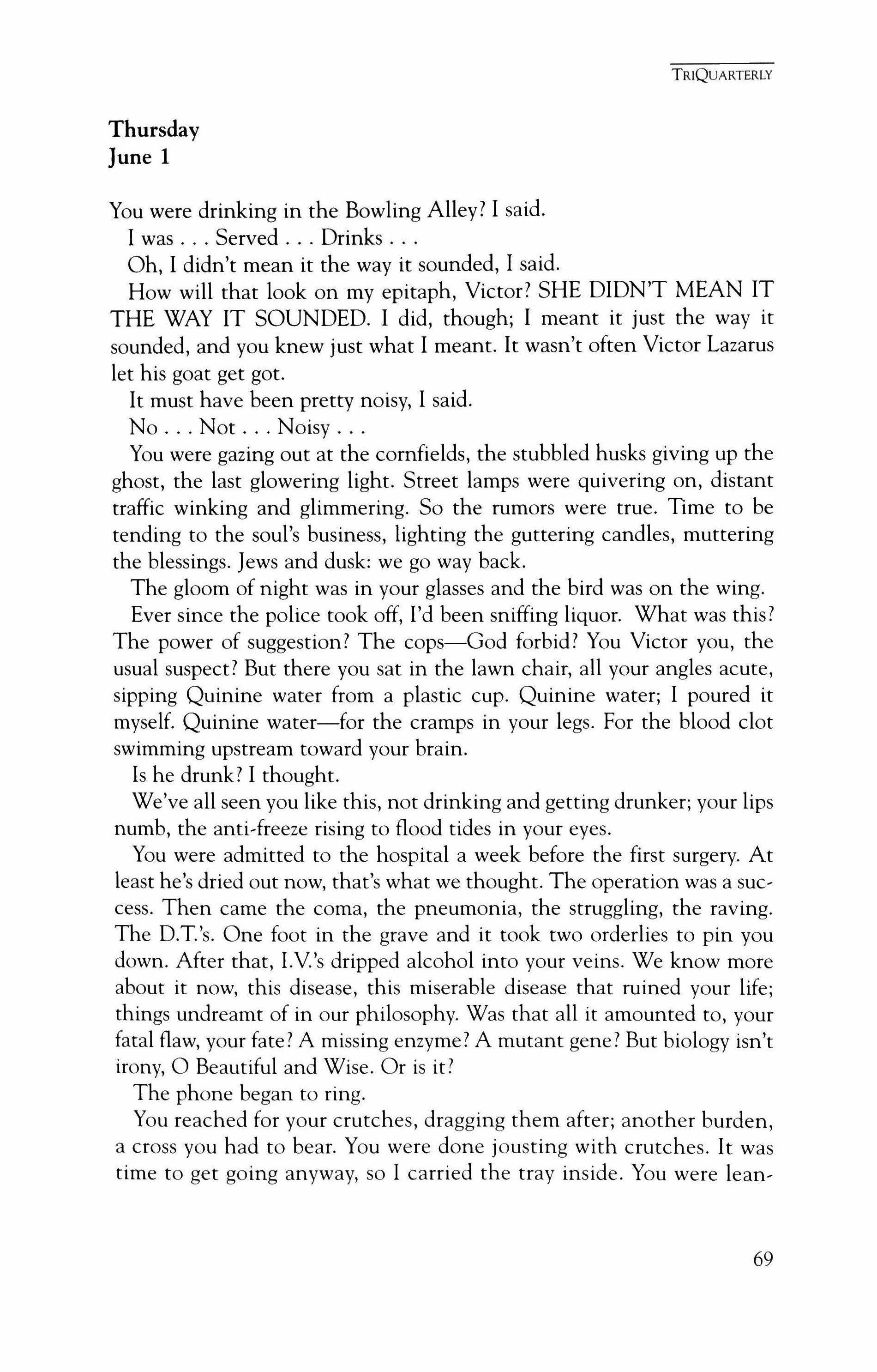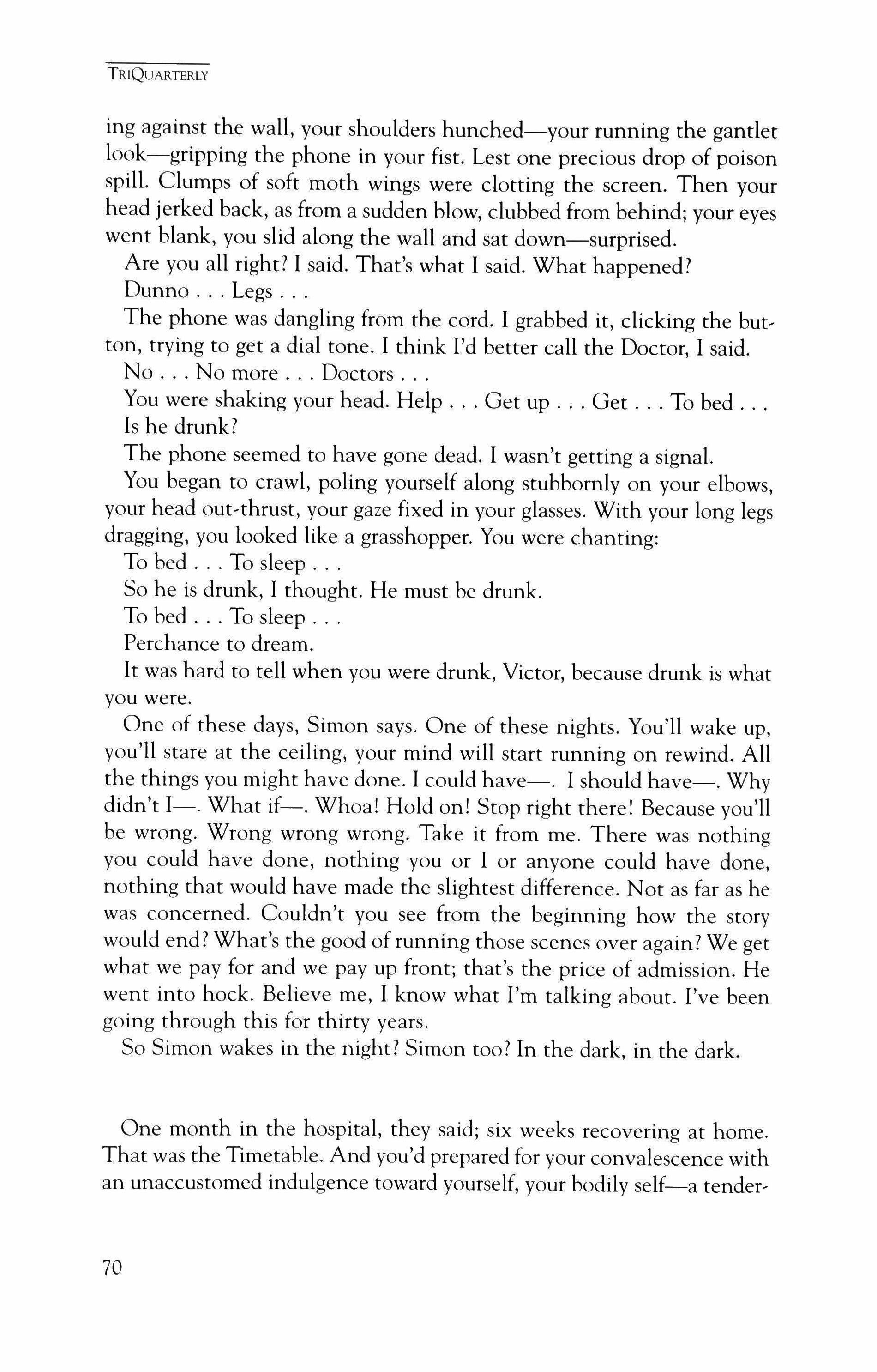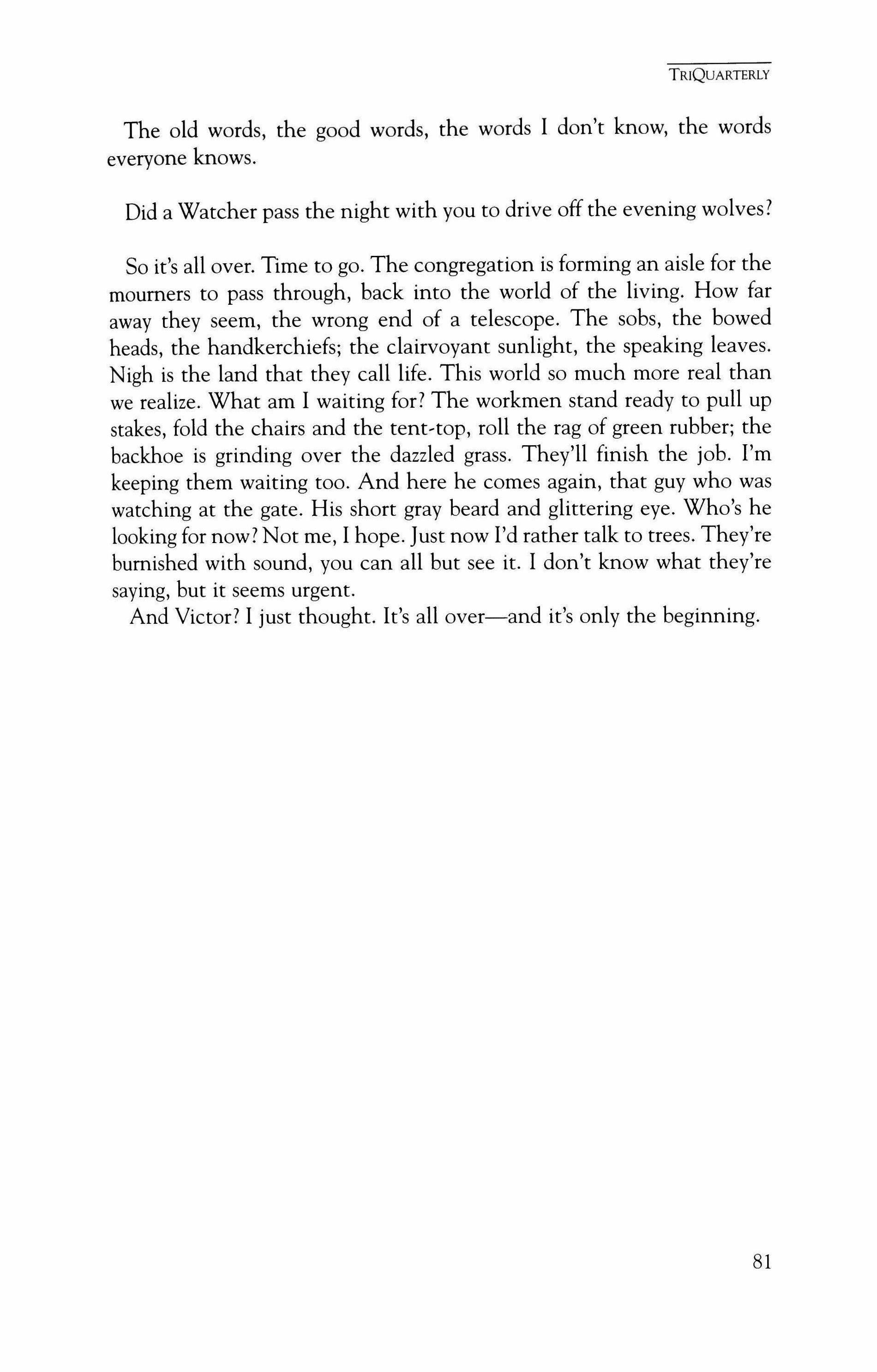 started off with a reading from your work. I have to apologize, Victor, I couldn't keep my mind on it. Someone was sobbing out loud. Already? I thought. And the trees, the tent-top, the rug of green Astroturf, the mourners seated all in a row. Ben squirming in his necktie and skullcap, the soles of his gym shoes stuck together, his blue eyes wandering, scared. How long is this grownup stuff gonna last? His grandmother-your mother-leans down, her lips to his ear, his fist in her fist. Easy to guess what she's saying. Her head trembles, as from a long habit of chiding. How little, how aged, she is today, her white hair brittle, her face behind dark glasses bolted and barred. Next your half brother, staring boldly in front of him, a hand on either knee, as if he's been told not to blink. Then your two stepsisters. Last, an empty chair.