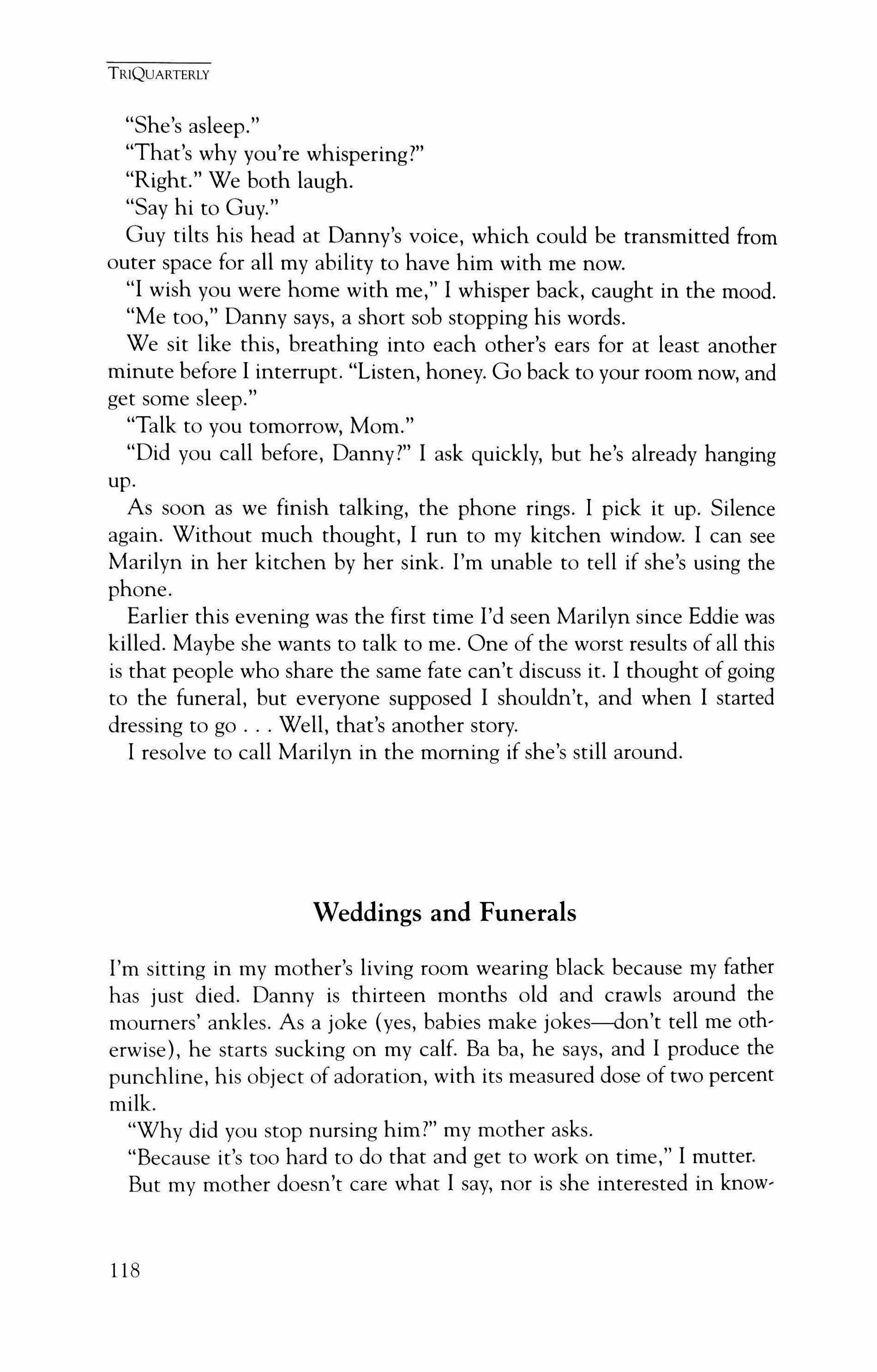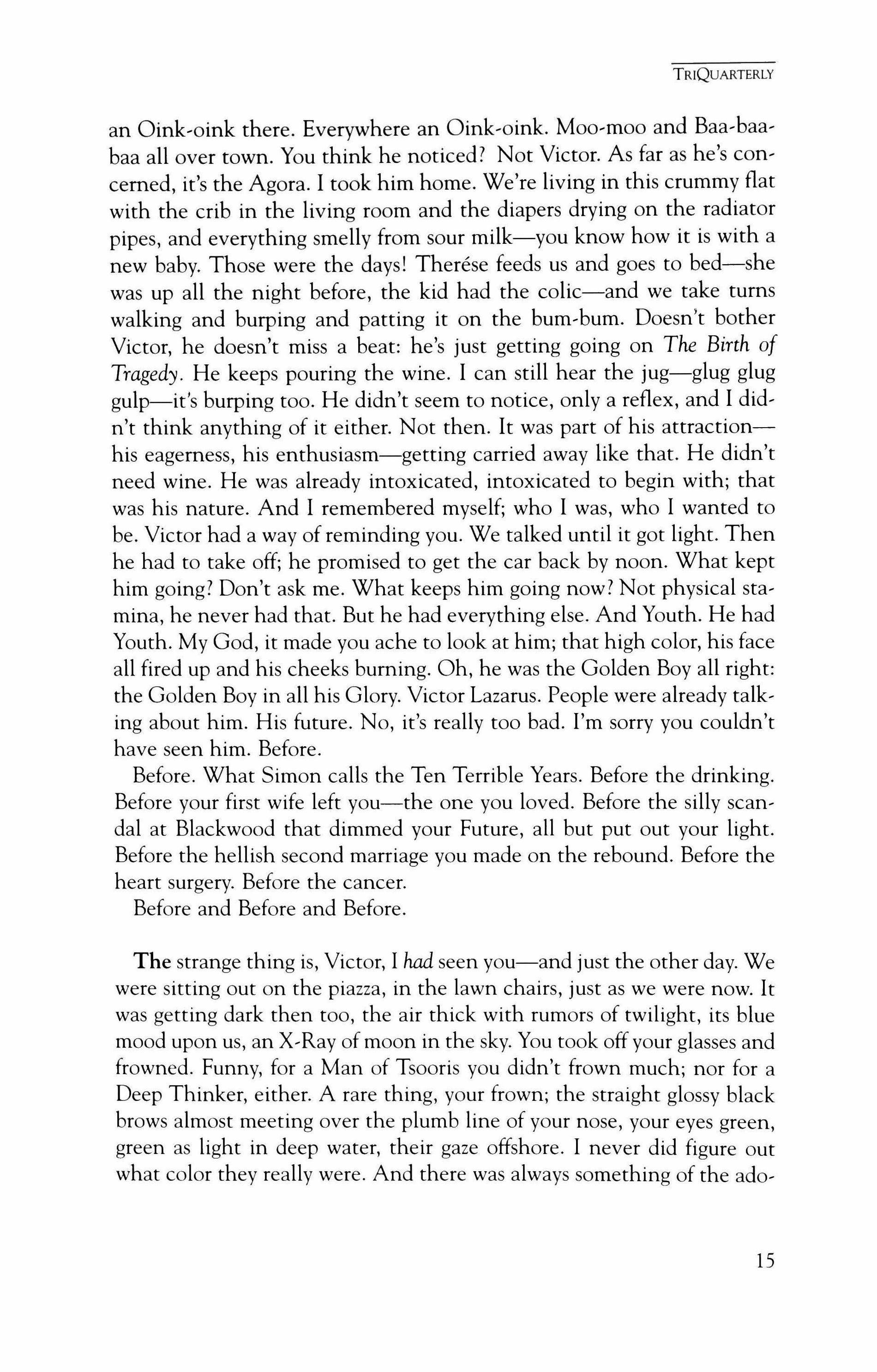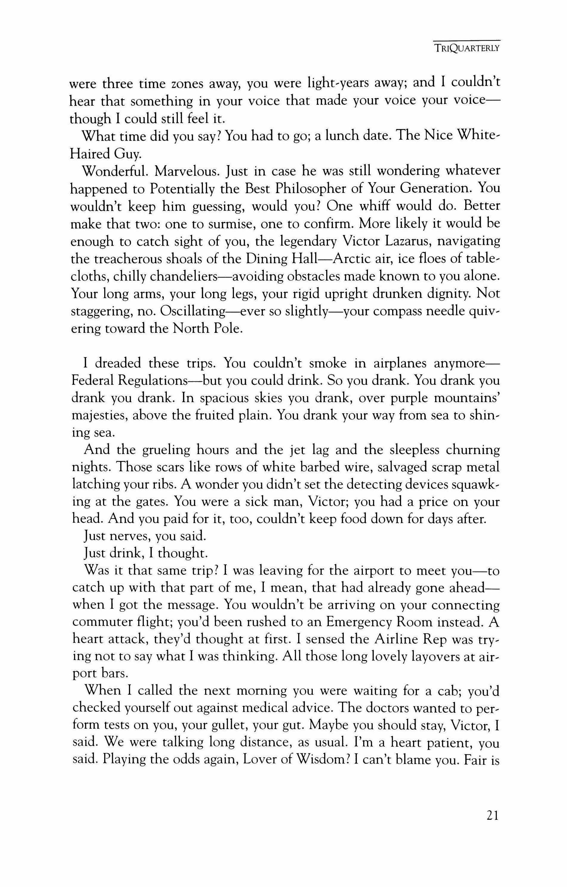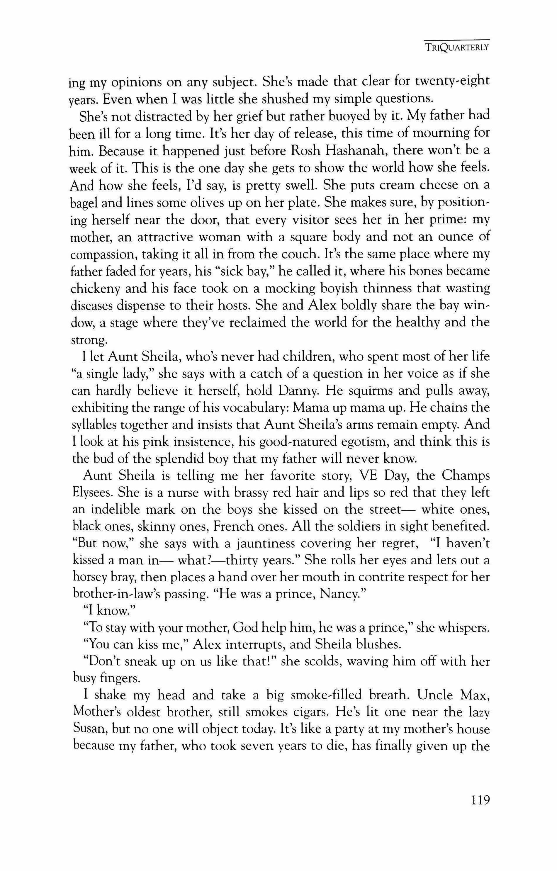 started off with a reading from your work. I have to apologize, Victor, I couldn't keep my mind on it. Someone was sobbing out loud. Already? I thought. And the trees, the tent-top, the rug of green Astroturf, the mourners seated all in a row. Ben squirming in his necktie and skullcap, the soles of his gym shoes stuck together, his blue eyes wandering, scared. How long is this grownup stuff gonna last? His grandmother-your mother-leans down, her lips to his ear, his fist in her fist. Easy to guess what she's saying. Her head trembles, as from a long habit of chiding. How little, how aged, she is today, her white hair brittle, her face behind dark glasses bolted and barred. Next your half brother, staring boldly in front of him, a hand on either knee, as if he's been told not to blink. Then your two stepsisters. Last, an empty chair.