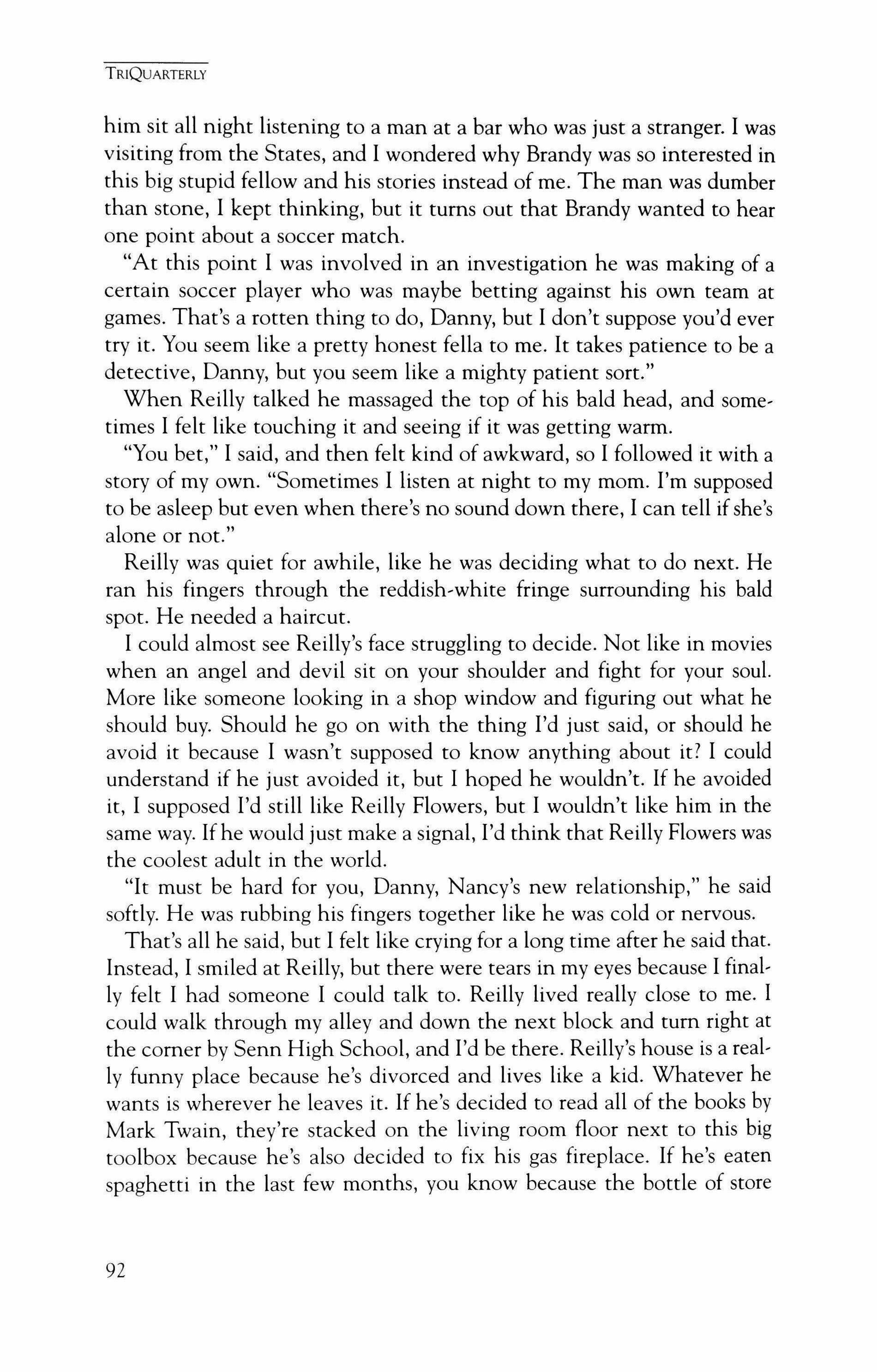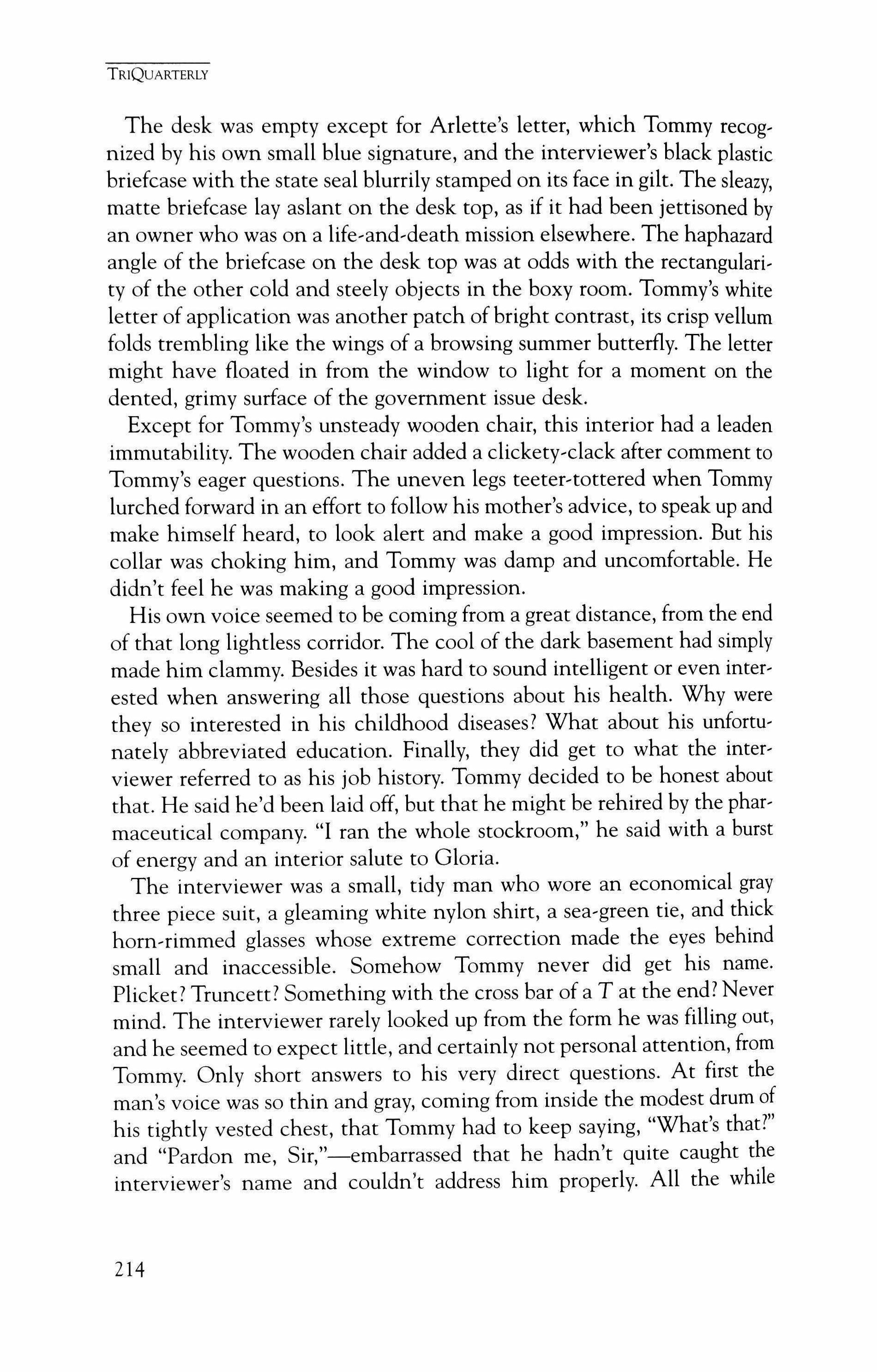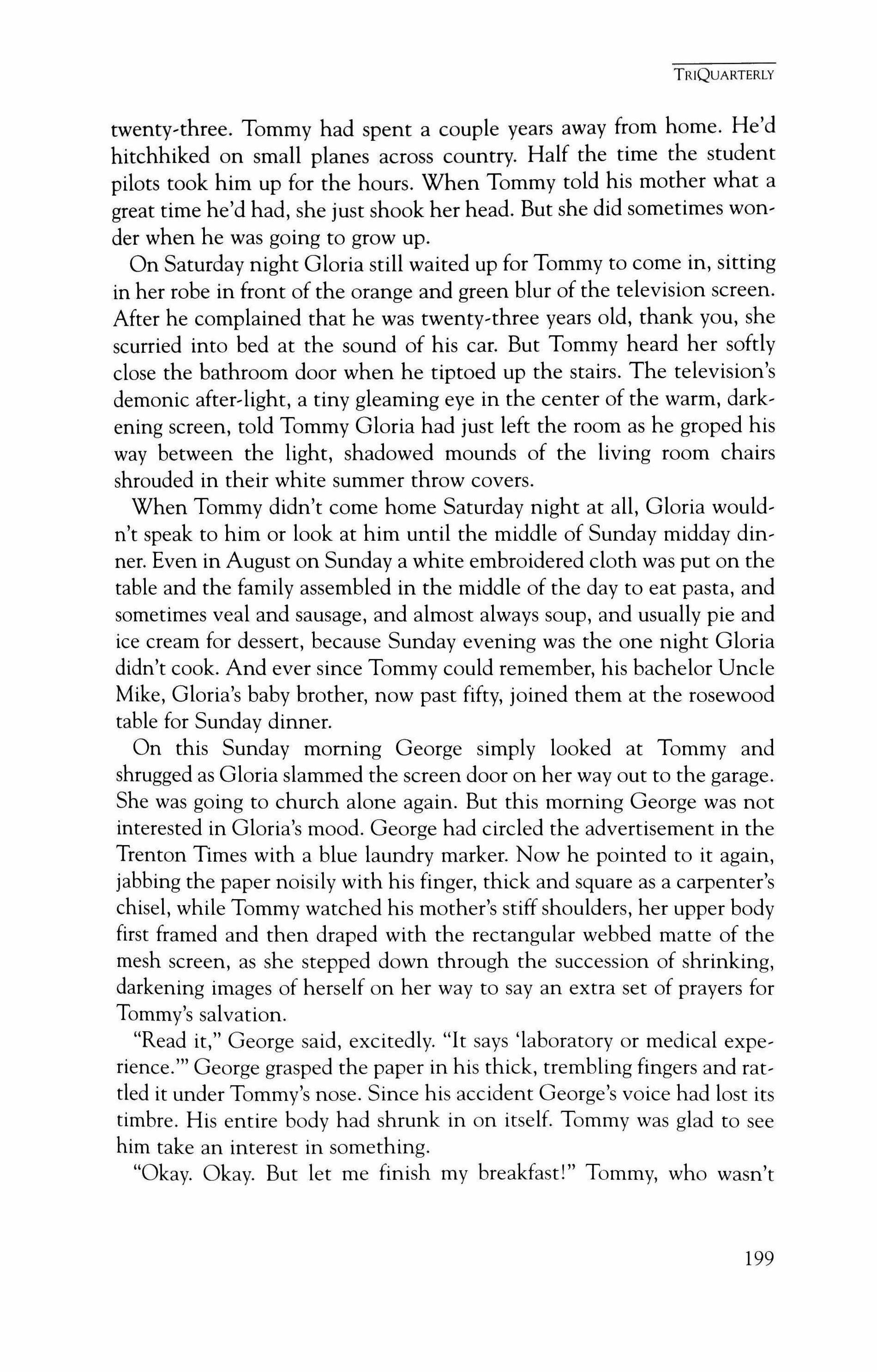 Tommy shut the bedroom door and sat at the plastic kitchen table, where the black face of the oven stared back at him unblinkingly. He took a beer from the refrigerator without getting up and put his head down on the table, his hand soothed by the cool, wet bottle. No more questions tonight.