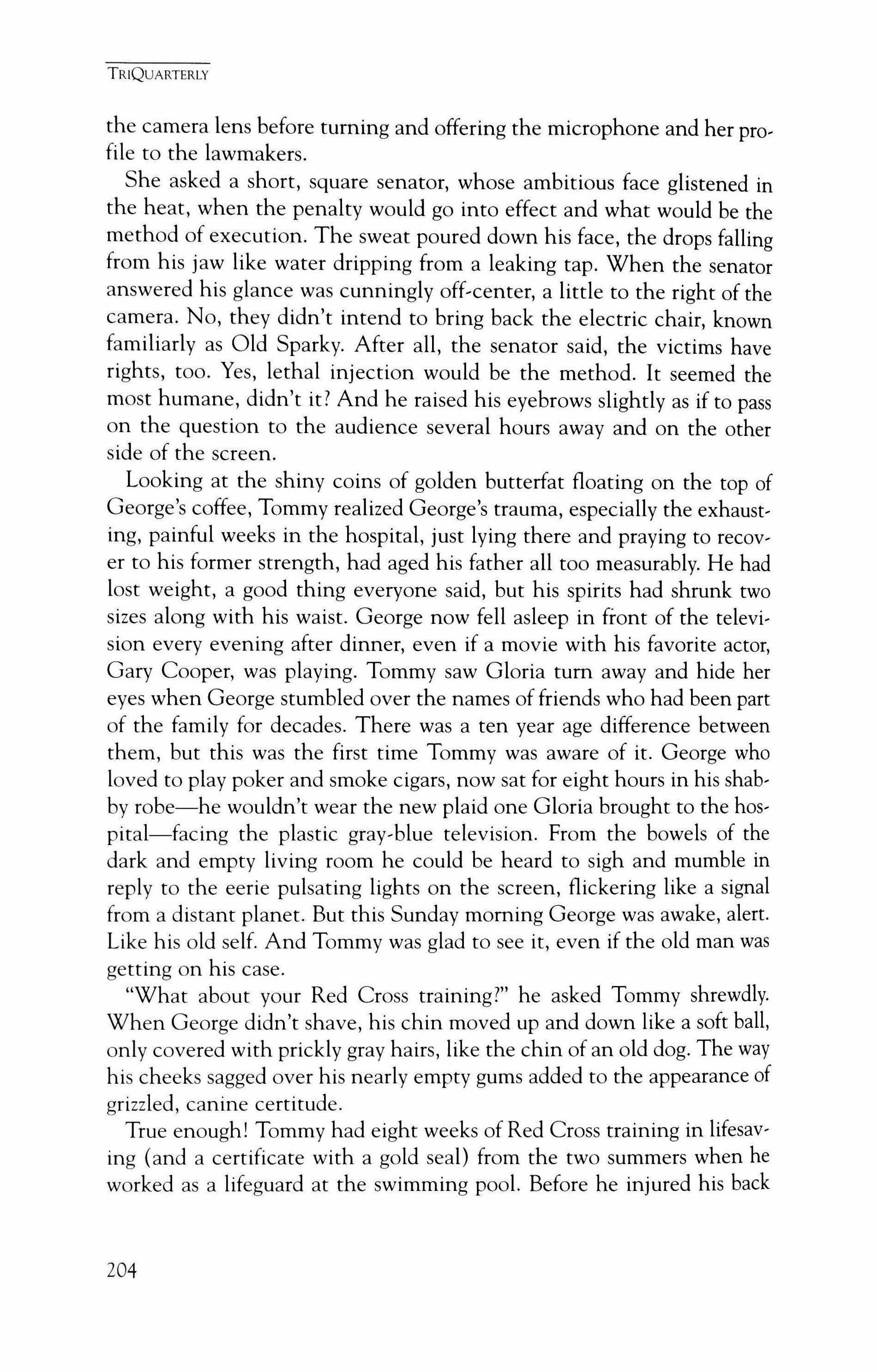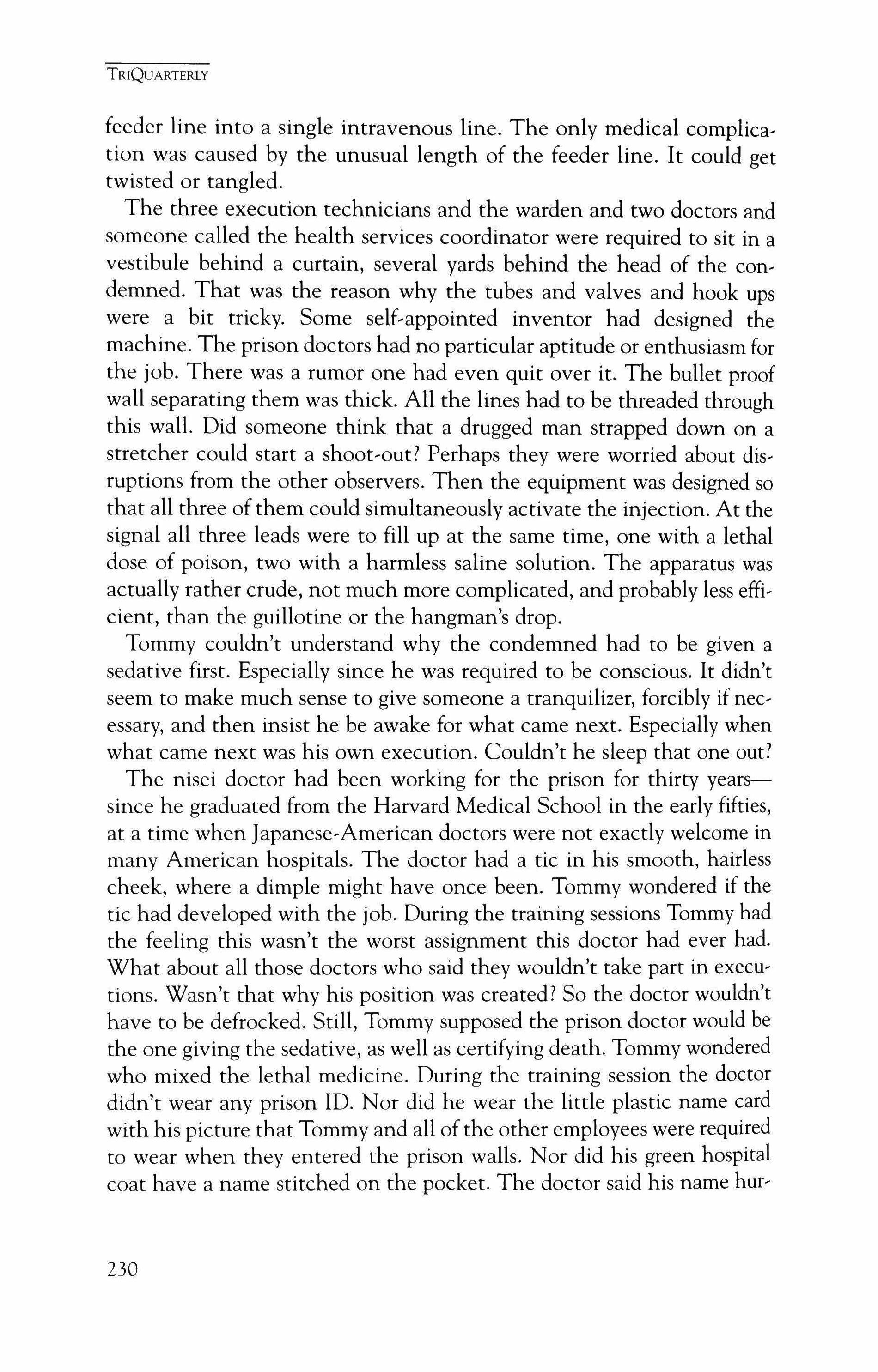 The nurse looked up at him with large dark eyes, first surprised, then with hatred. She rubbed herself against him painfully and then turned and sauntered away down the corridor, showing him her thick back and broad behind. Tommy didn't even know her name, but he remained in a state of excitement all day. When he came home he shouted at Arlette, even though she had gotten out of bed especially to prepare him a favorite dinner: pork chops, fresh com, and sliced beefsteak tomatoes interlocked with rings of red Bermuda onion. She had even cooked Tommy a lemon meringue pie. This day had been an active day for her. Tommy forgot what was like to be unemployed, not to have anywhere to go in the morning. The rhythm of work made the weeks fly. Tommy liked coming to work, and he no longer thought about Alaska. He didn't even miss his old friend Ants any more. Preparations for the rehearsal had begun. The health care supervisor wanted to do a dry run of the procedures. Not that anything was imminent. But just to be prepared. To make sure all the personnel were in place and everyone knew what to do. Mostly, it was waiting. Waiting for someone else to make a decision. Waiting for the last tum down from the last court. Waiting for the phone call from the governor which would not come, waiting for the condemned to be wheeled in, waiting for the signal to give the injection. The whole process was nothing more than one big wait. Tommy was being paid thousands of dollars to wait to do an act which would take a few seconds, at most. Killing took so little time, especially in comparison to saving life. It was a lot easier. The pages of regulations, the special staff with their functions described in high flying, obfuscating language, the supposedly elaborate equipment and the specially designated facilities were a bureaucratic smoke screen. What was to be done was really very simple. It was the pretense that it was something other than simple which was complicated and hard to understand. Why bother? Why not just say what it was?
