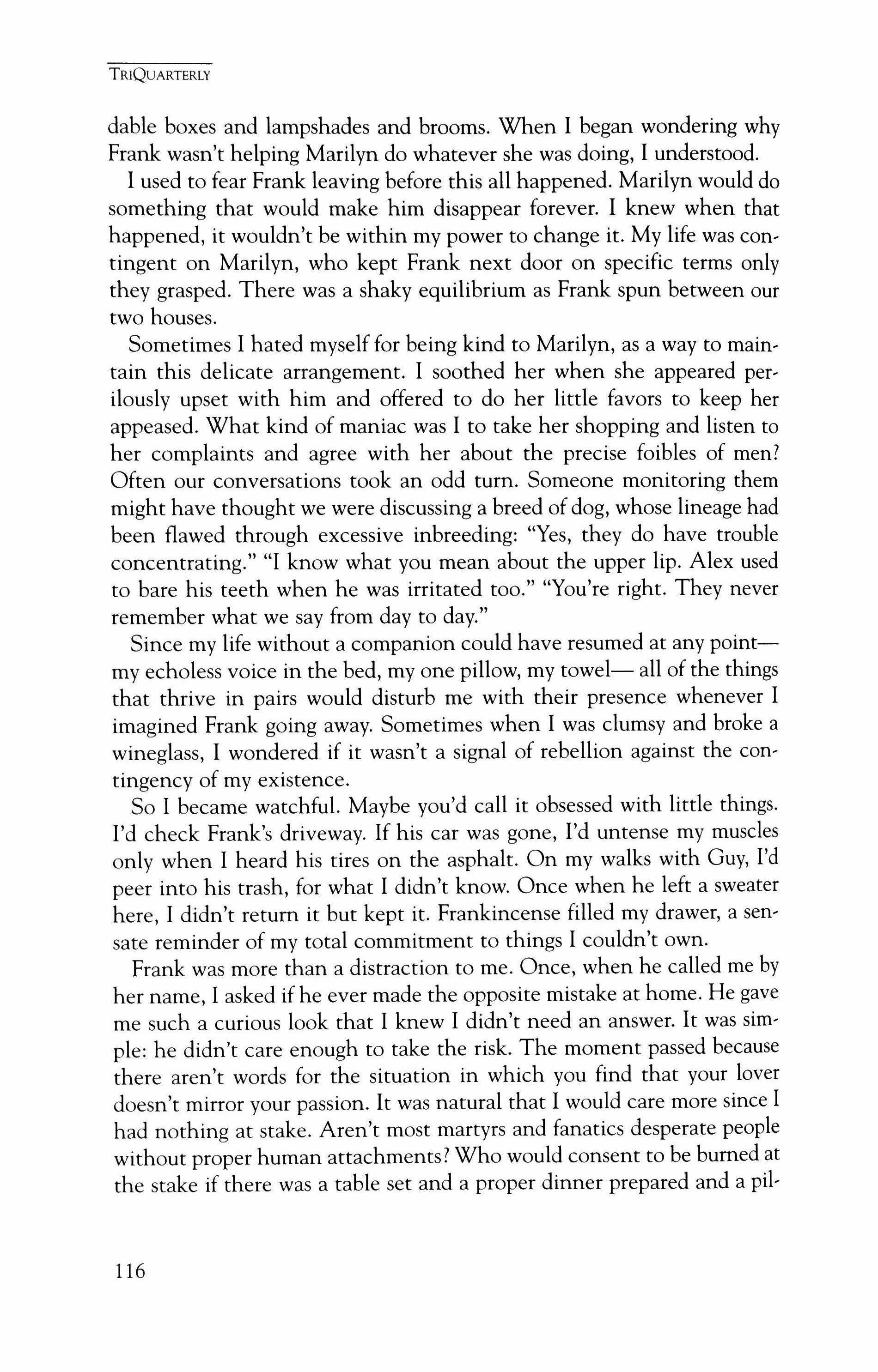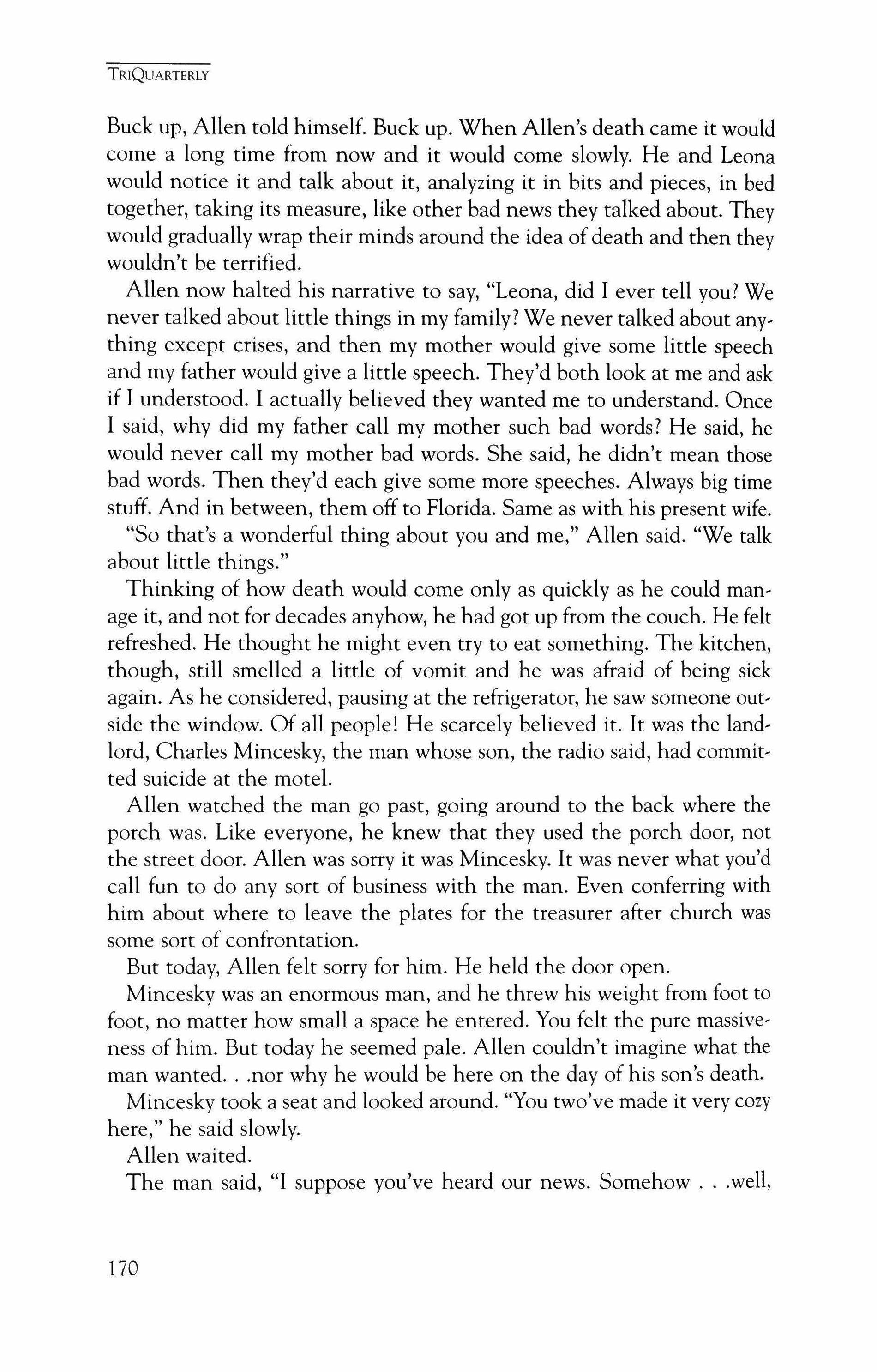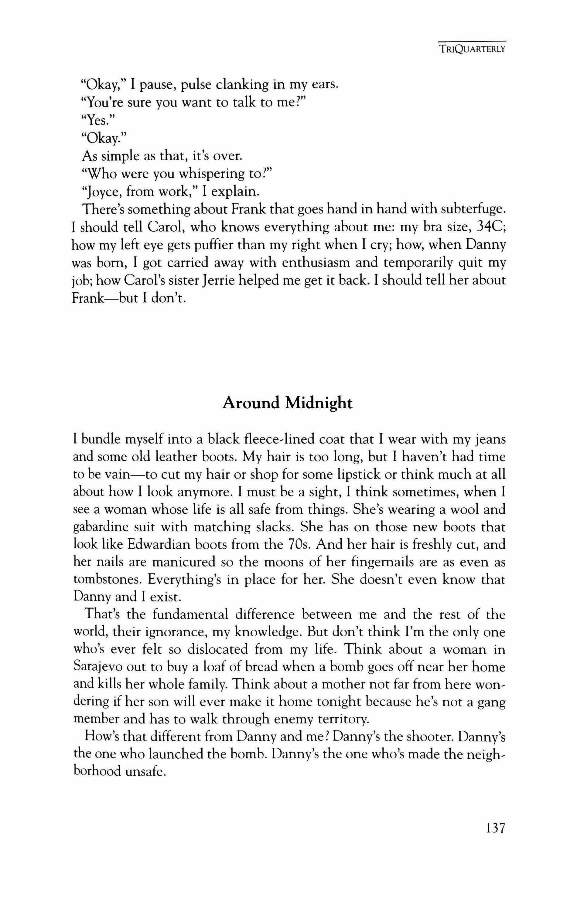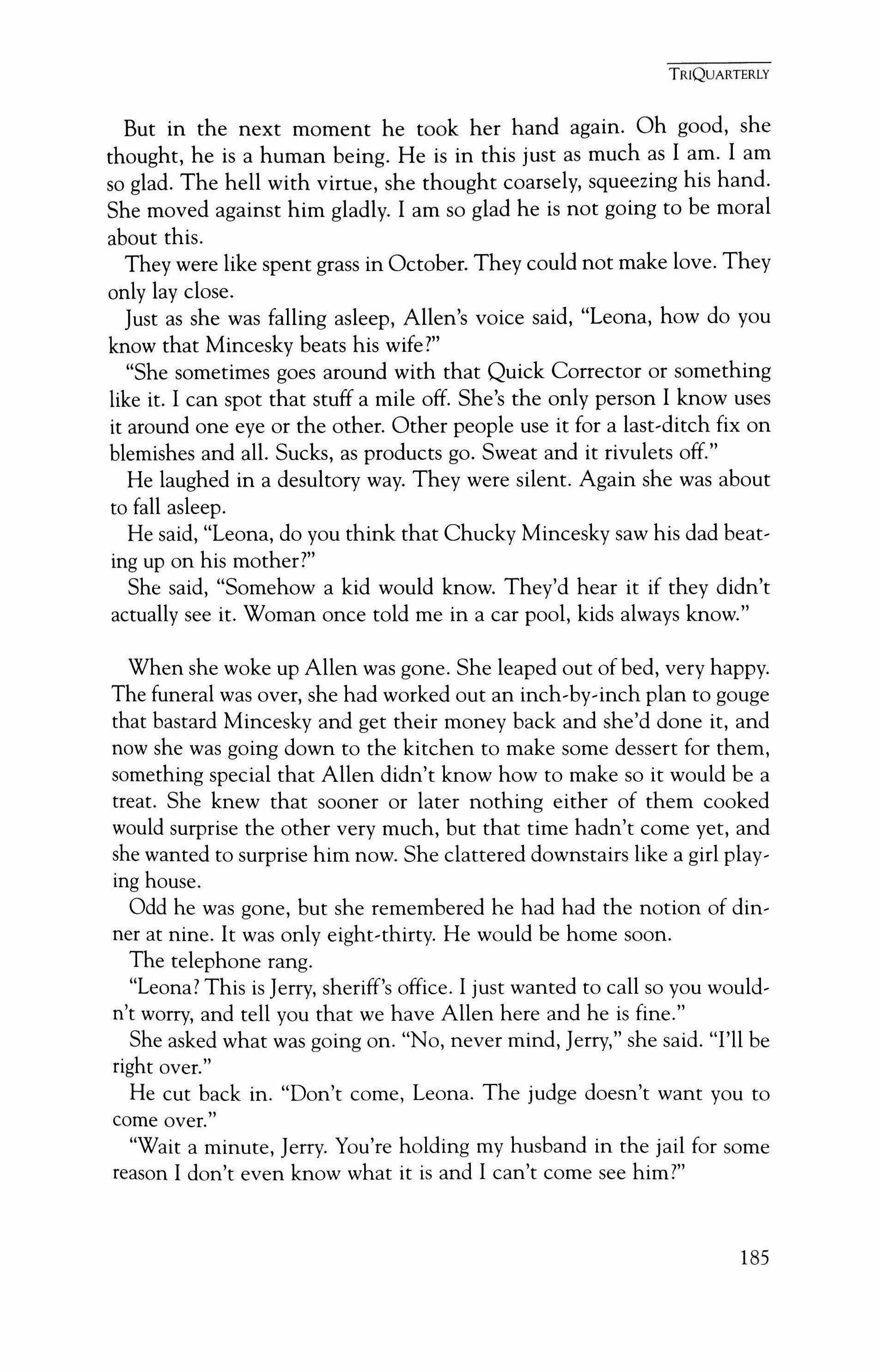 The awnings cast green shadows on the gray concrete. Crossing that green shadow before his door, Tommy felt the day's questions slip away. He didn't care if some prisoner starved himself or whether Darby sold his life story three times over. He slipped open the door and wrapped the stillness around himself. Arlette was sleeping, and her sleeping cast a spell of dreaming over the house. From the kitchen faint voices, first a man talking rapidly, then a women laughing. Tommy's skin crawled, but it was just the portable TV perched akimbo on the window sill. The kitchen smelled of apples and cinnamon. Arlette lay on top of the unmade bed in her loose dress with her arms over her head. There were dark circles around her closed eyes.