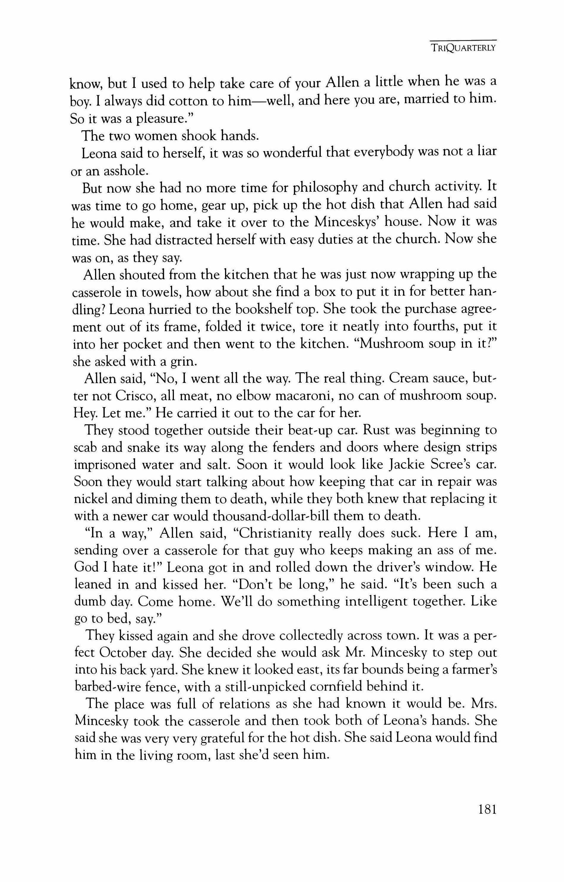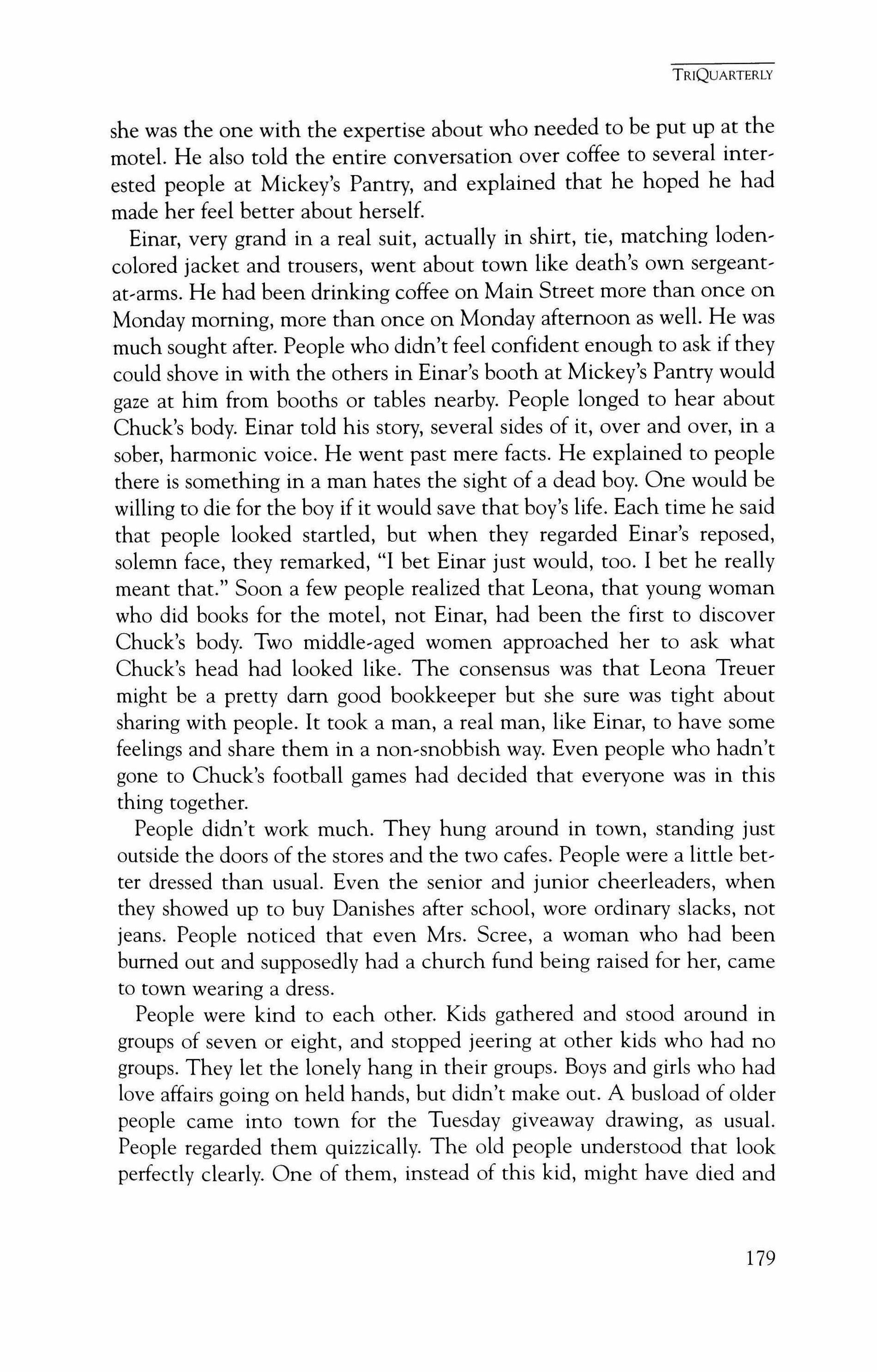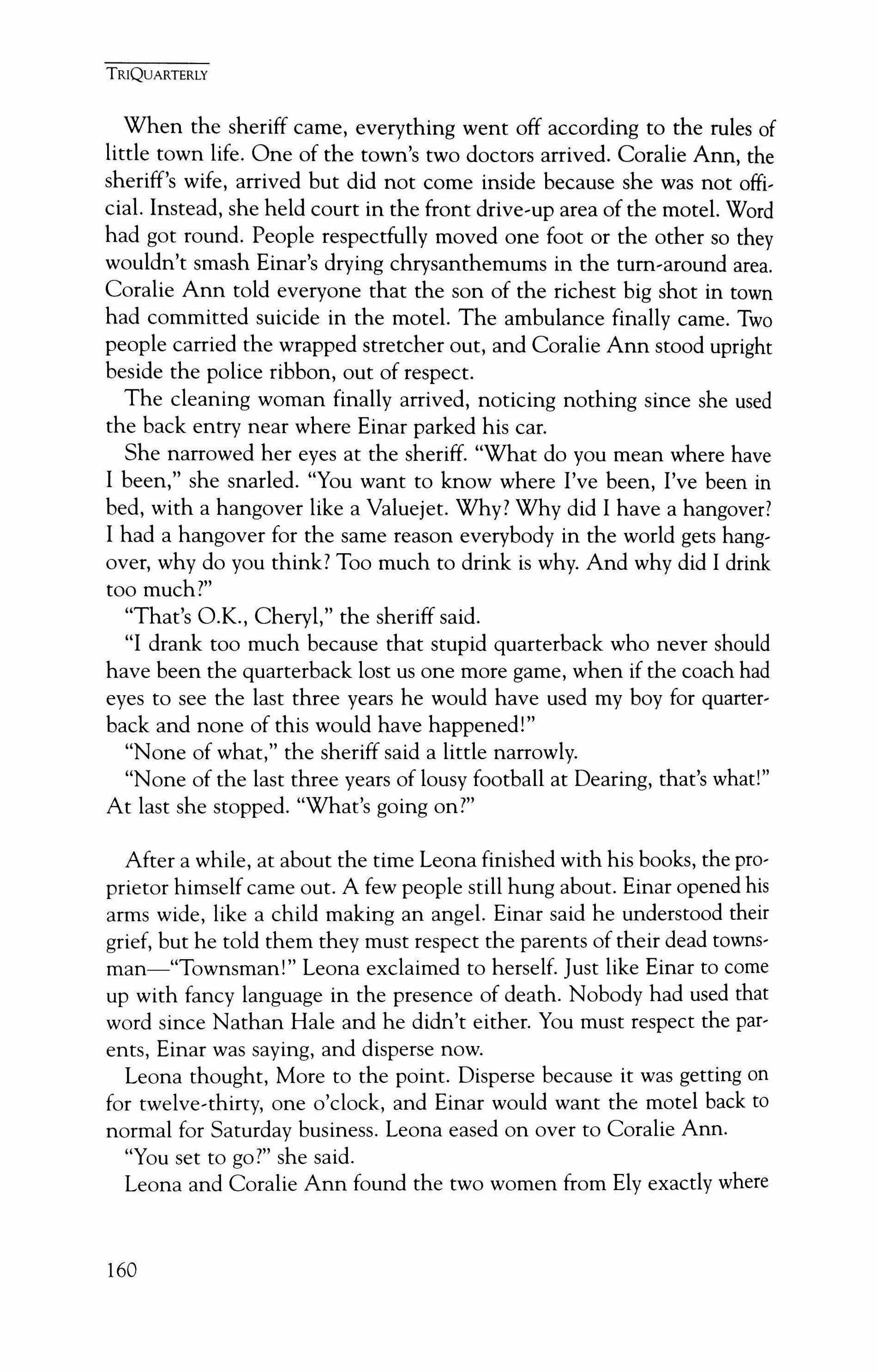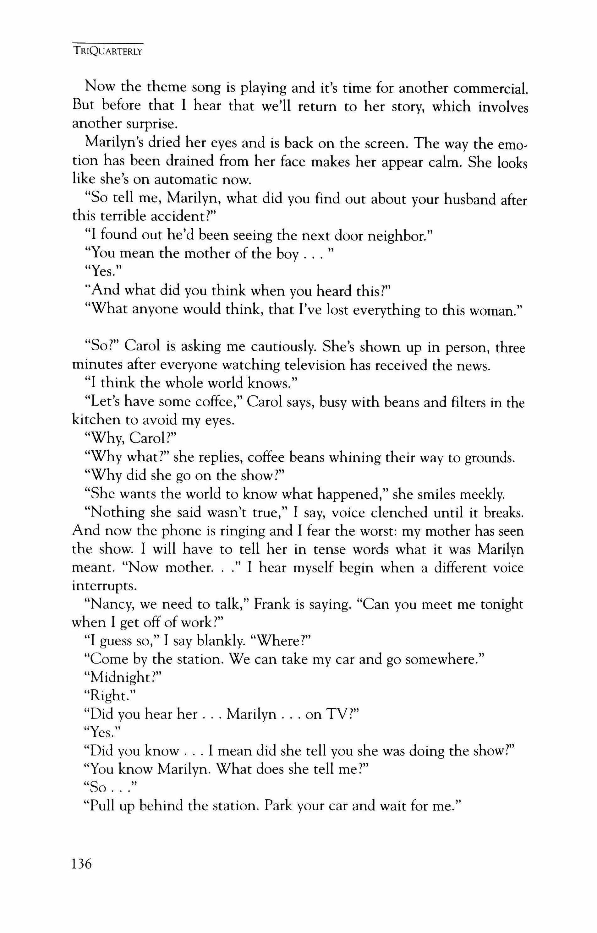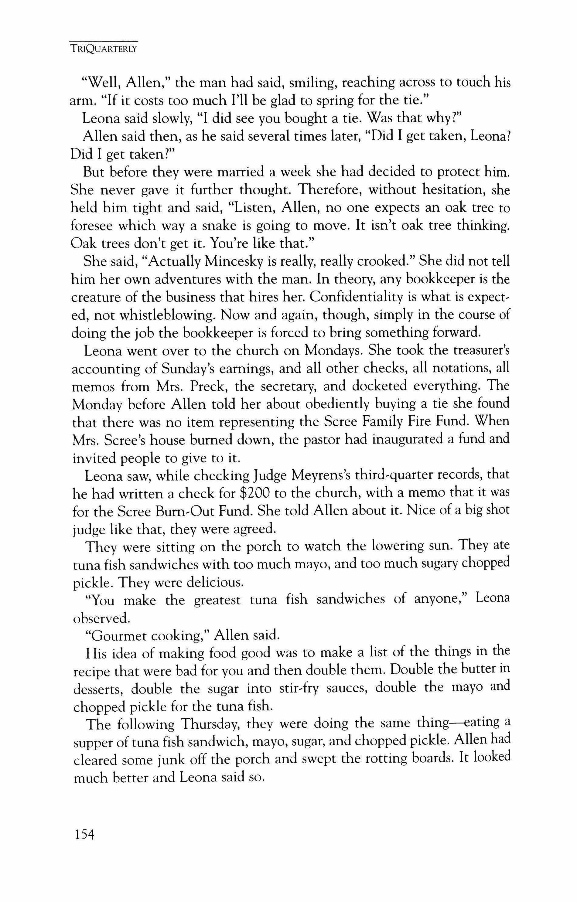 The awnings cast green shadows on the gray concrete. Crossing that green shadow before his door, Tommy felt the day's questions slip away. He didn't care if some prisoner starved himself or whether Darby sold his life story three times over. He slipped open the door and wrapped the stillness around himself. Arlette was sleeping, and her sleeping cast a spell of dreaming over the house. From the kitchen faint voices, first a man talking rapidly, then a women laughing. Tommy's skin crawled, but it was just the portable TV perched akimbo on the window sill. The kitchen smelled of apples and cinnamon. Arlette lay on top of the unmade bed in her loose dress with her arms over her head. There were dark circles around her closed eyes.