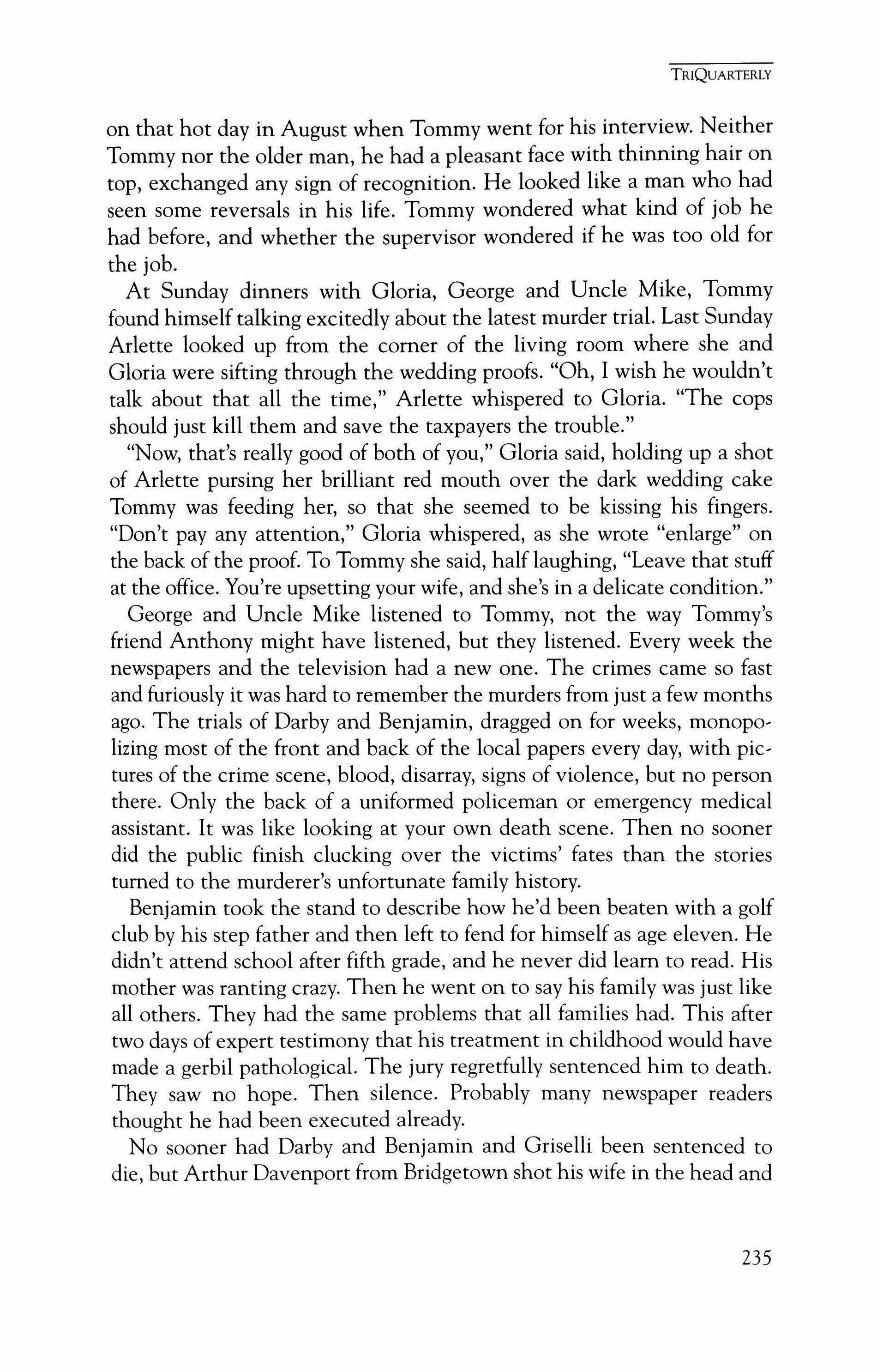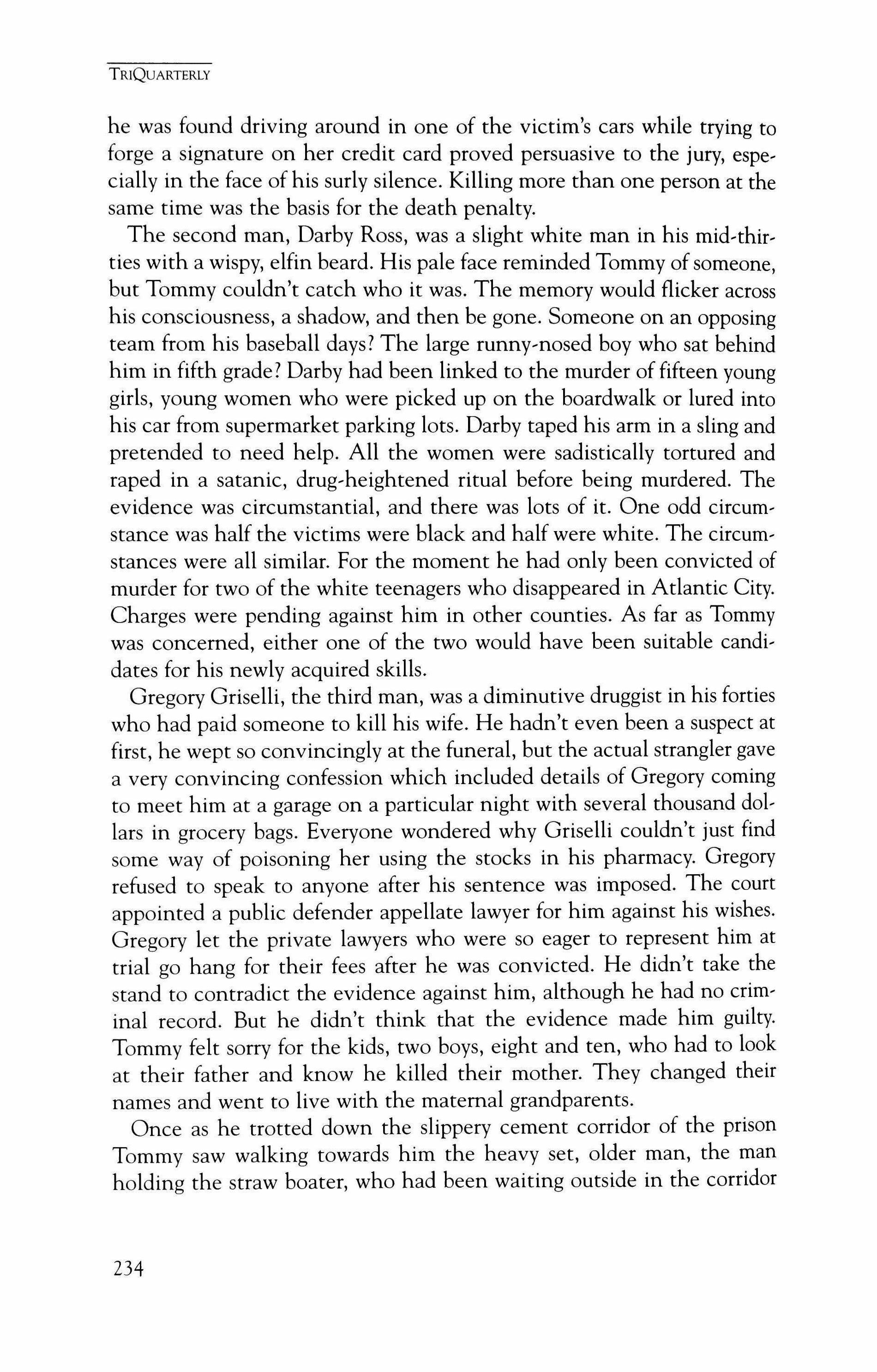 Every Thursday Tommy had to monitor the death row prisoners taking their mandated showers. He stood in his clothes at the edge of the cur, tainless communal shower and watched as Darby, curiously slight but potbellied, vigorously soaped his flopping genitals, lathered the straggly hair under his arms, while occasionally glancing over his shoulder at Tommy. As if to ask, Hey, you never seen a naked man before? Griselli