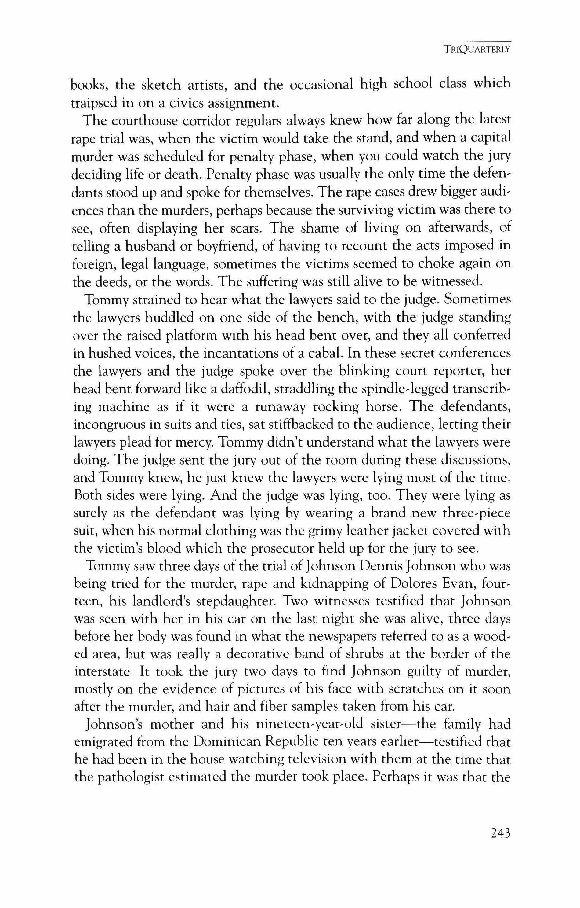 The guards hated courts, judges and lawyers. They talked about the appeals going on and on forever. They said, by the time the feds get around to the new death sentences we'll all be retired. And it was true, wasn't it? The courts seemed to have endless amounts of time for these death cases, but a civil case couldn't get a hearing. The appeals dragged on for years, with the costs multiplying exponentially, as the legal system chased its own tail. Still, Tommy was relieved it was all taking so long. Then it wasn't Tommy's problem, was it? He didn't make the decision. It was his job to run law books from Darby's cell back and forth to the library. It was Tommy's job to write in the daily log book for the CSU every time he brought a book of cases for Darby or delivered a holy message for Benjamin. His entries included the time and place: "delivered law books (three)" or "No.6 shouting, 10 P.M. to 10:45 P.M. January 31. Others yelled at him to shut up."
